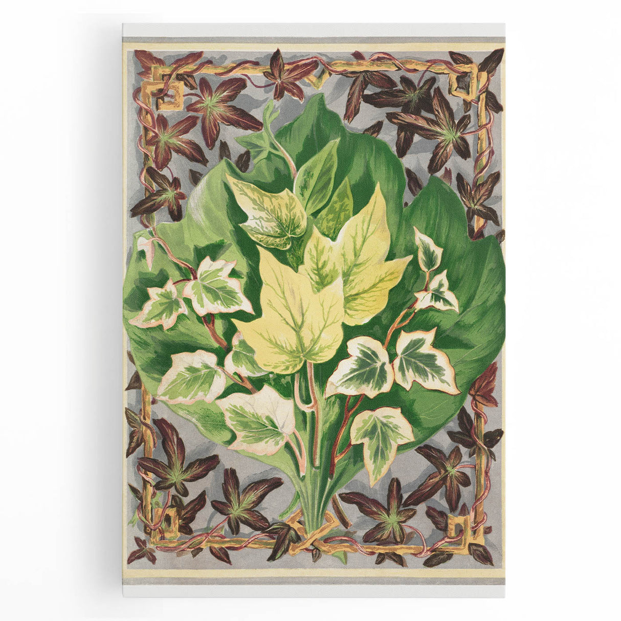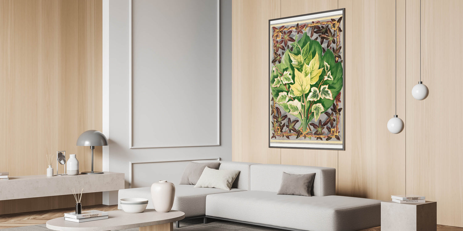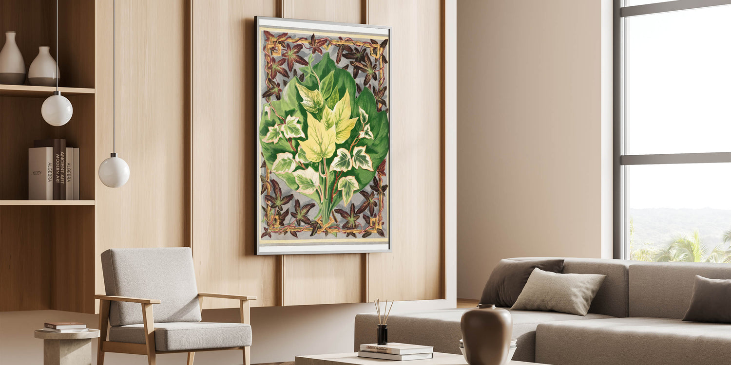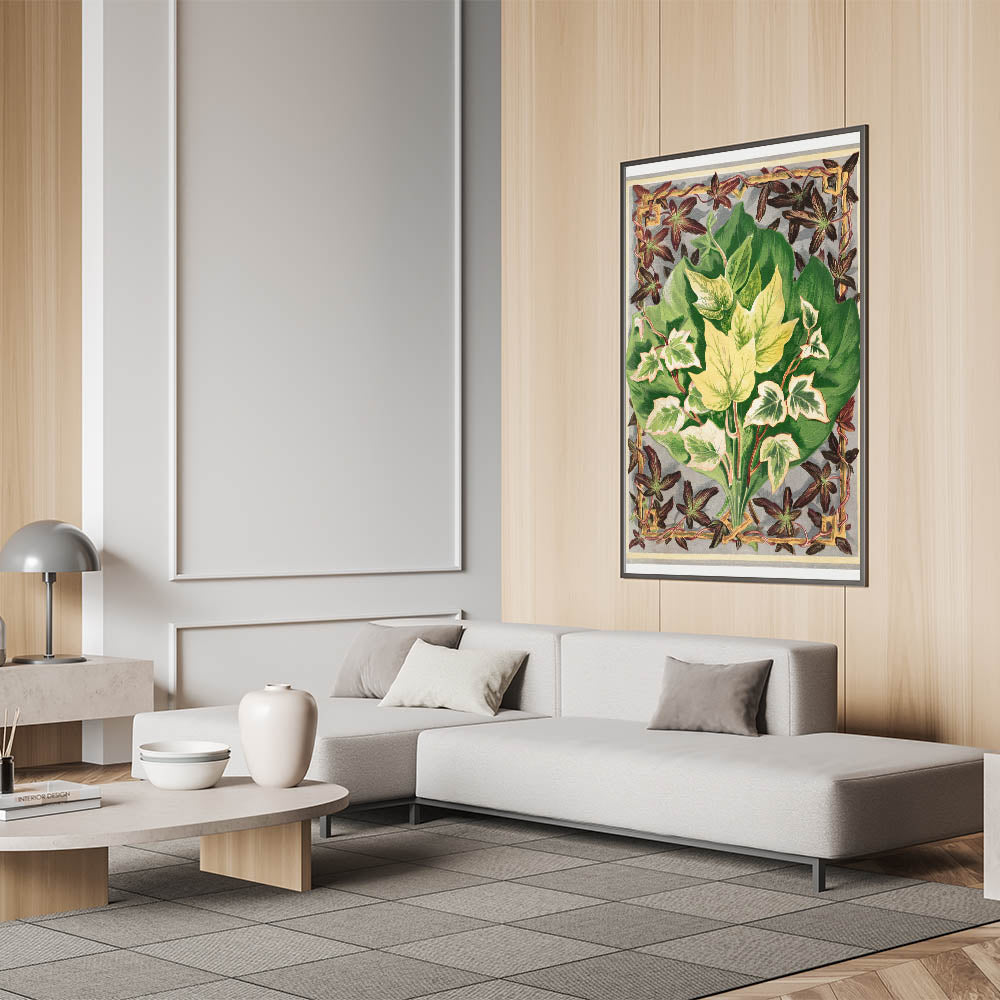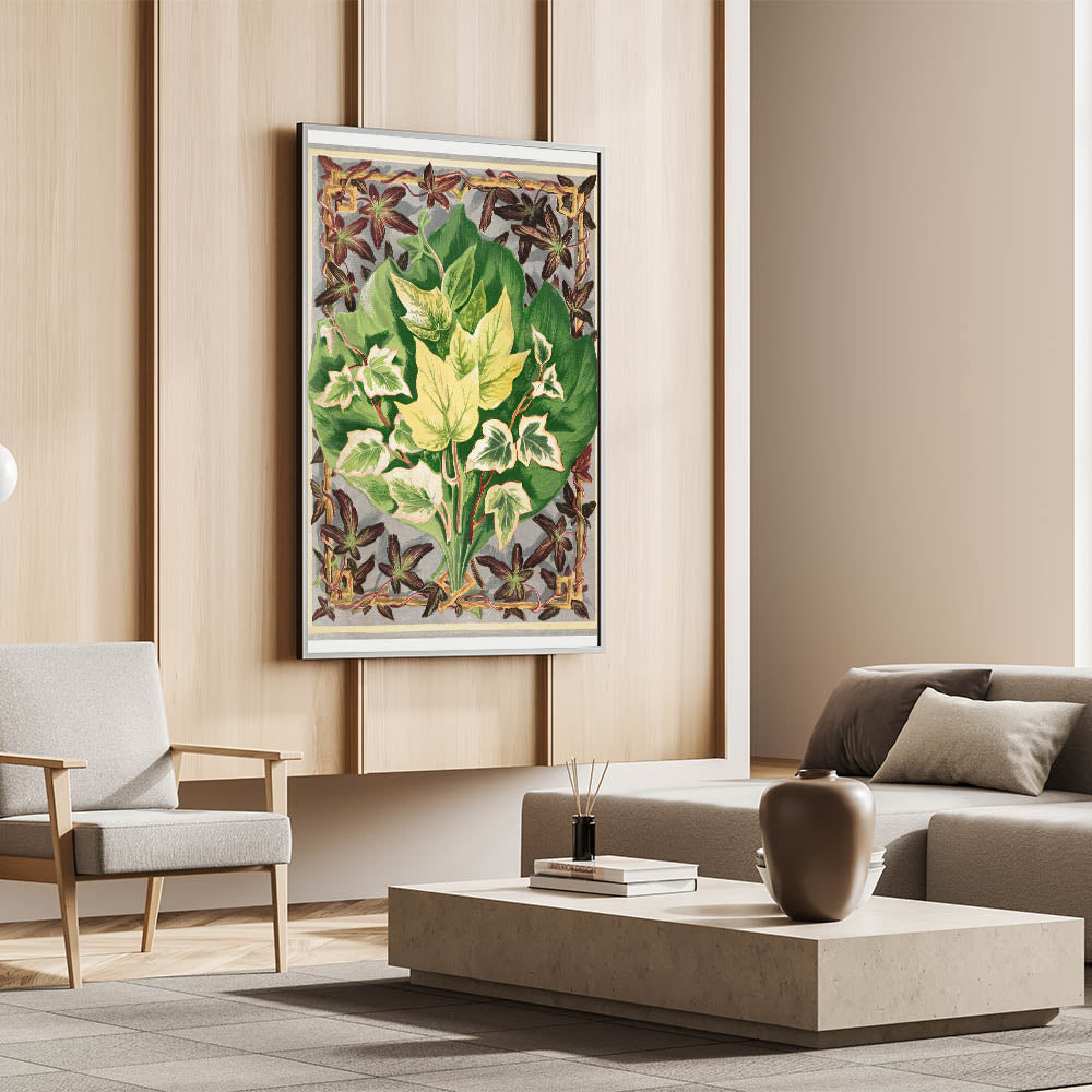 Delve into the intricate world of ivy with this detailed botanical print from The Ivy, a Monograph by Shirley Hibberd. This illustration beautifully captures the diverse forms and vibrant colors of ivy leaves, framed within an elegant decorative border, making it a perfect piece for enthusiasts of botanical art and natural science.