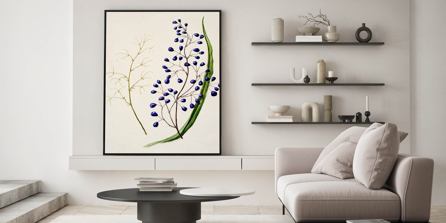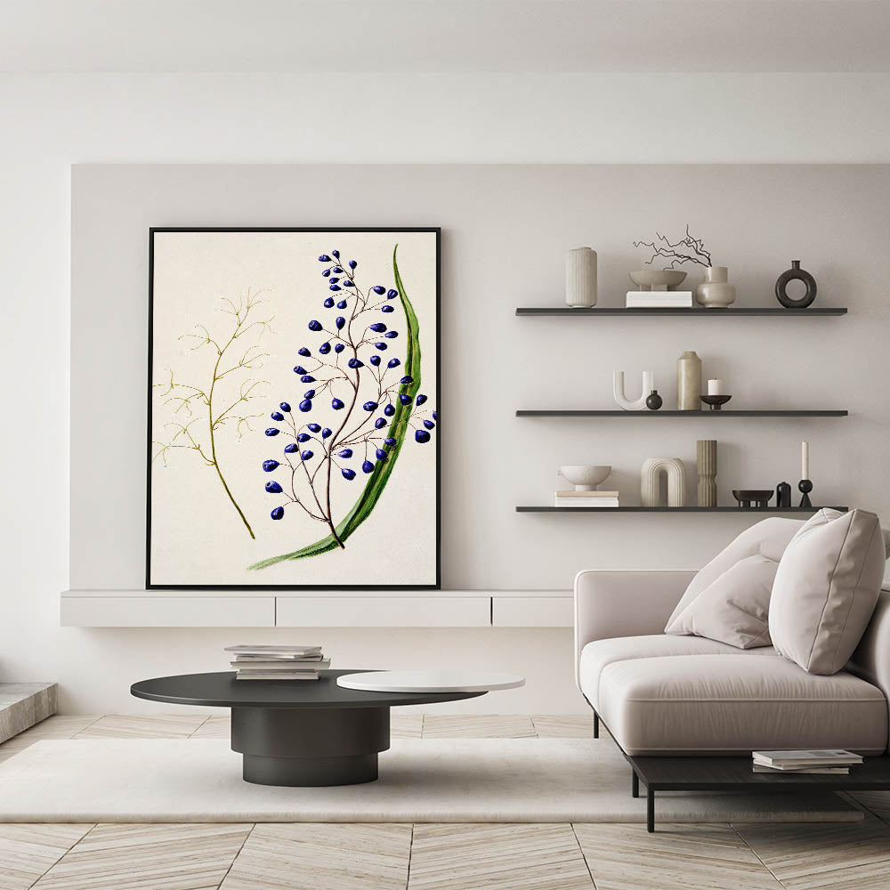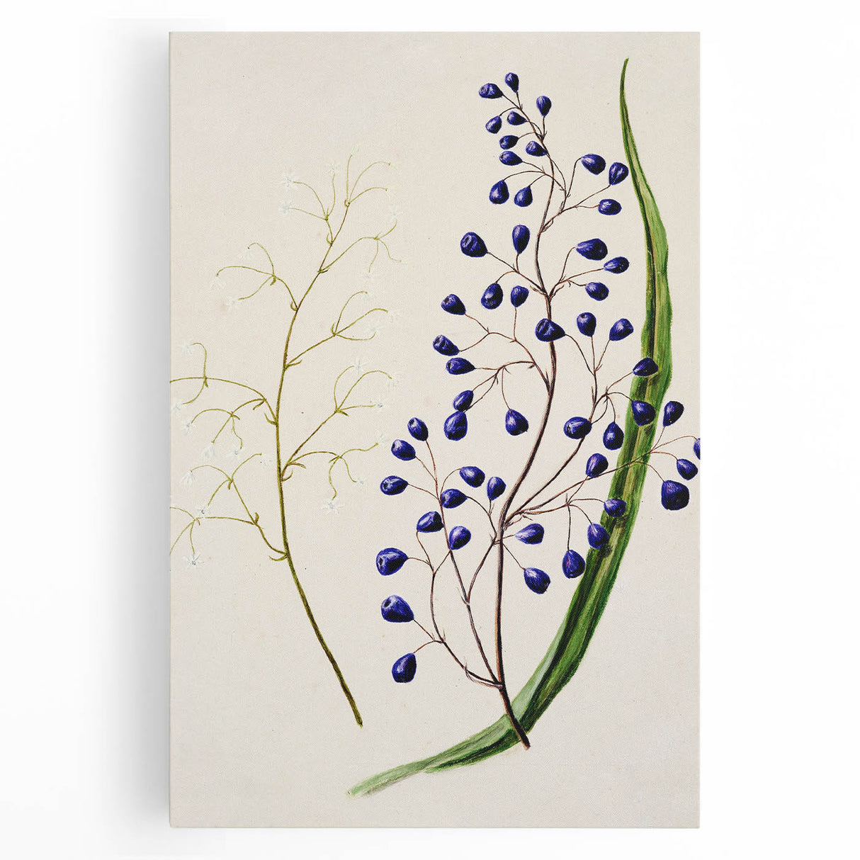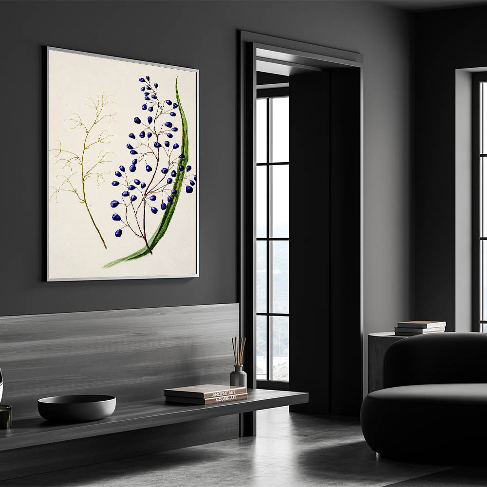 Add a touch of nature’s elegance with our "Botanical Realism Art Print," featuring the delicate and vibrant Ink Plant (Dianella Intermedia) by Sarah Featon. This exquisite illustration captures the rich blue berries and slender leaves with remarkable accuracy, making it a beautiful and educational addition for botanical enthusiasts and art collectors alike.