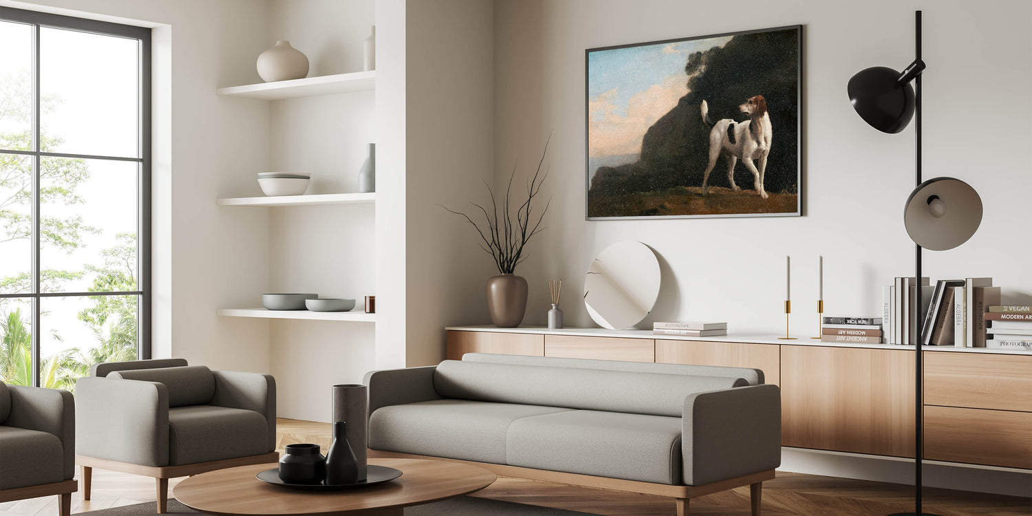 Embrace the timeless elegance of Romanticism with this stunning depiction of a Foxhound by George Stubbs, created in 1760. This exquisite artwork captures the quiet strength and beauty of the dog in a serene natural setting, showcasing the Romantic era's appreciation for animals and landscapes. Perfect for dog lovers and art enthusiasts, this piece adds a sense of history and sophistication to any space.