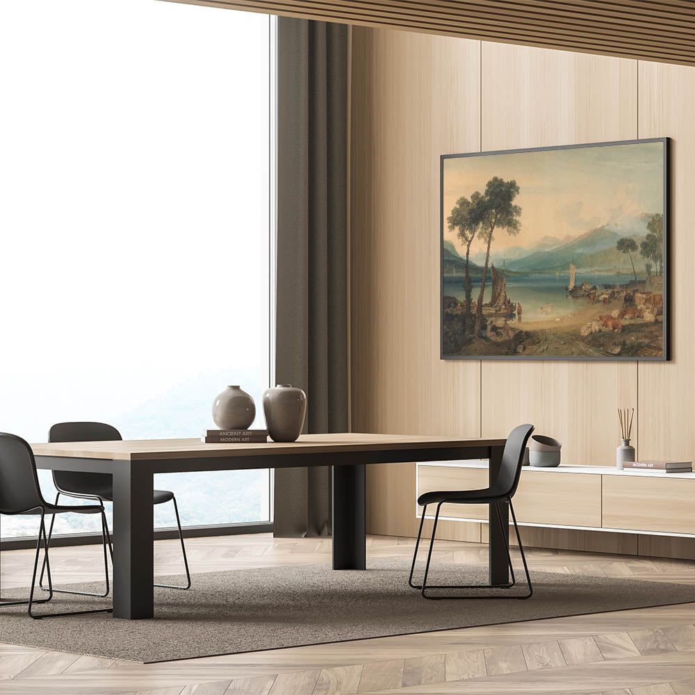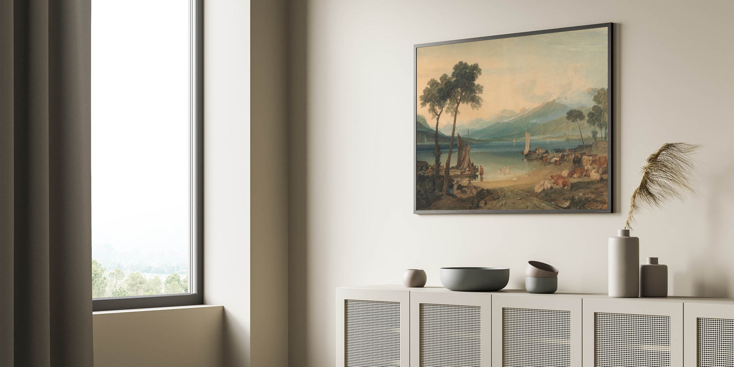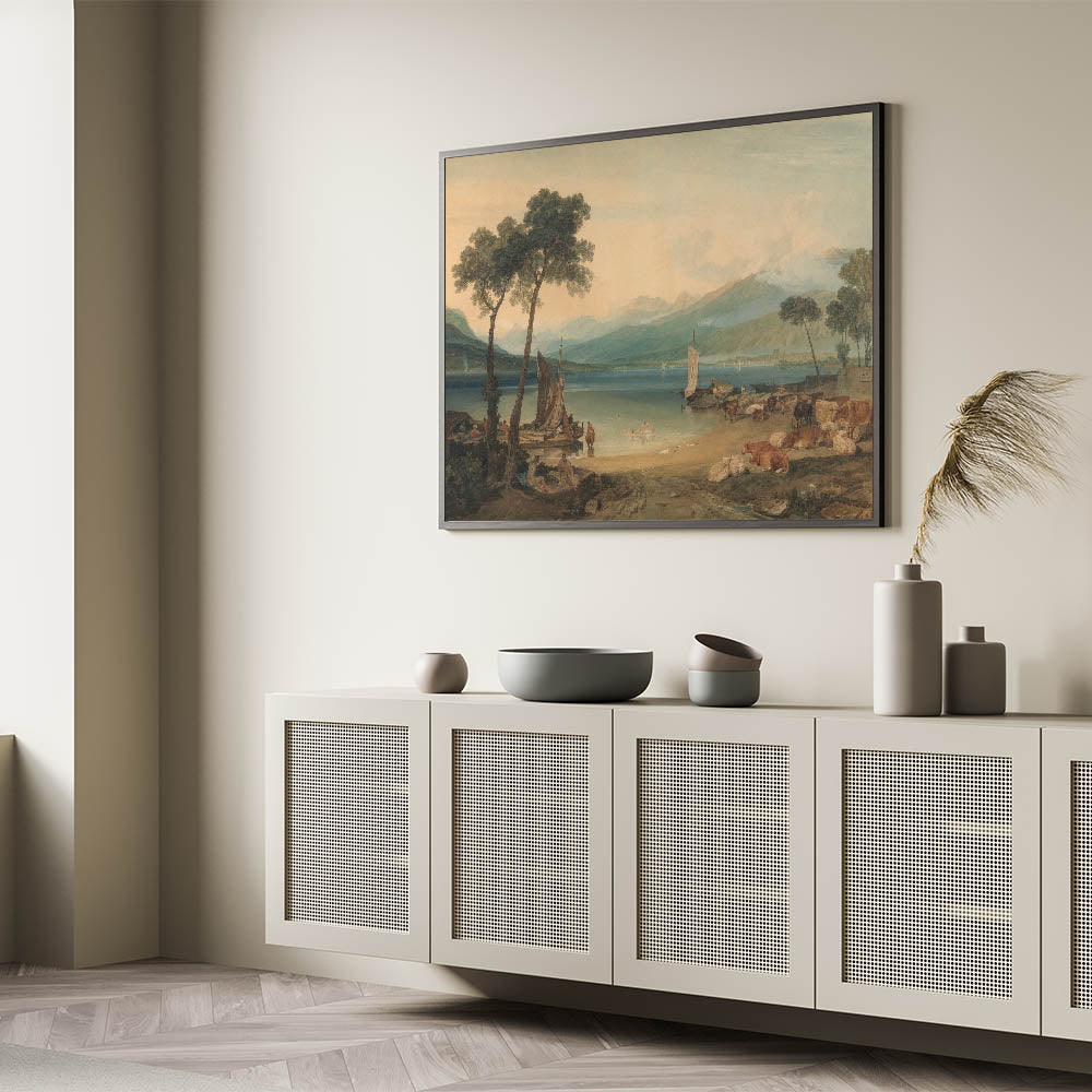 Immerse yourself in the tranquil beauty of "Lake Geneva and Mont Blanc," a masterpiece inspired by the Romantic era. This breathtaking artwork features a serene lakeside view framed by lush trees, distant sailboats, and majestic mountains. The soothing palette of soft blues, greens, and earthy tones conveys a sense of peace and connection with nature, embodying the Romanticism style of emotional landscapes. Perfect for art enthusiasts and those who appreciate historic and cultural wall decor, this piece transforms any space into a haven of timeless elegance.