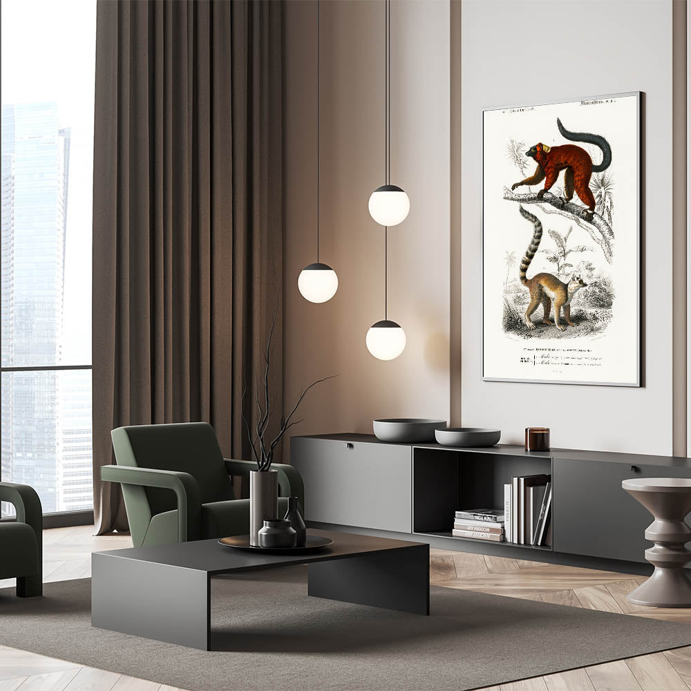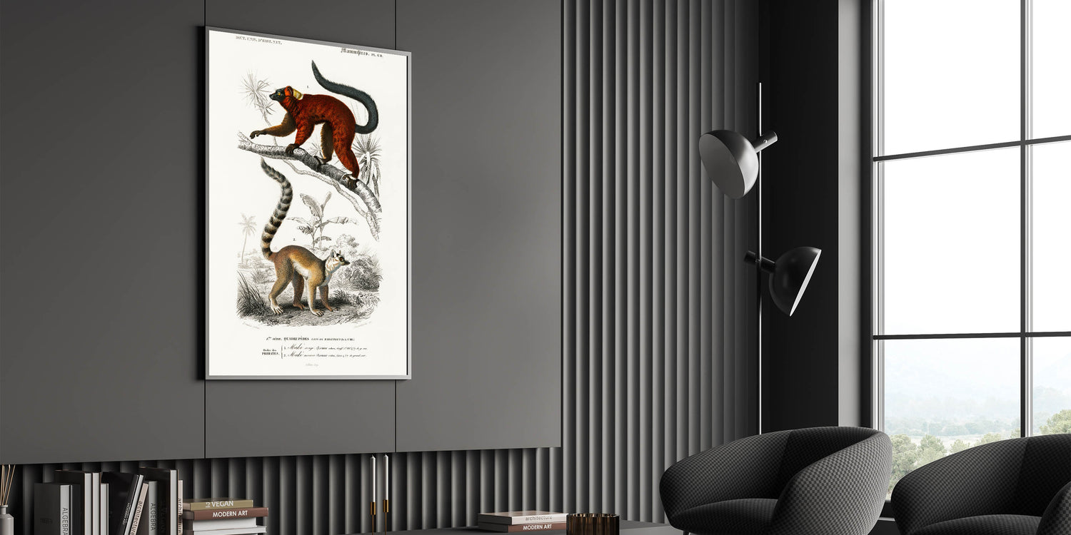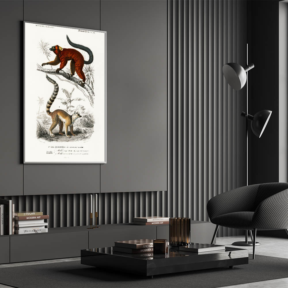 Capture the exotic charm of wildlife with "Lemurs" by Charles Dessalines D'Orbigny. This beautifully detailed Romanticism illustration brings the world of lemurs to life, set amidst lush natural surroundings. The artwork highlights the era’s fascination with nature, offering emotional landscapes and portraits that bring a sense of wonder to your decor.
