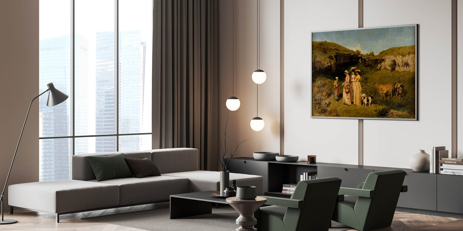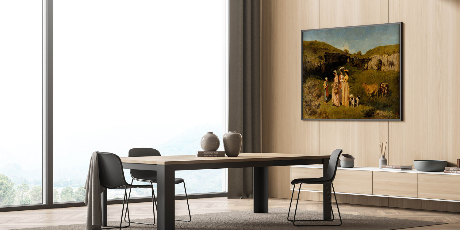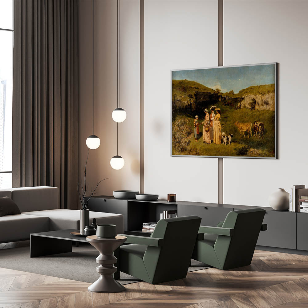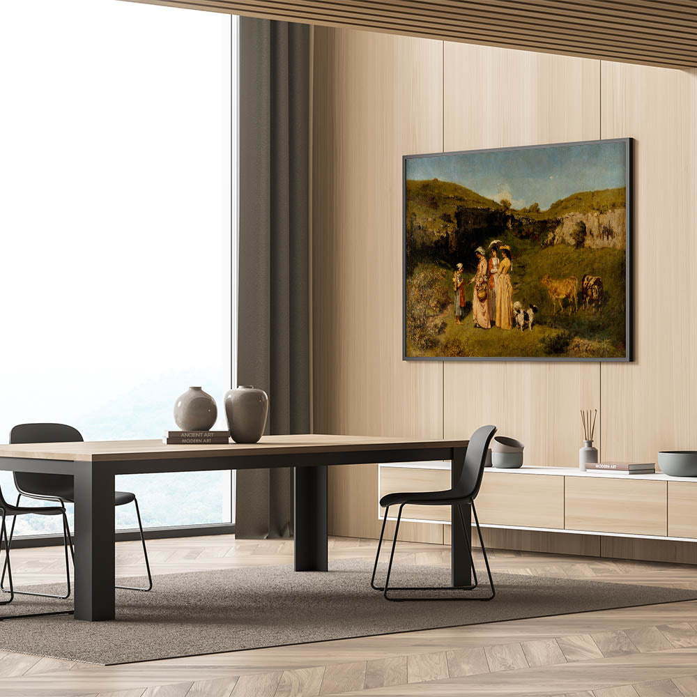 Experience the charm of rural life with "Young Ladies of the Village" by Gustave Courbet. This masterpiece of Realism Art Prints for Home Decor captures an idyllic scene of young ladies in graceful dresses interacting with a young girl in a picturesque countryside setting, complete with cows and rolling green hills. Perfect for lovers of classical art and nature-inspired interiors, this artwork brings a peaceful, pastoral beauty into your home.