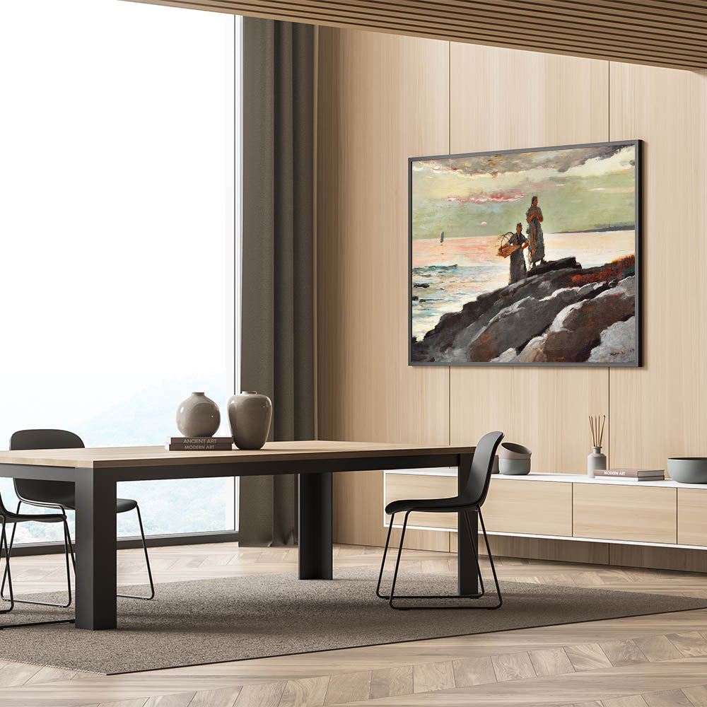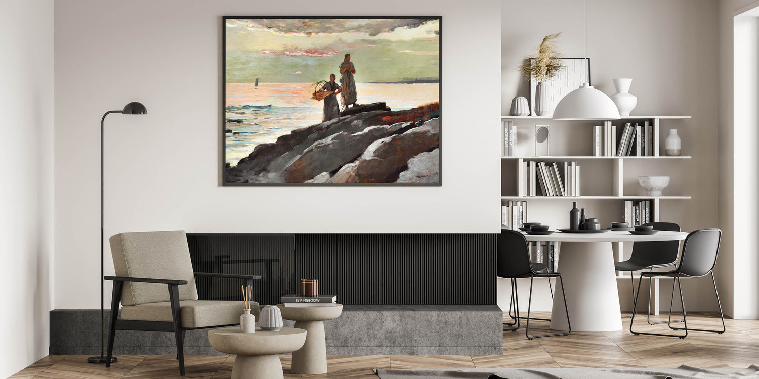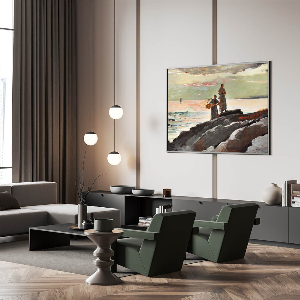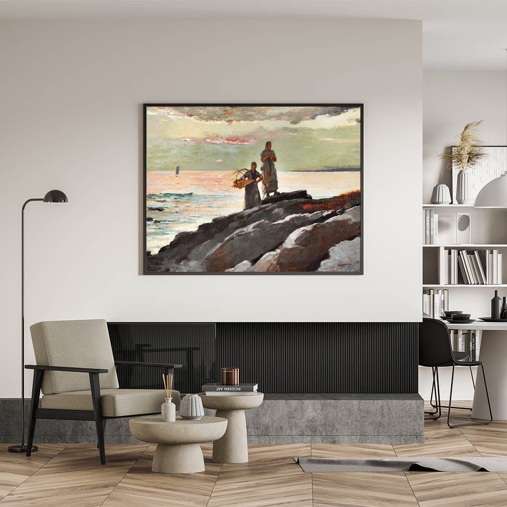 Immerse yourself in the serene beauty of Saco Bay (1896) by Winslow Homer, a compelling coastal scene that captures the quiet moments of life by the sea. This artwork depicts two figures against a backdrop of a soft sunset, highlighting Homer’s mastery in portraying natural light and human interaction with the environment.