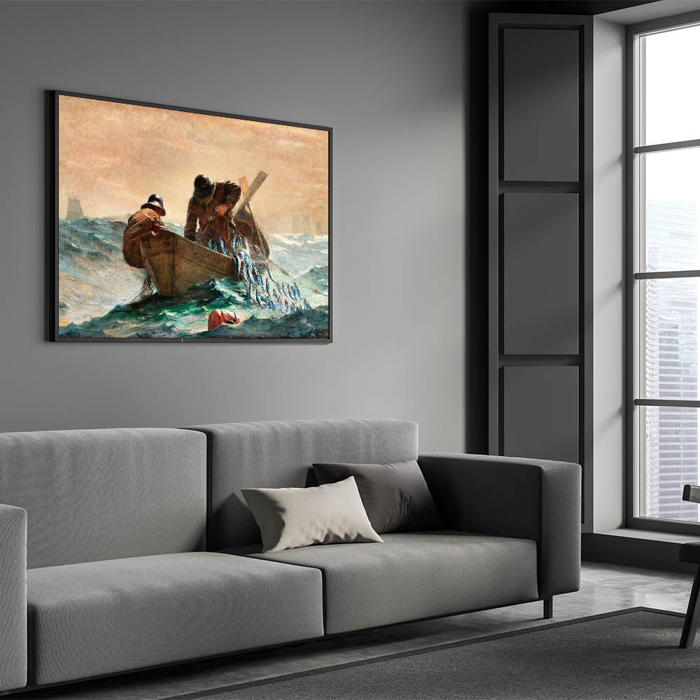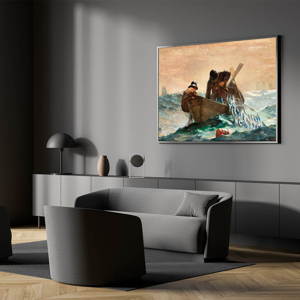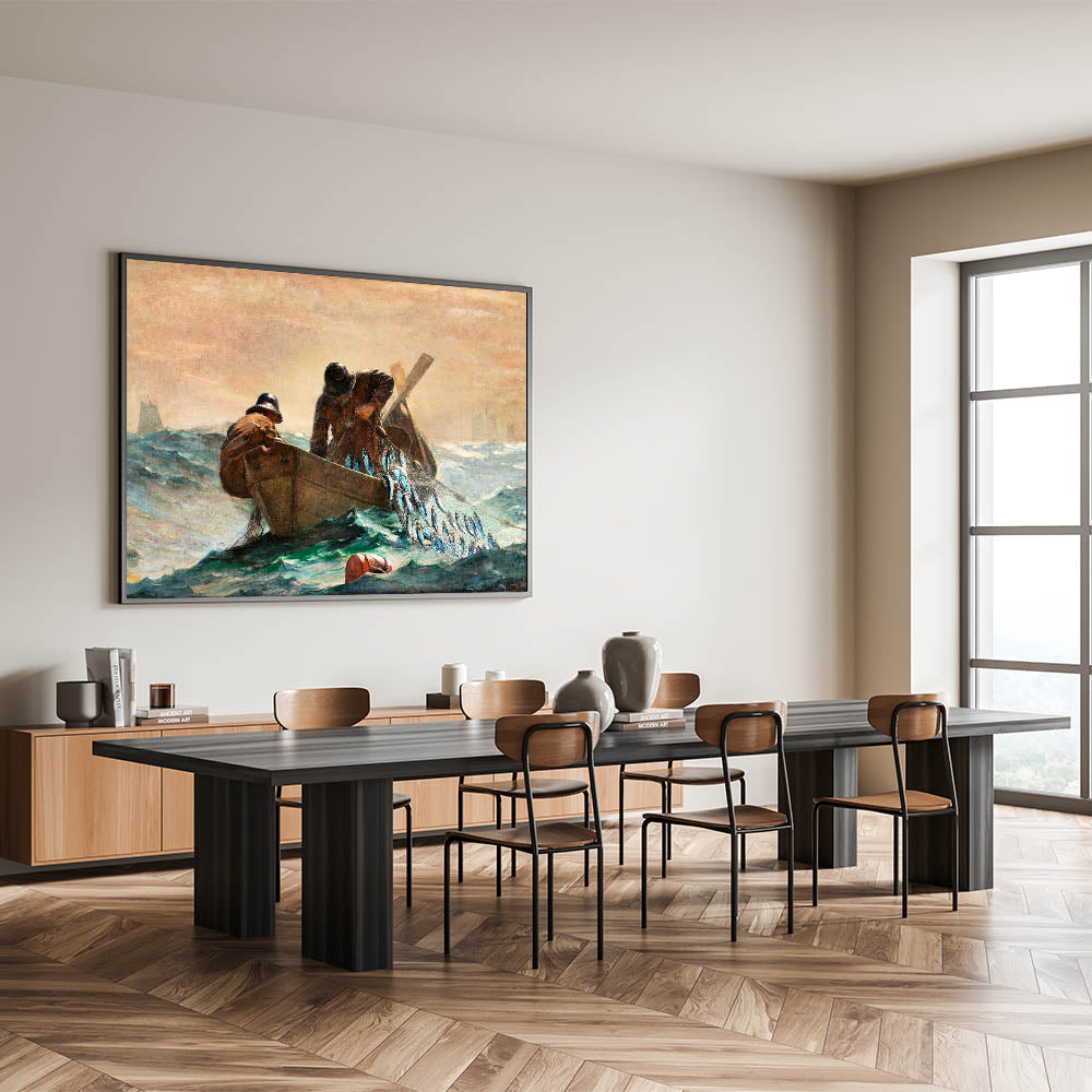 • Powerful Details: Each brushstroke brings to life the movement of the waves, the glistening fish, and the rugged textures of the fishermen’s attire, immersing the viewer in the scene.