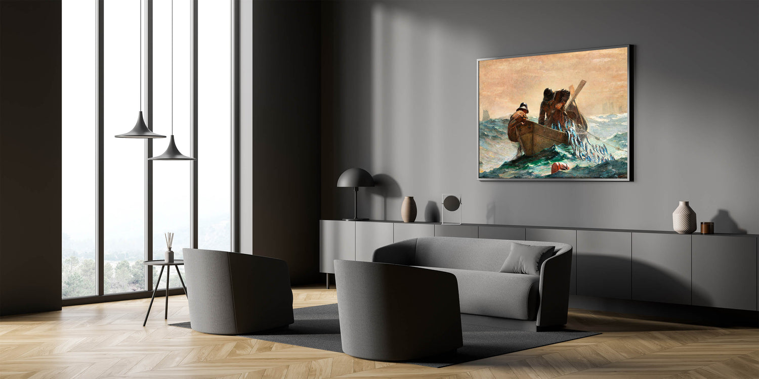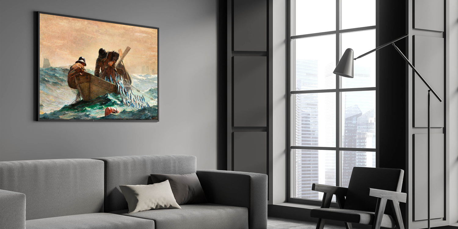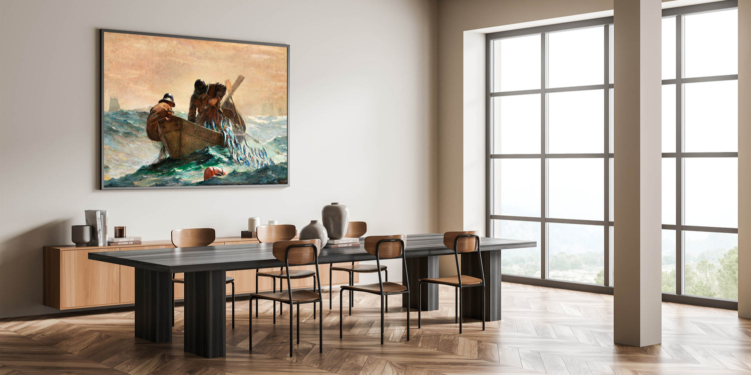• Powerful Details: Each brushstroke brings to life the movement of the waves, the glistening fish, and the rugged textures of the fishermen’s attire, immersing the viewer in the scene.