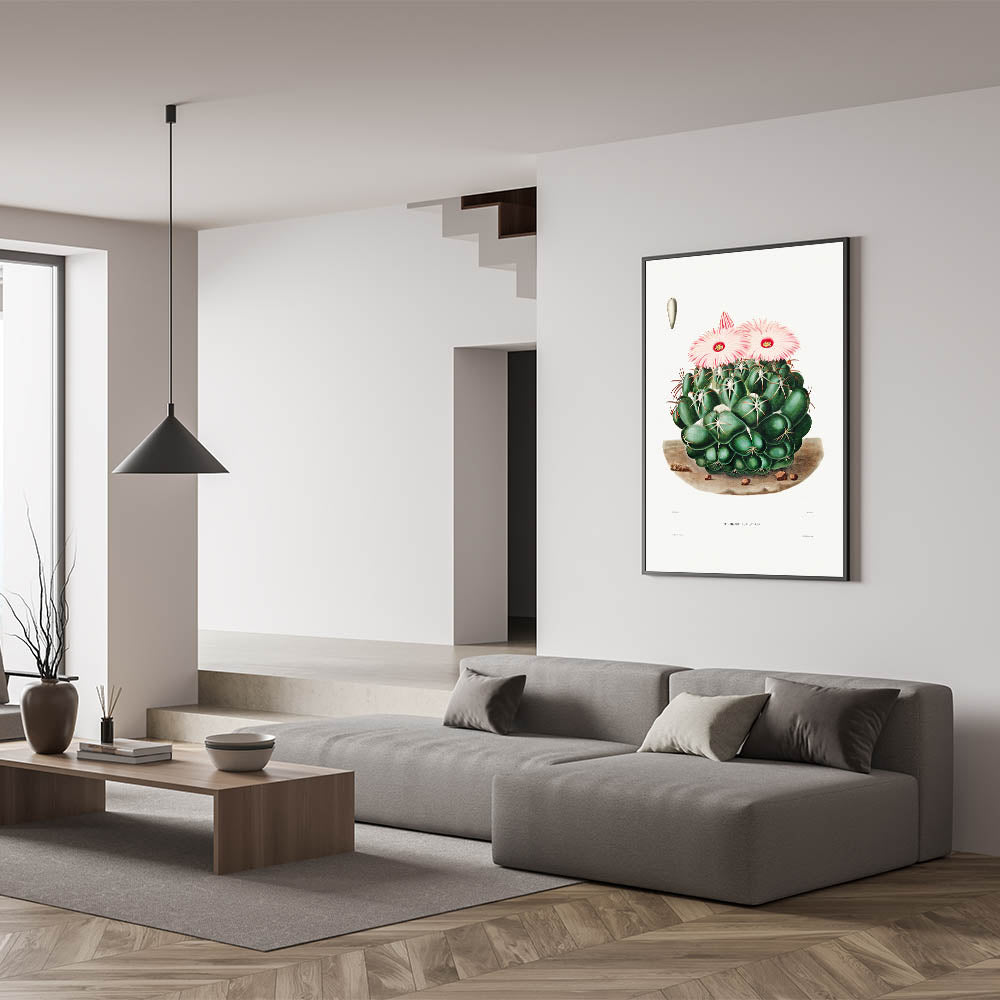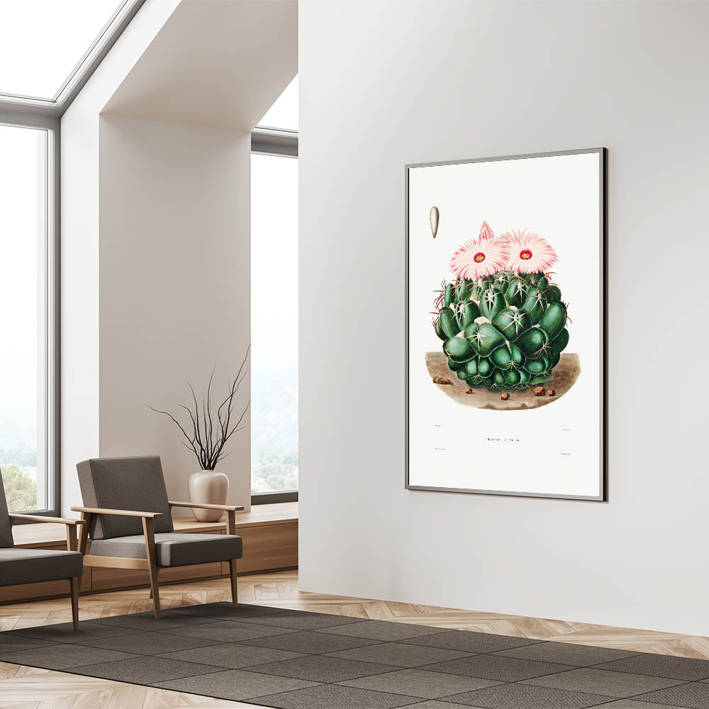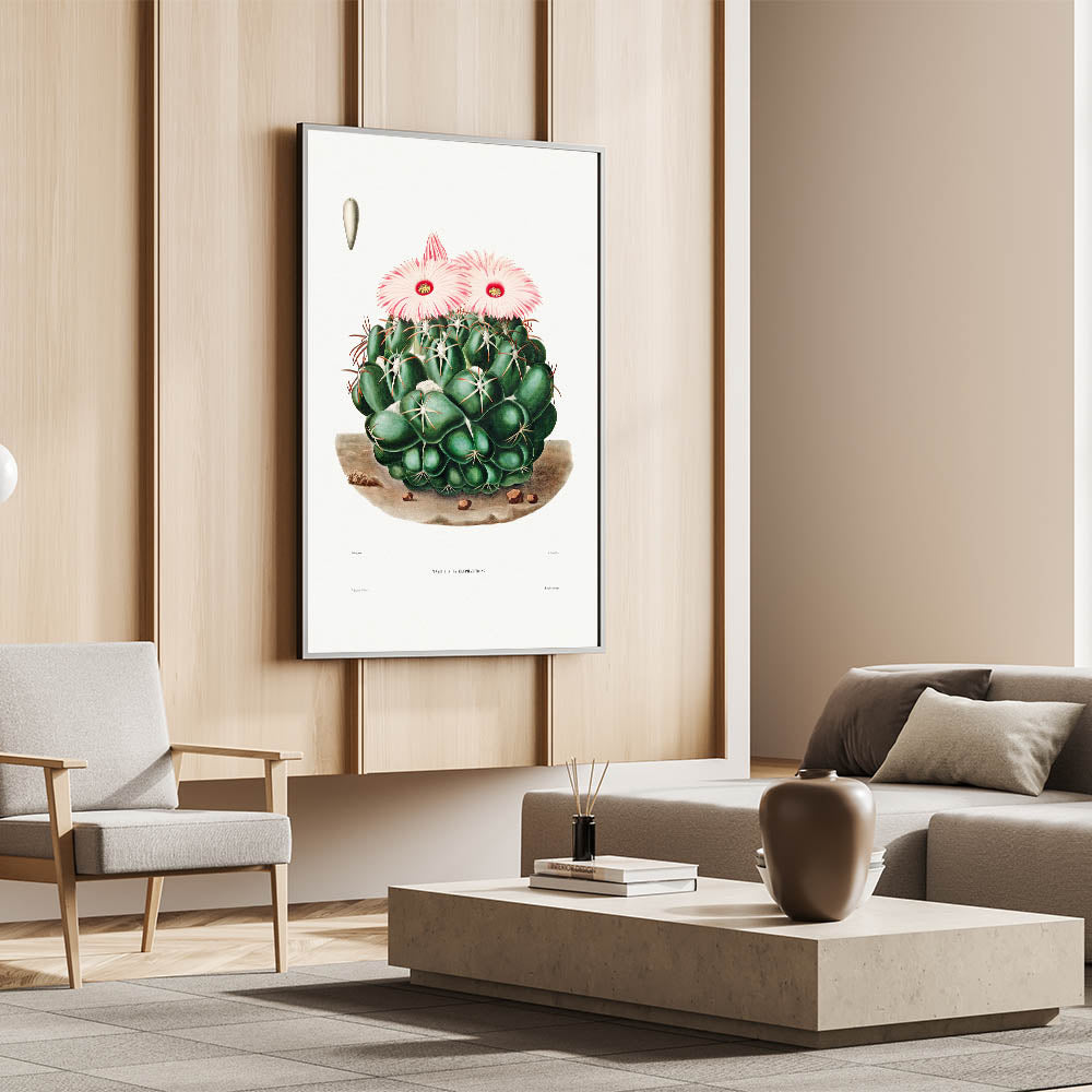Celebrate the captivating allure of Romanticism with this detailed illustration of the Mammillaria Elephantidens cactus, taken from the Iconographie Descriptive des Cactées by Charles-Antoine Lemaire. This artwork embodies the Romanticism style, blending emotional reverence for nature with scientific precision. The lush greens and soft pink blooms evoke a serene yet vibrant presence, making it ideal for historic and cultural wall décor.