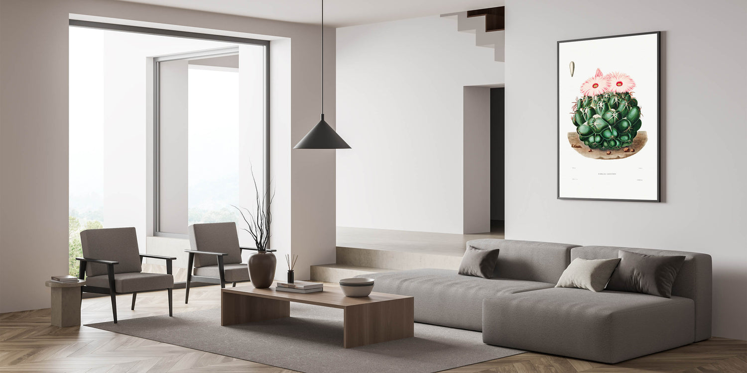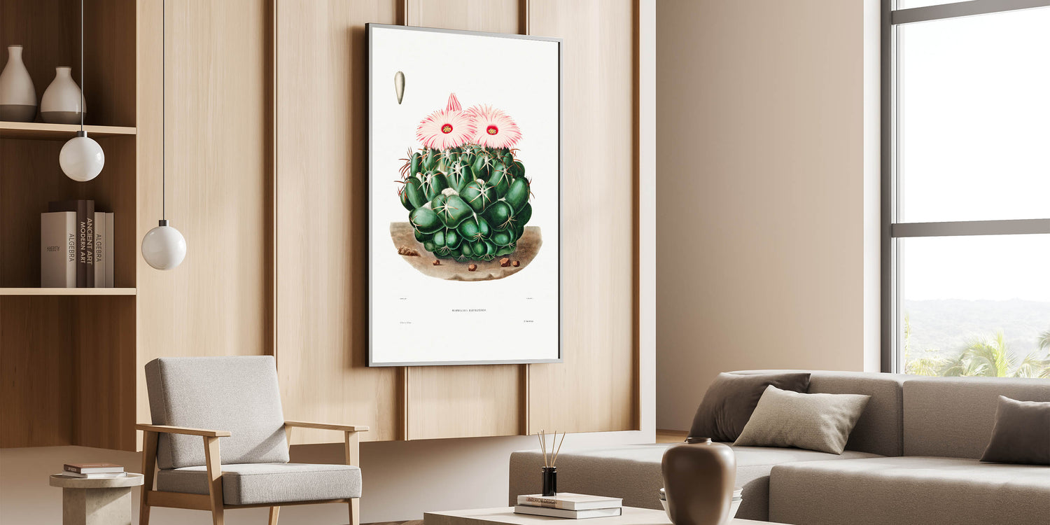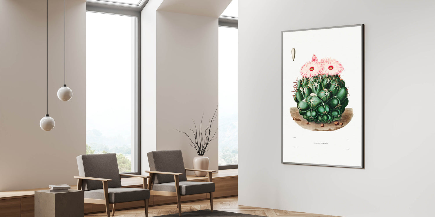 Celebrate the captivating allure of Romanticism with this detailed illustration of the Mammillaria Elephantidens cactus, taken from the Iconographie Descriptive des Cactées by Charles-Antoine Lemaire. This artwork embodies the Romanticism style, blending emotional reverence for nature with scientific precision. The lush greens and soft pink blooms evoke a serene yet vibrant presence, making it ideal for historic and cultural wall décor.