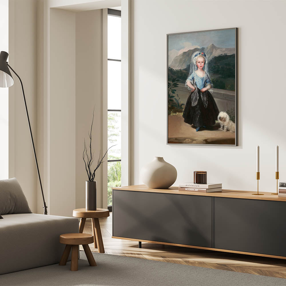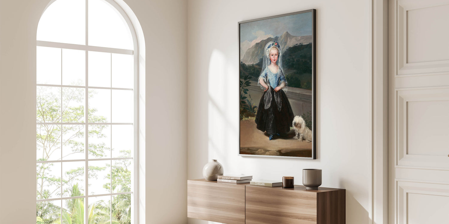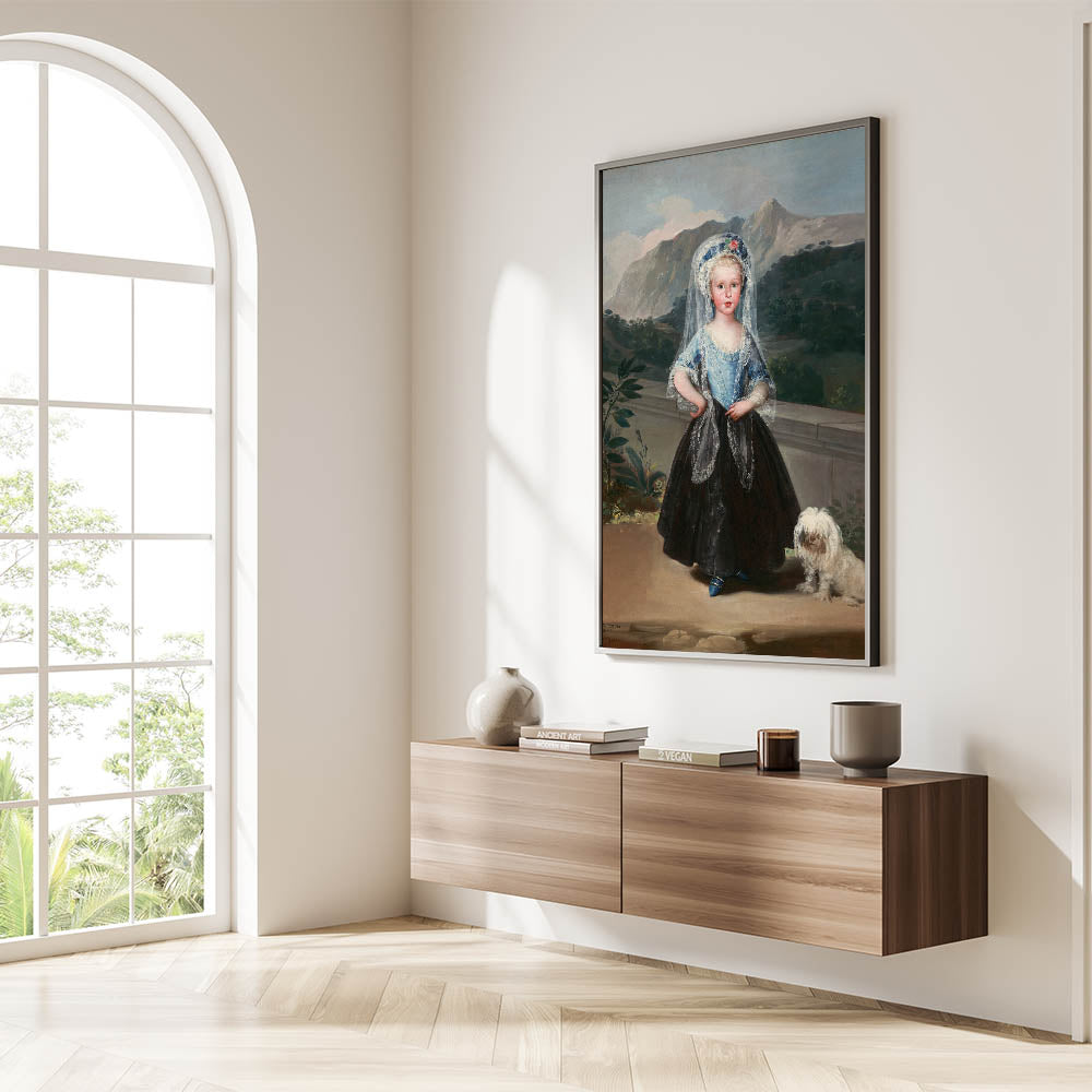 This stunning portrait of María Teresa de Borbón y Vallabriga, painted by Francisco de Goya, is a masterpiece of Romanticism art. The artwork captures the grace and poise of the young countess, standing against a lush mountainous backdrop, with an elegant blend of soft textures and vibrant colors. The attention to detail in her lace-trimmed gown, delicate veil, and the charming inclusion of her small dog evokes a sense of timeless refinement and aristocratic elegance.