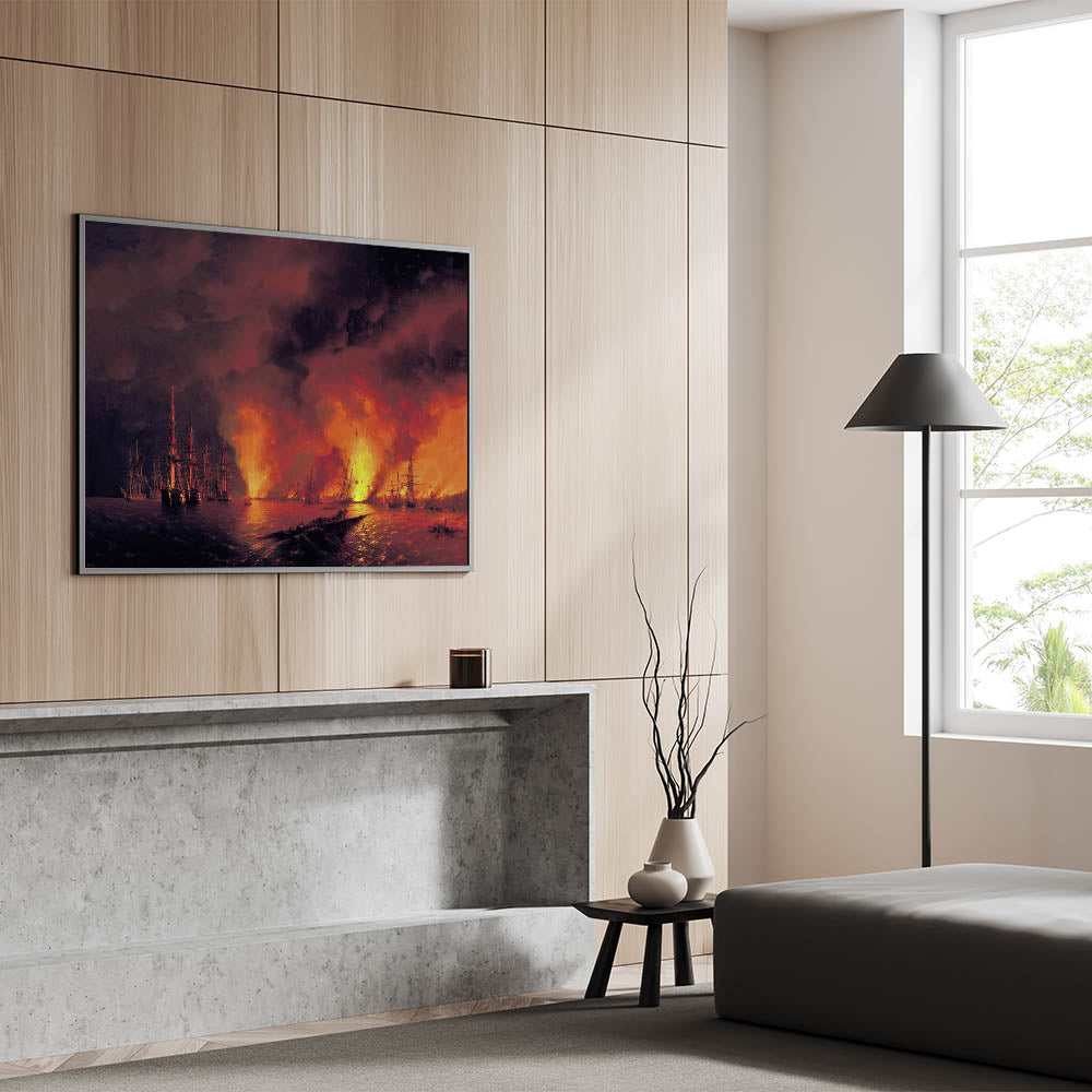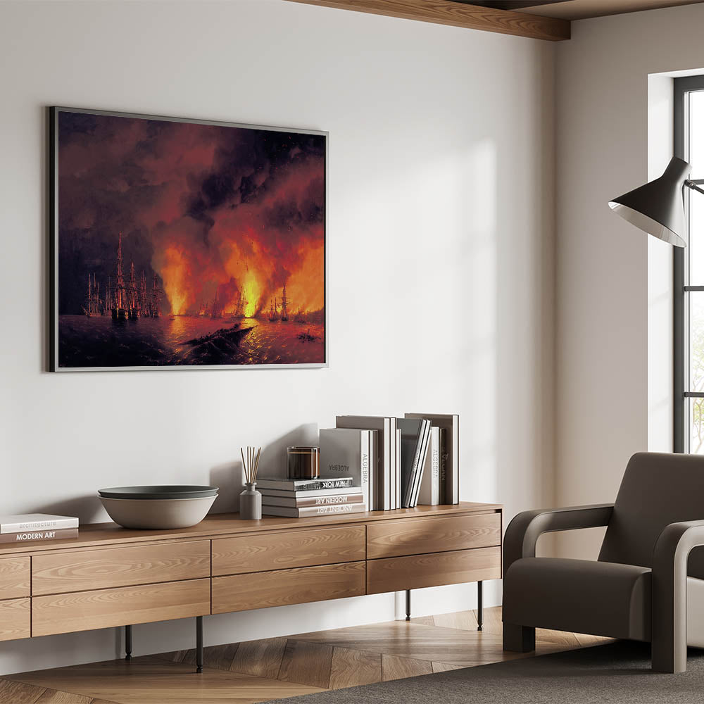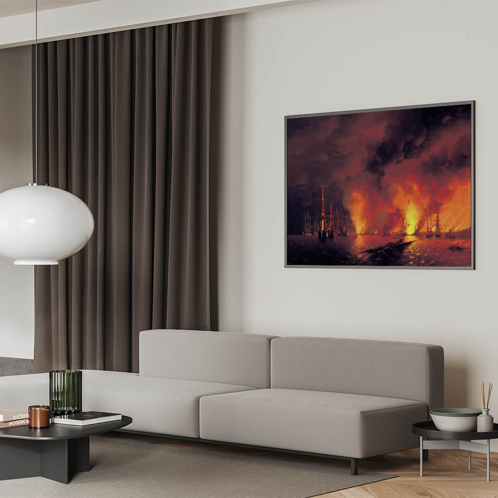 Immerse yourself in the dramatic beauty of The Battle of Sinop, an iconic masterpiece by Ivan Aivazovsky, created in 1853. This stunning artwork captures the fiery aftermath of a historic naval battle, blending the Romantic era's intense emotional expression with breathtaking natural detail. The vivid reds and oranges of the flames against the night sky bring the scene to life, making it a perfect addition for art lovers and history enthusiasts alike.