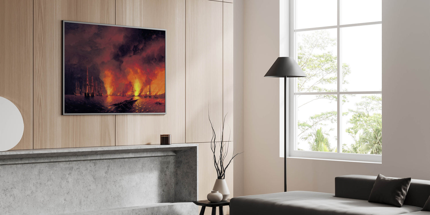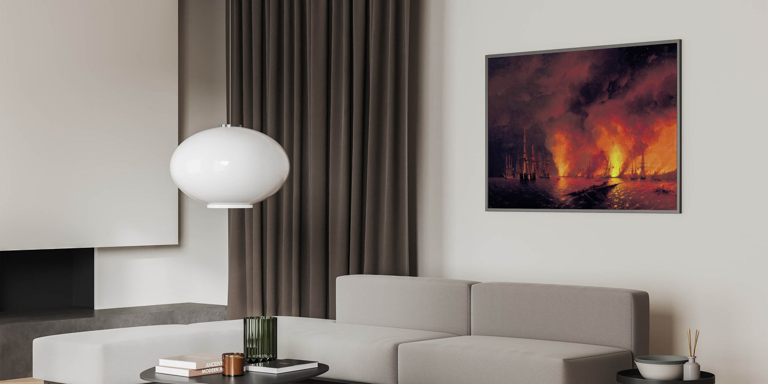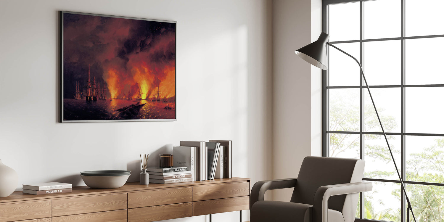 Immerse yourself in the dramatic beauty of The Battle of Sinop, an iconic masterpiece by Ivan Aivazovsky, created in 1853. This stunning artwork captures the fiery aftermath of a historic naval battle, blending the Romantic era's intense emotional expression with breathtaking natural detail. The vivid reds and oranges of the flames against the night sky bring the scene to life, making it a perfect addition for art lovers and history enthusiasts alike.