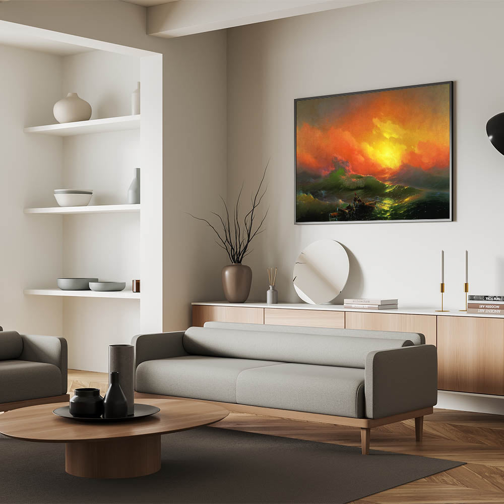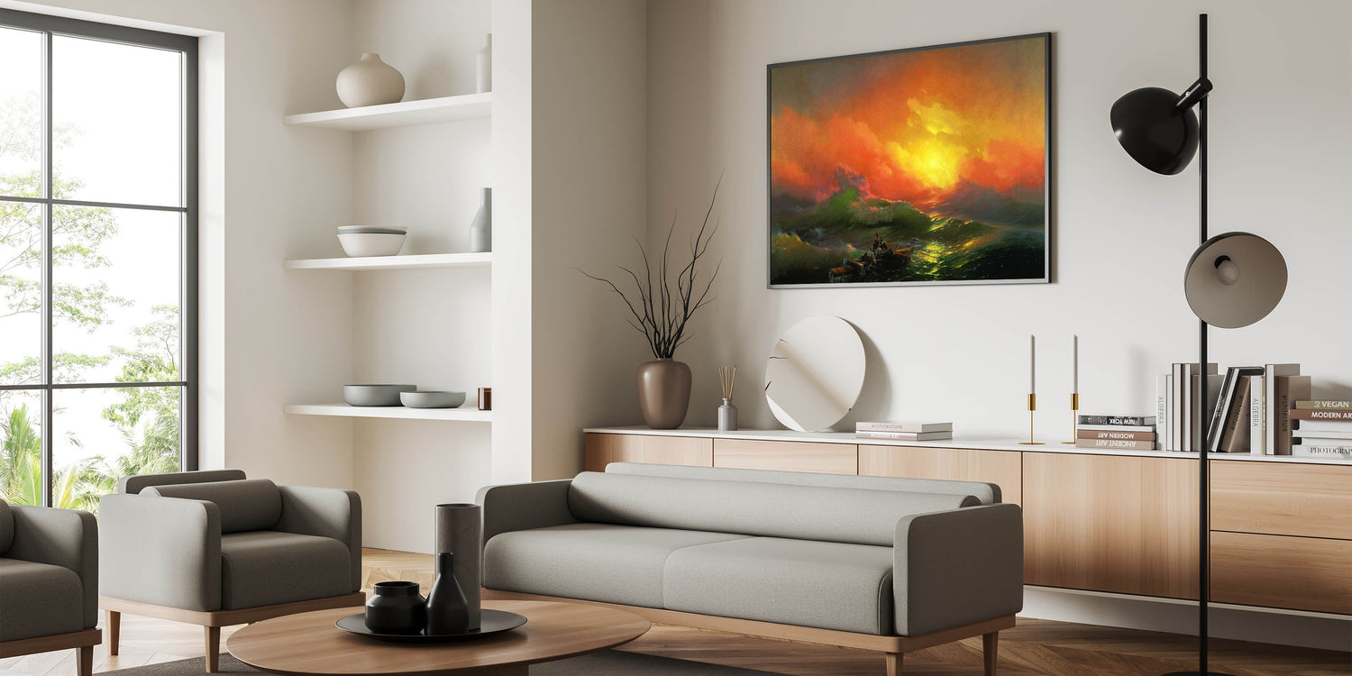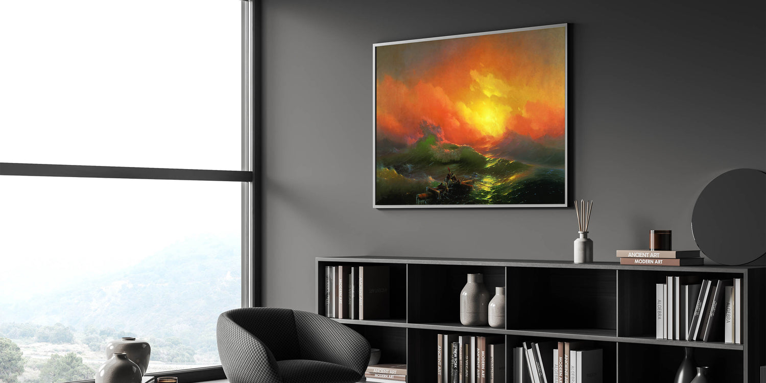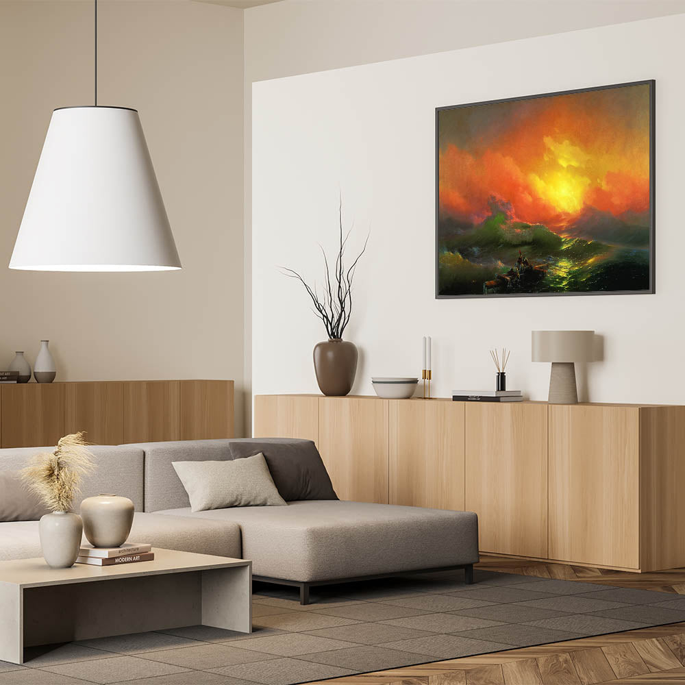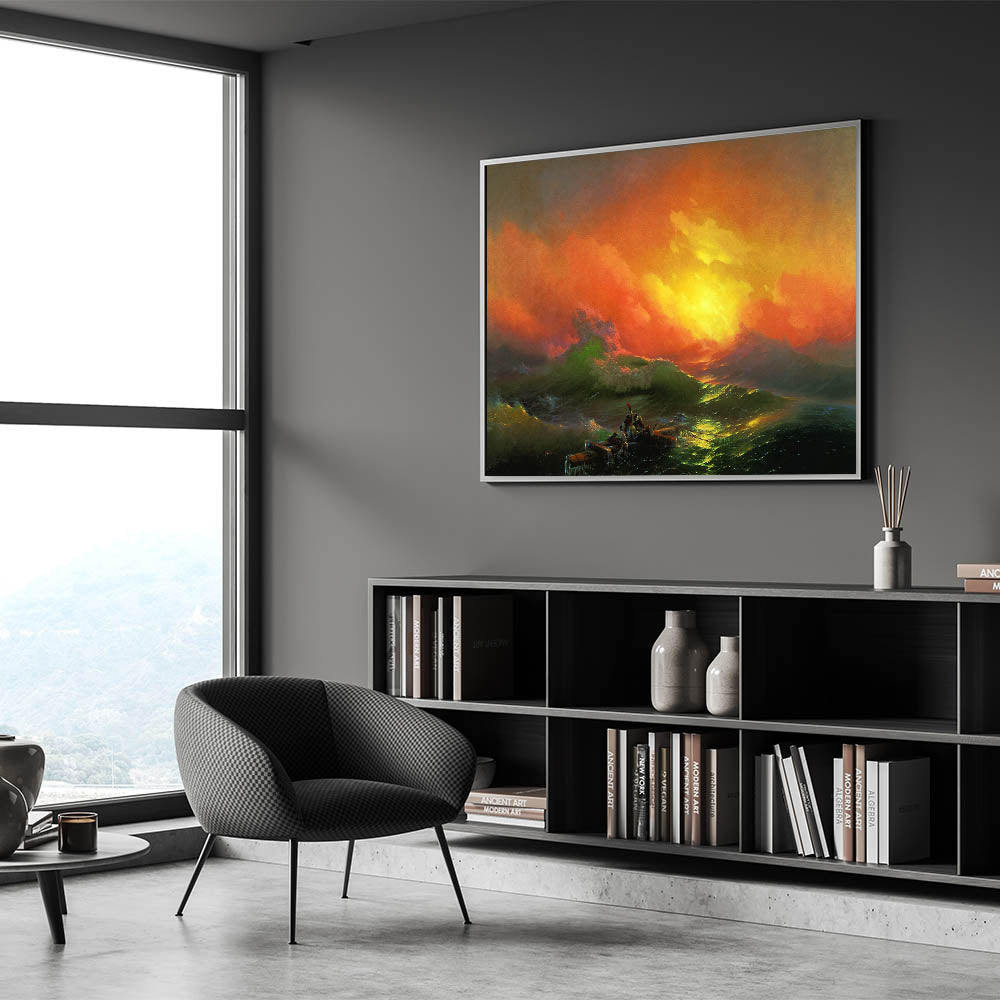 Immerse yourself in the dramatic beauty of Romanticism with The Ninth Wave by Ivan Aivazovsky. This iconic seascape masterfully captures the interplay of light and emotion as waves crash under the glow of a fiery sunrise. The vivid oranges, greens, and blues reflect the Romantic era’s passion for nature’s power and sublime beauty. A timeless piece of art, it adds a profound emotional resonance to any space.