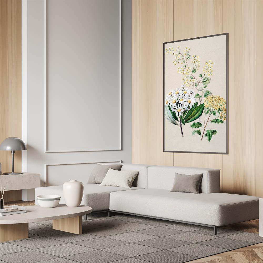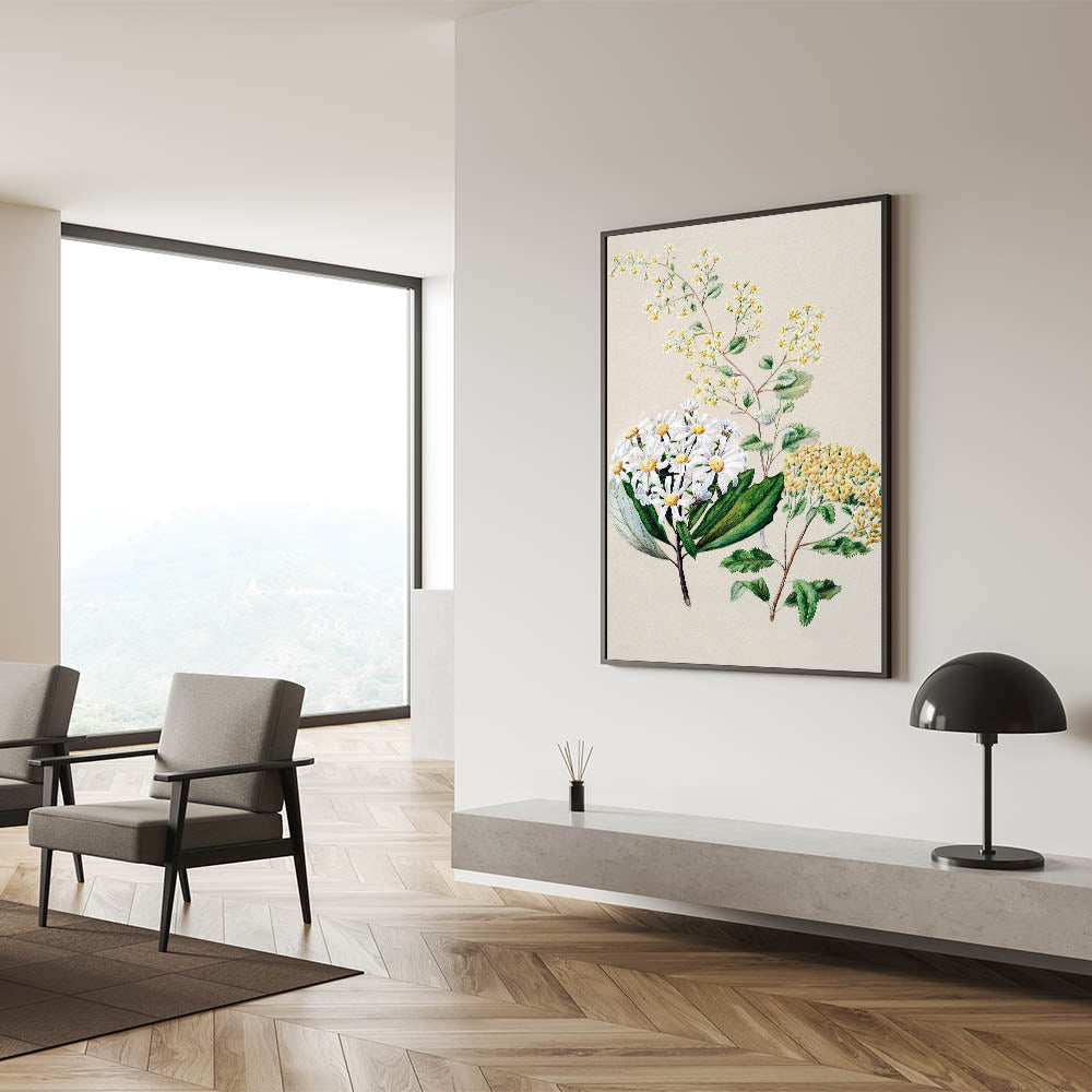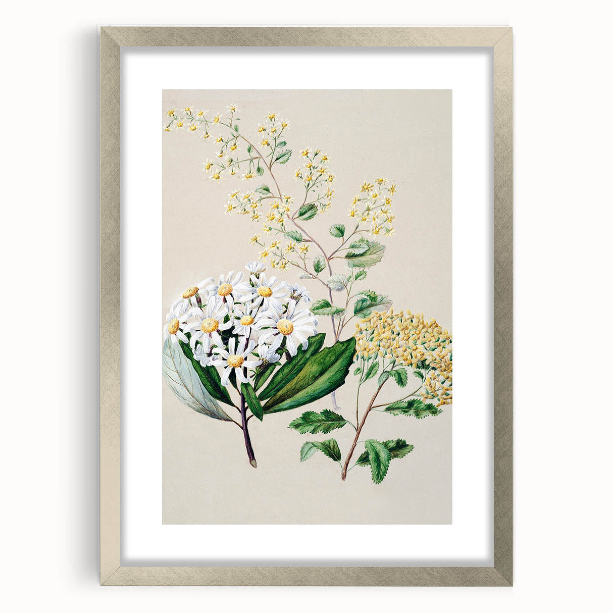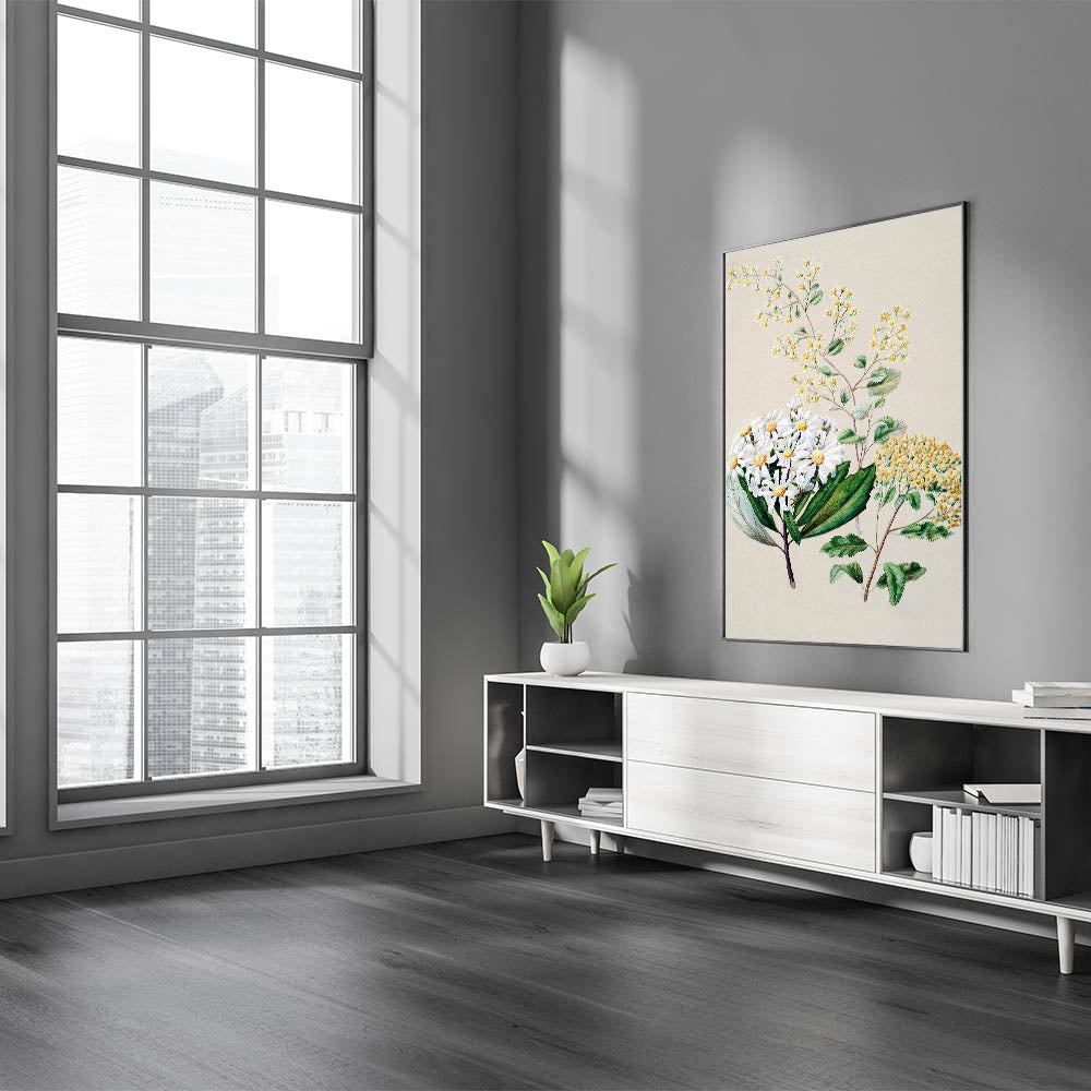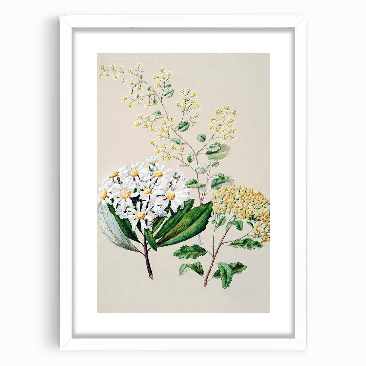 Celebrate the elegance of nature with this realism art print, featuring an antique botanical illustration of three unique floral species. With delicate white and yellow blooms and intricately detailed leaves, this piece is a stunning example of fine art realism. The composition reflects the timeless charm of 19th-century botanical studies, making it a perfect choice for nature enthusiasts or those looking to add a touch of sophistication to their decor.