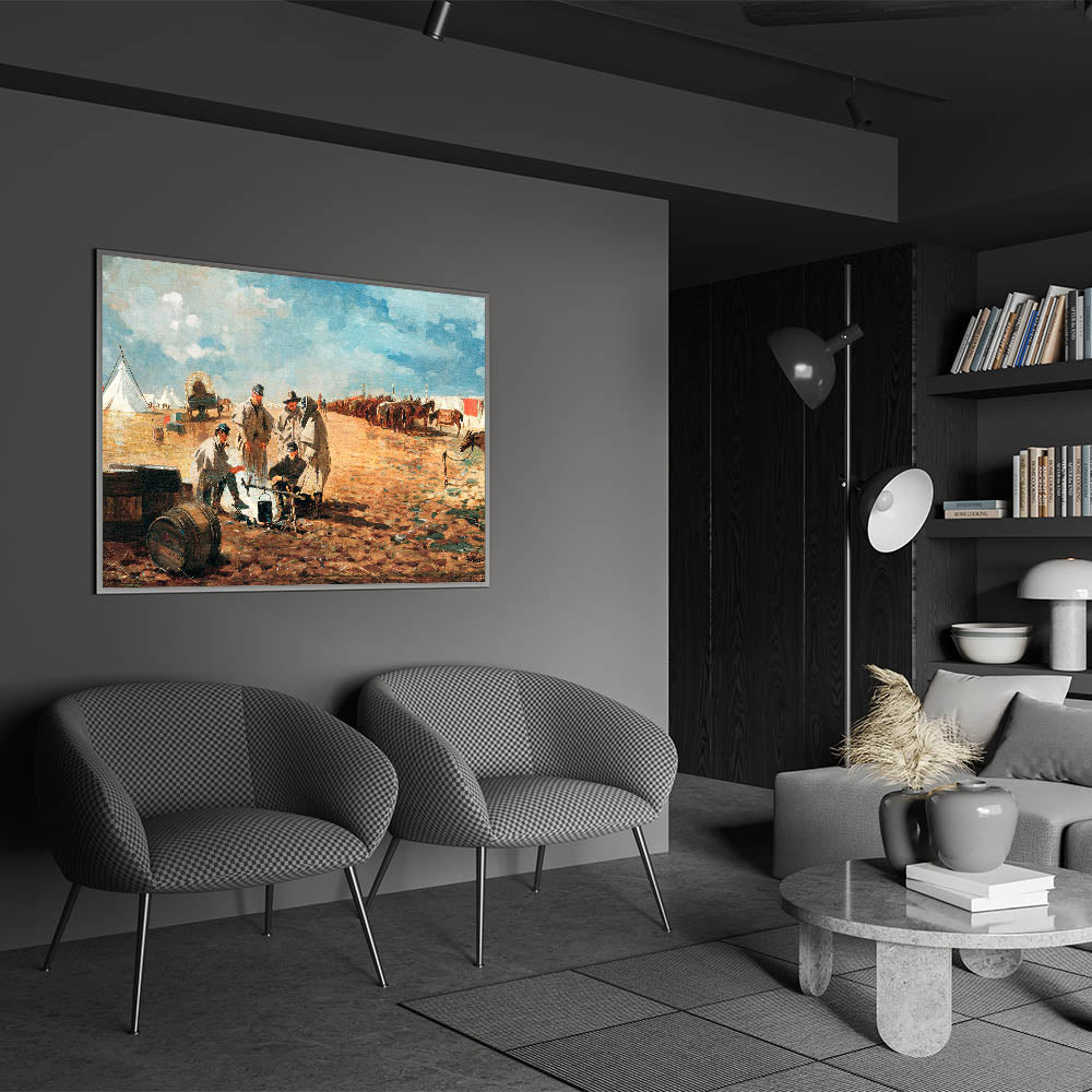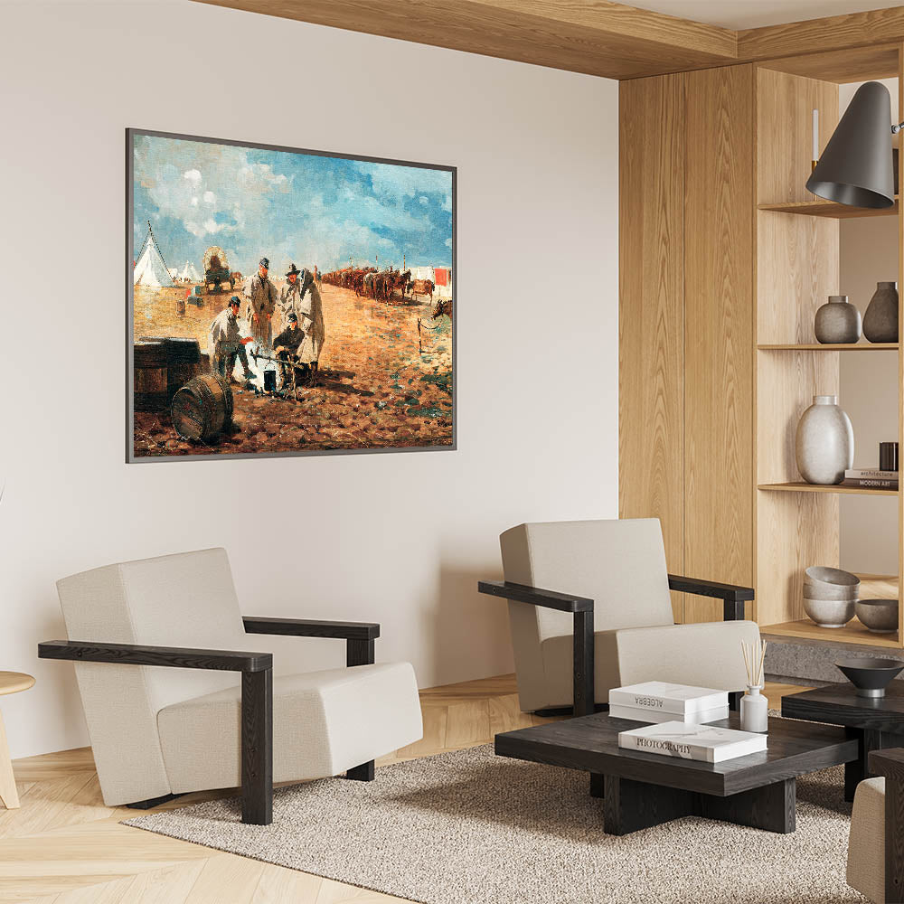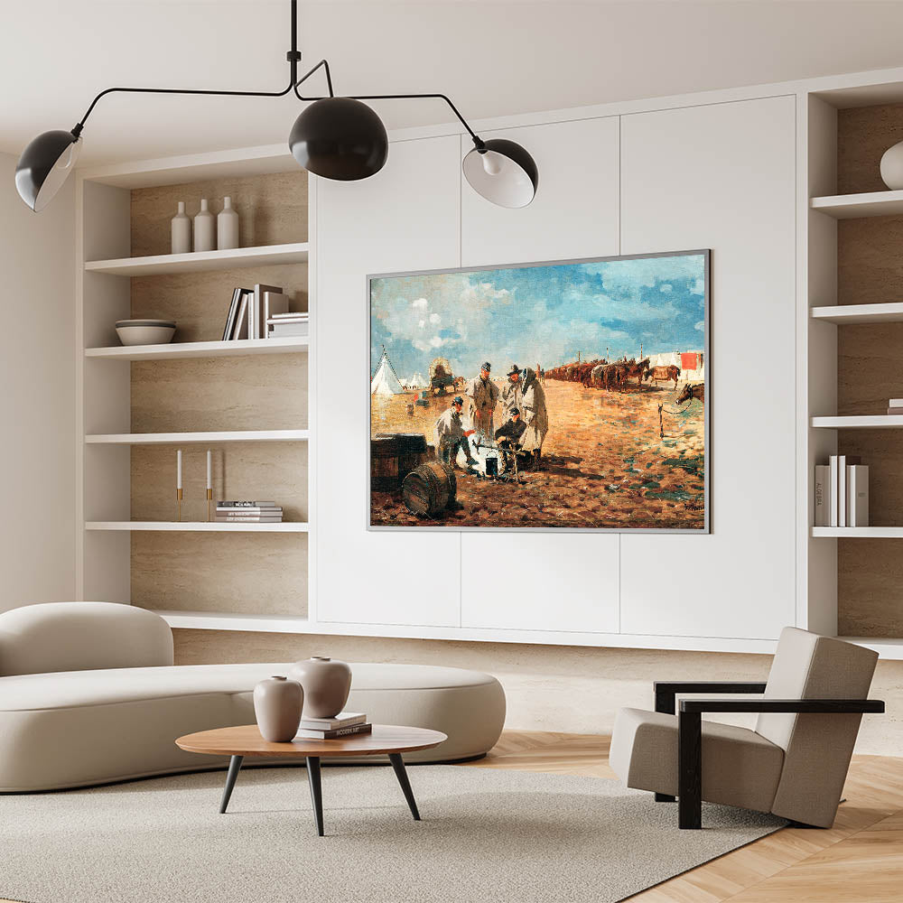 Immerse yourself in history with this beautifully crafted realism art print capturing a Civil War camp scene. Depicting soldiers gathered around a fire under a moody sky, this classical realism canvas art showcases the hardships and camaraderie of camp life. The intricate details of the tents, horses, and rugged terrain evoke a poignant sense of the past, making it a timeless addition to your home or office.