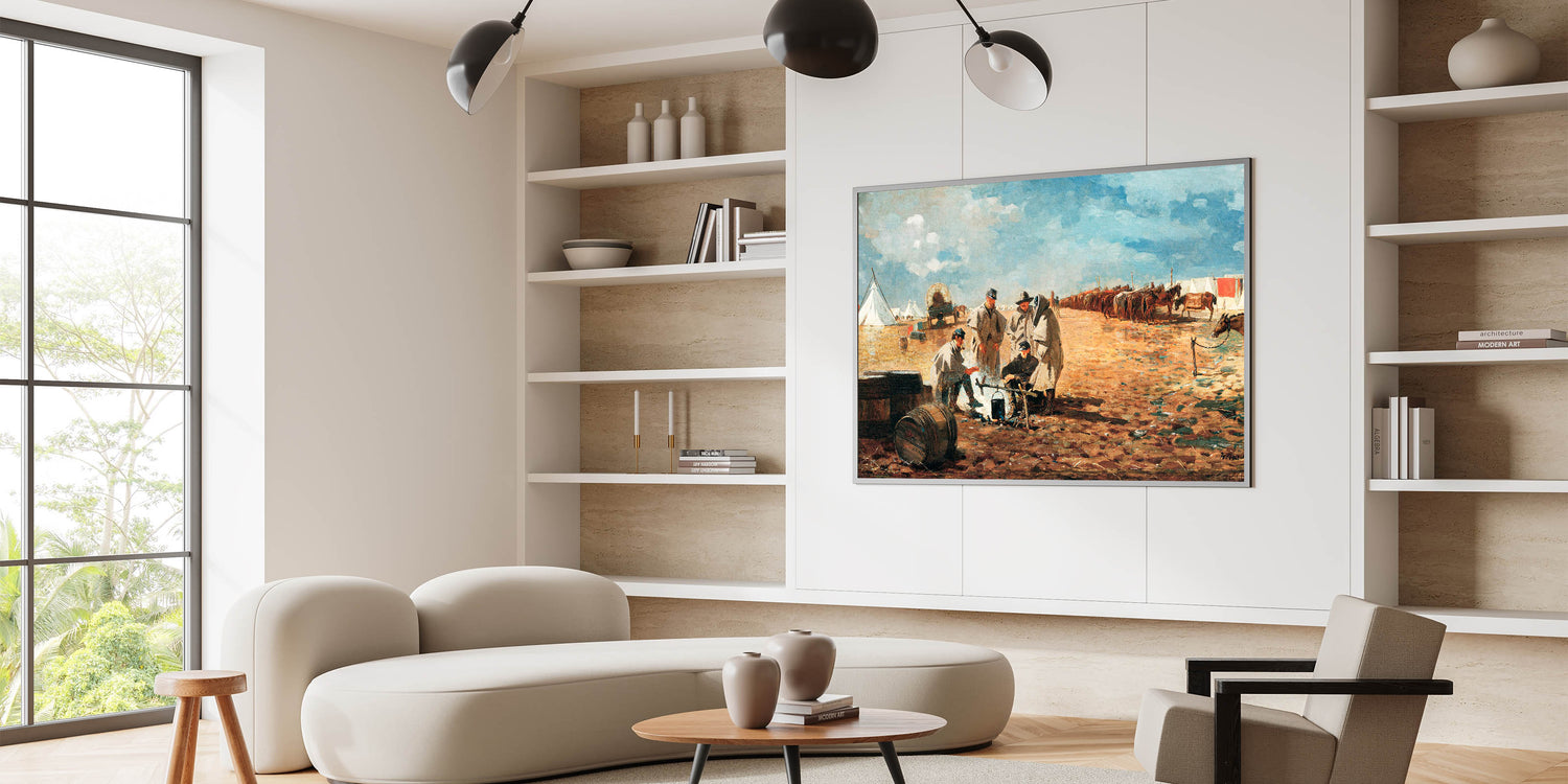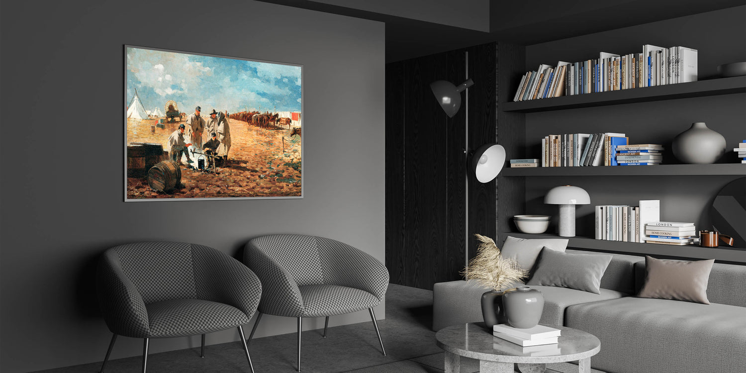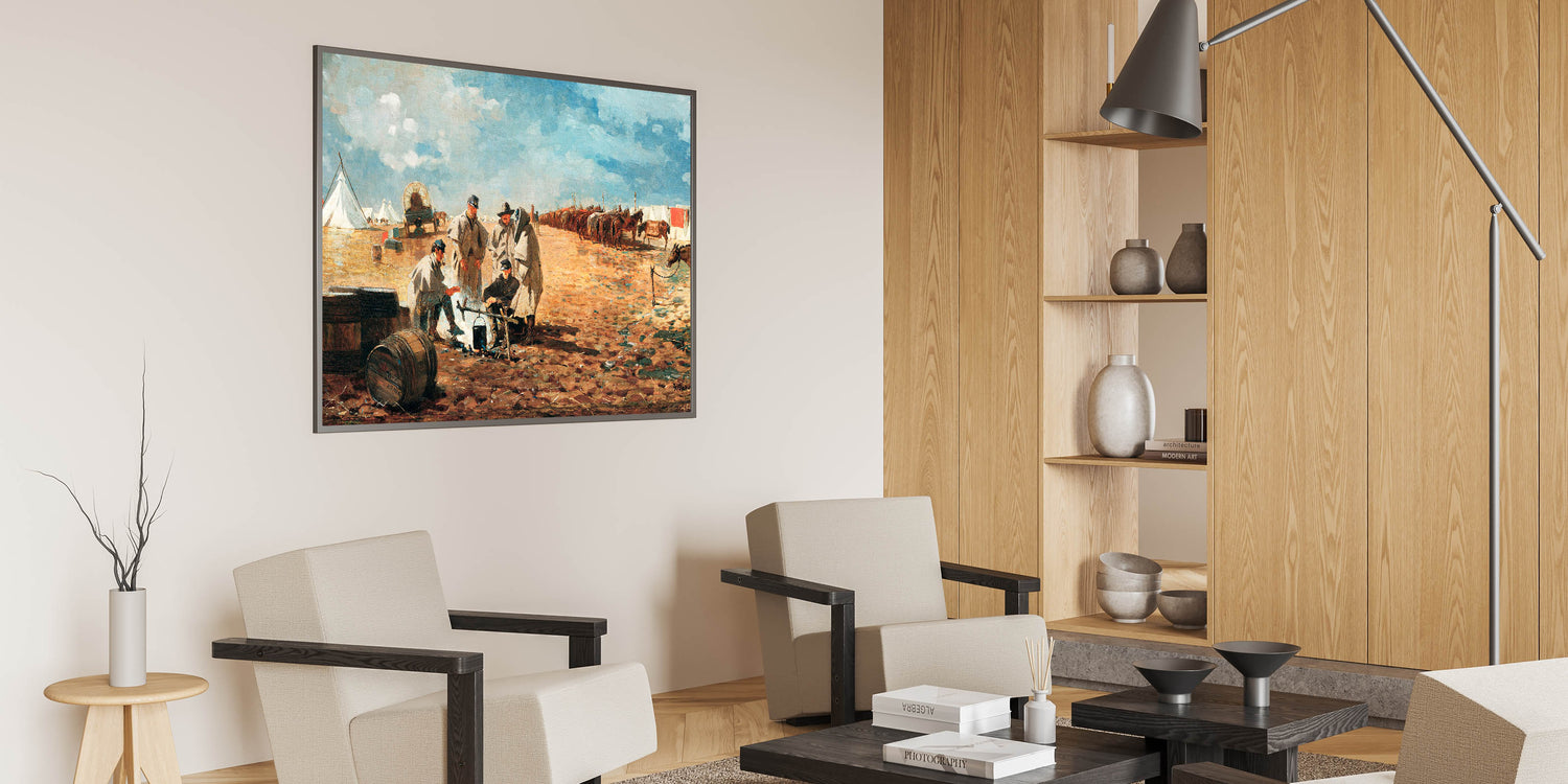 Immerse yourself in history with this beautifully crafted realism art print capturing a Civil War camp scene. Depicting soldiers gathered around a fire under a moody sky, this classical realism canvas art showcases the hardships and camaraderie of camp life. The intricate details of the tents, horses, and rugged terrain evoke a poignant sense of the past, making it a timeless addition to your home or office.