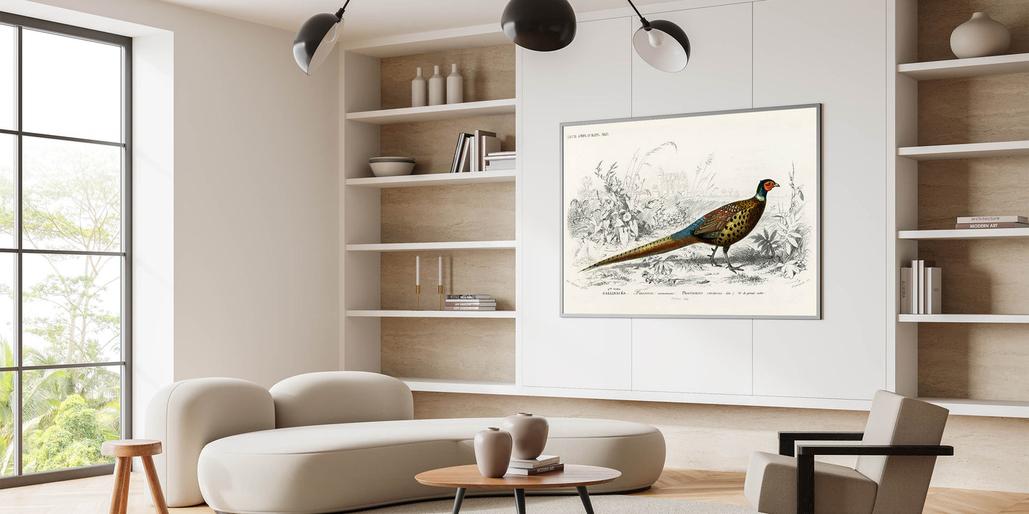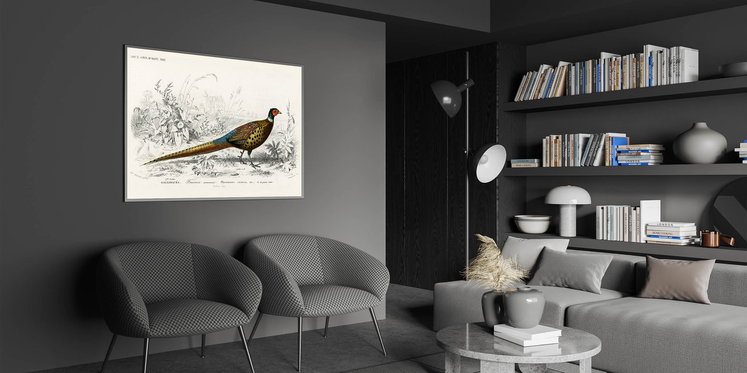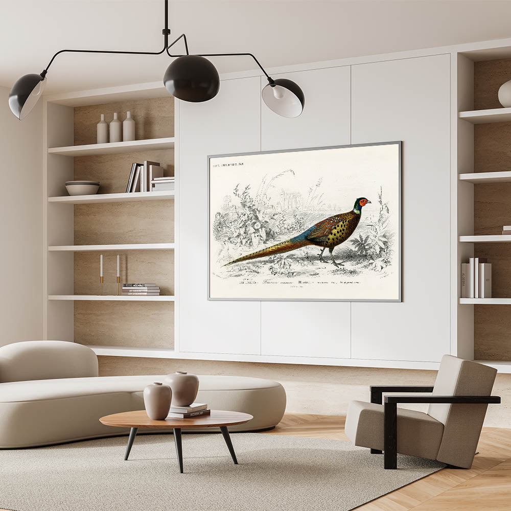 Celebrate the beauty of nature and history with this exquisite illustration of a Ring-necked Pheasant, inspired by the Romanticism art movement. This piece, with its vibrant and intricate detailing, features a colorful pheasant in a serene countryside setting, blending rich gold, blue, and red hues with a natural backdrop. It embodies the timeless charm of famous Romantic era art, bringing emotional landscapes and portraits into your home decor.