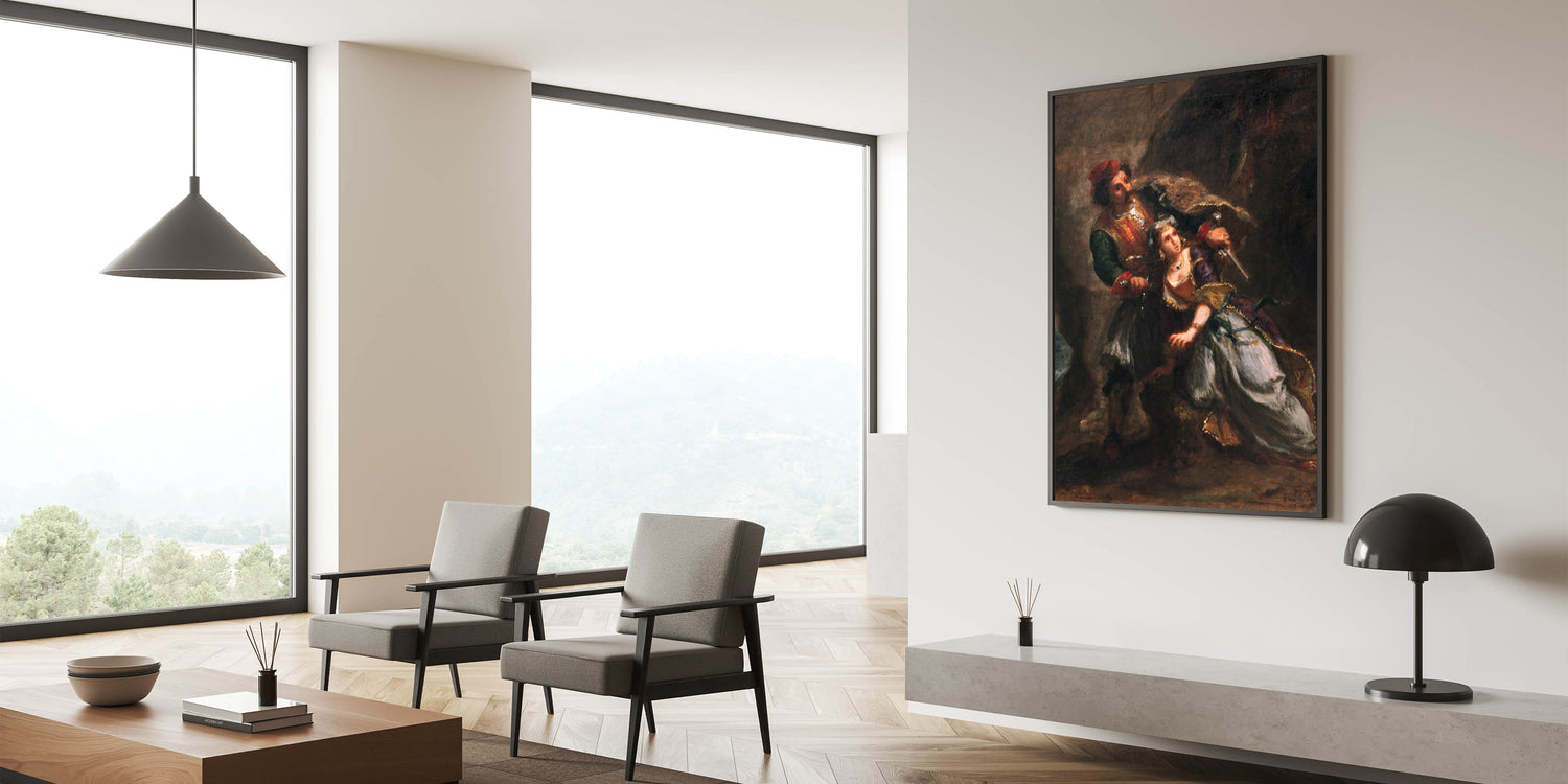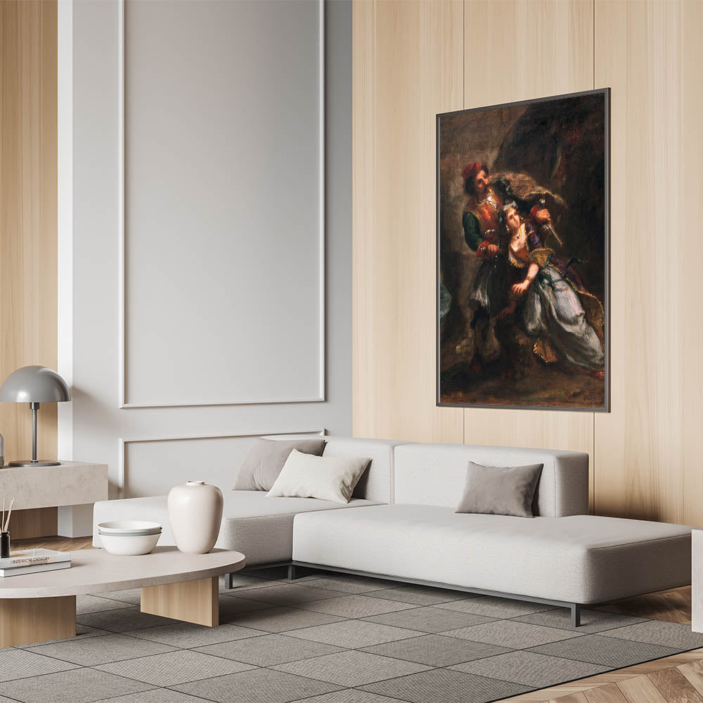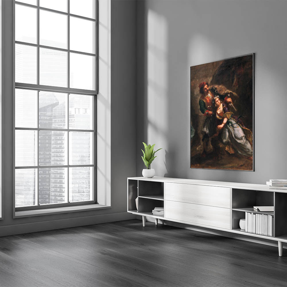 Dive into the dramatic intensity of Romanticism with "Selim and Zuleika", a masterpiece by Eugène Delacroix inspired by Lord Byron's poem The Bride of Abydos. This artwork beautifully conveys the emotional turmoil and passion of the characters, skillfully depicted through Delacroix’s signature use of dynamic brushstrokes, vivid colors, and intricate details.