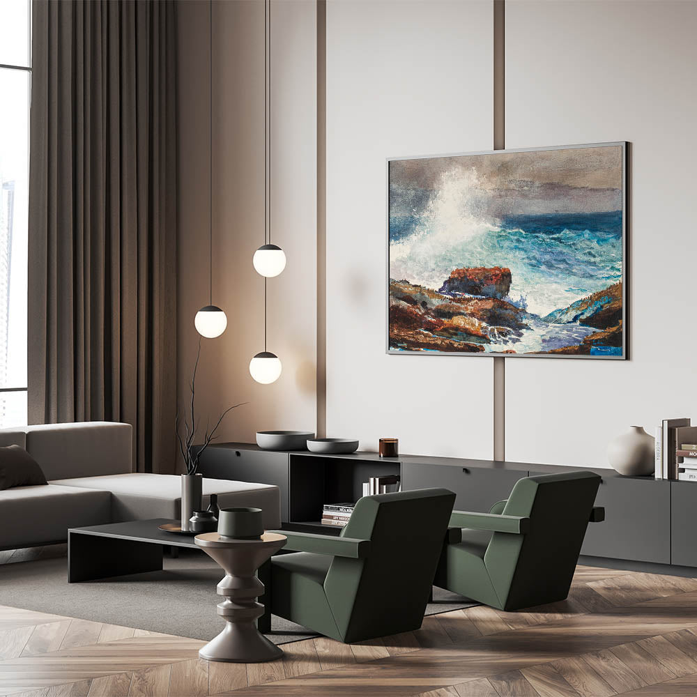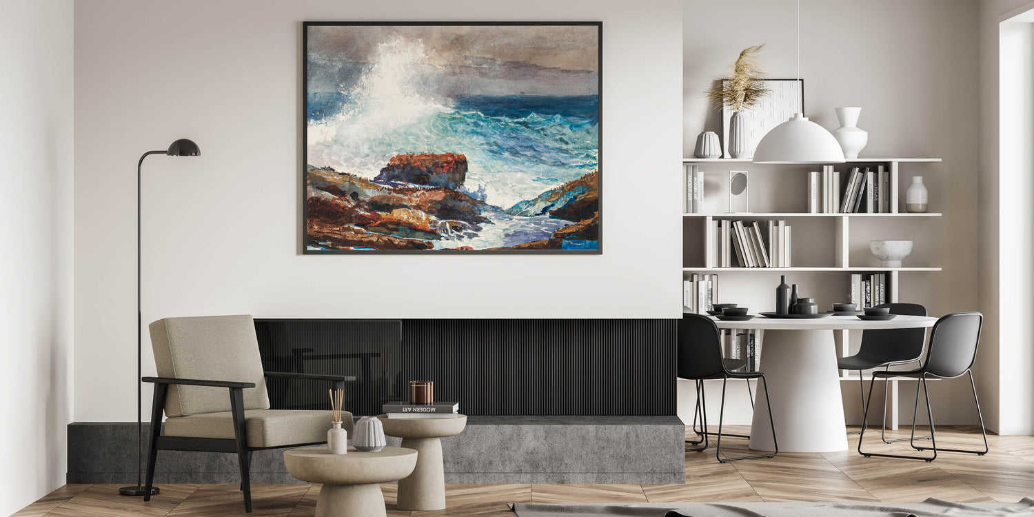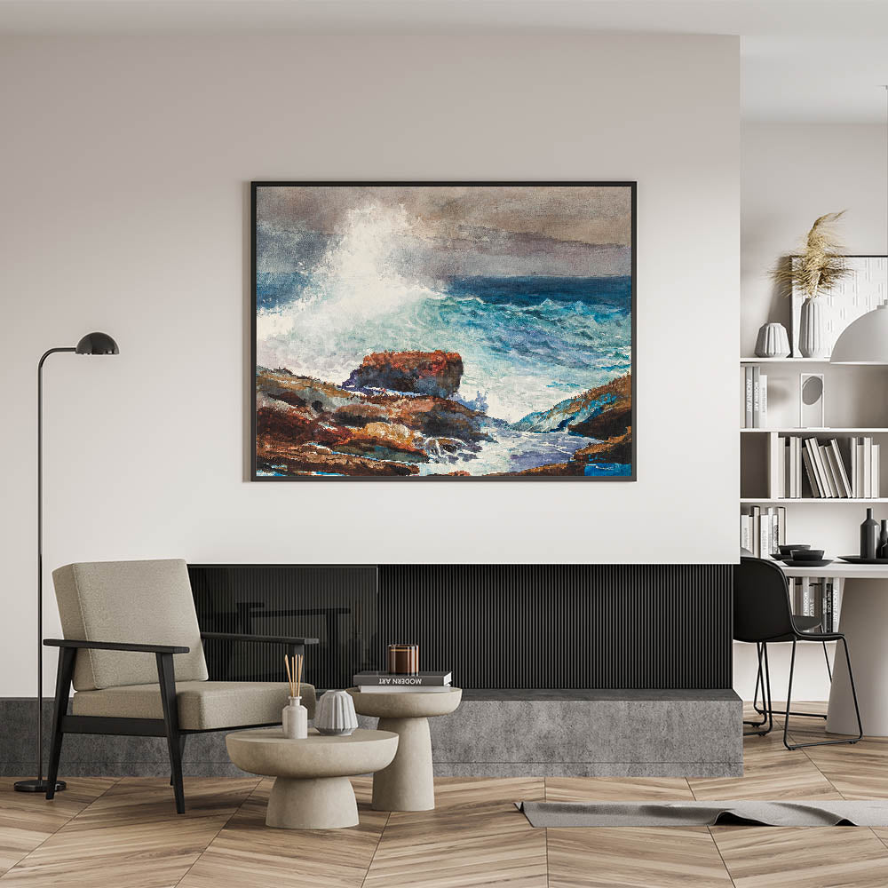 Feel the raw power of the ocean with "Incoming Tide, Scarboro, Maine" Realism Art Print by Winslow Homer. Painted in 1883, this artwork captures the dynamic moment of waves crashing against the rocky shores of Maine, with dramatic splashes and turbulent waters. Homer's expert watercolor technique brings life and movement to the scene, making it an ideal piece for those who appreciate the beauty and energy of the sea. This print adds a bold, coastal charm to any space, perfect for creating a refreshing, natural atmosphere.