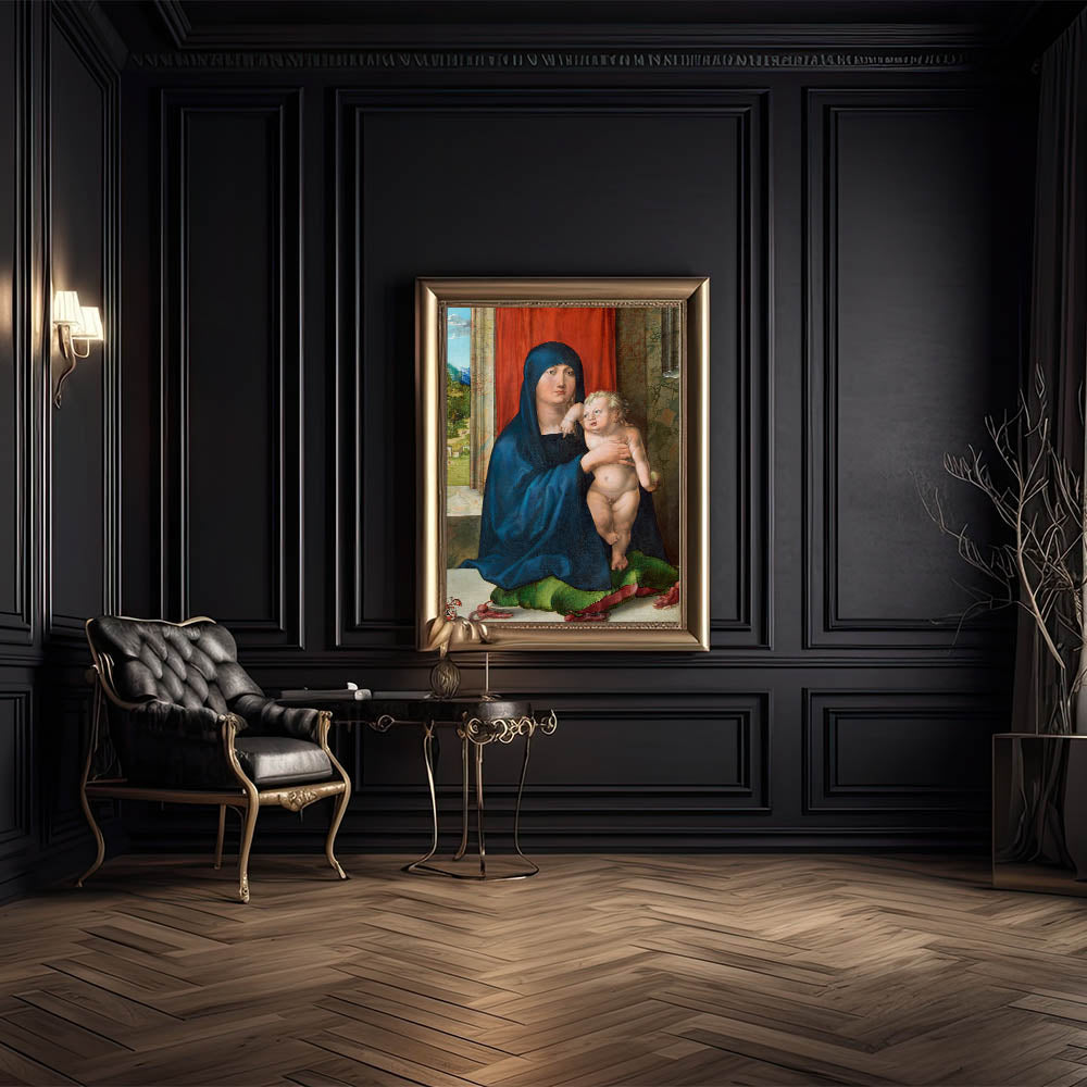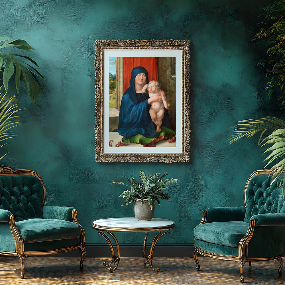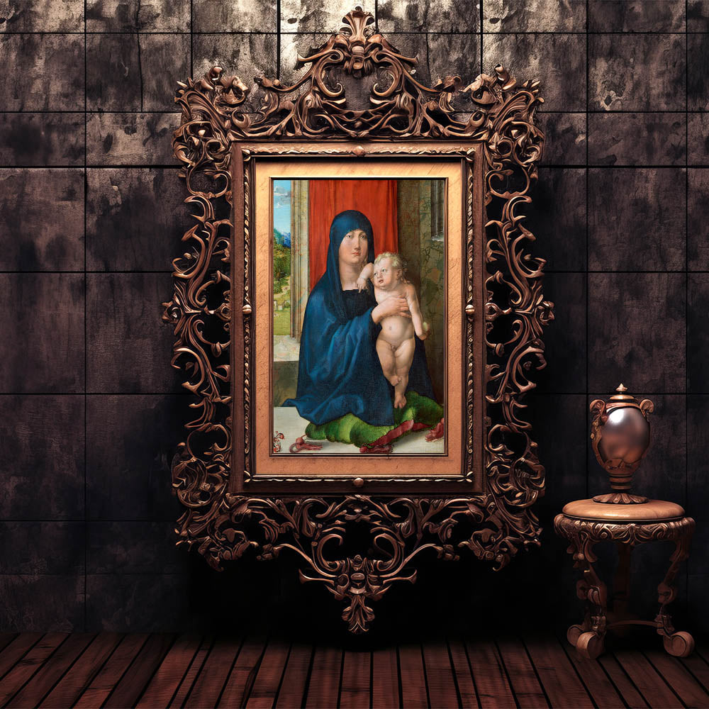 Add a touch of divine elegance to your space with the Madonna and Child, a masterful representation of Renaissance art. This piece depicts the Virgin Mary holding the Christ Child, adorned in vivid colors and intricate details that exemplify the artistry of the era. The serene backdrop, including lush landscapes and rich red curtains, highlights the artist’s attention to depth and composition.