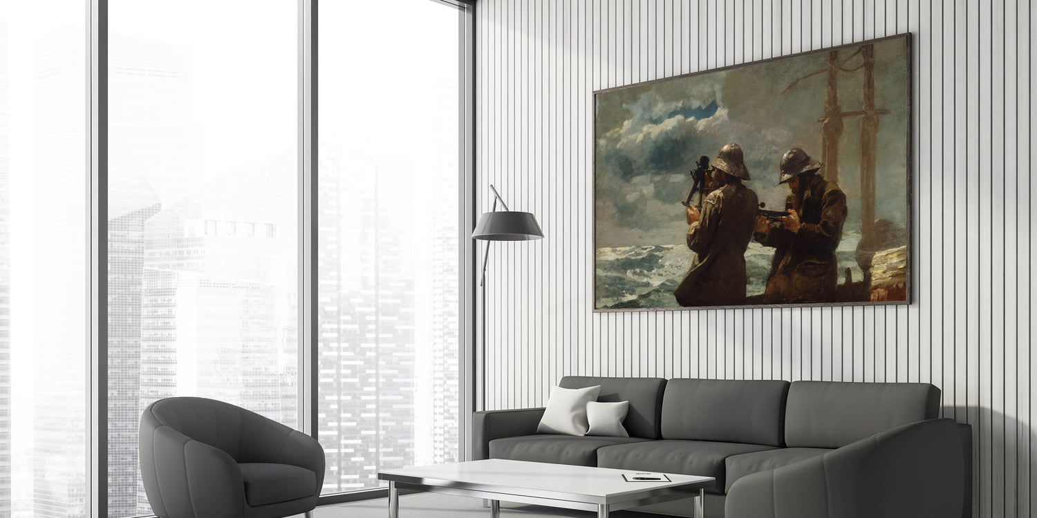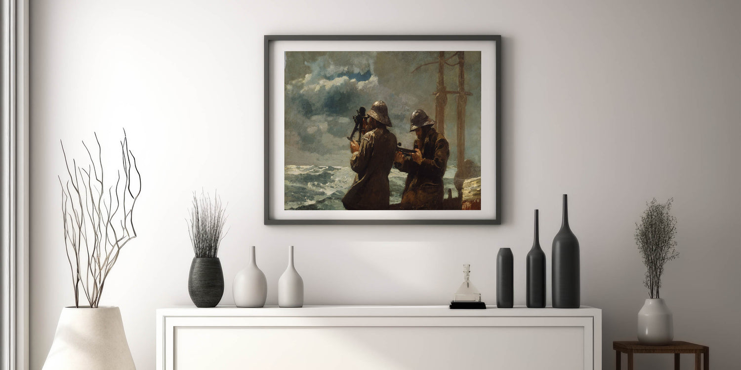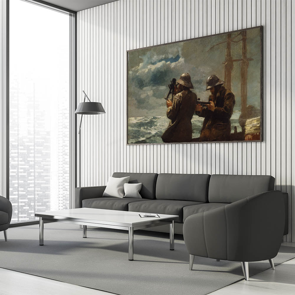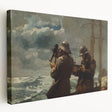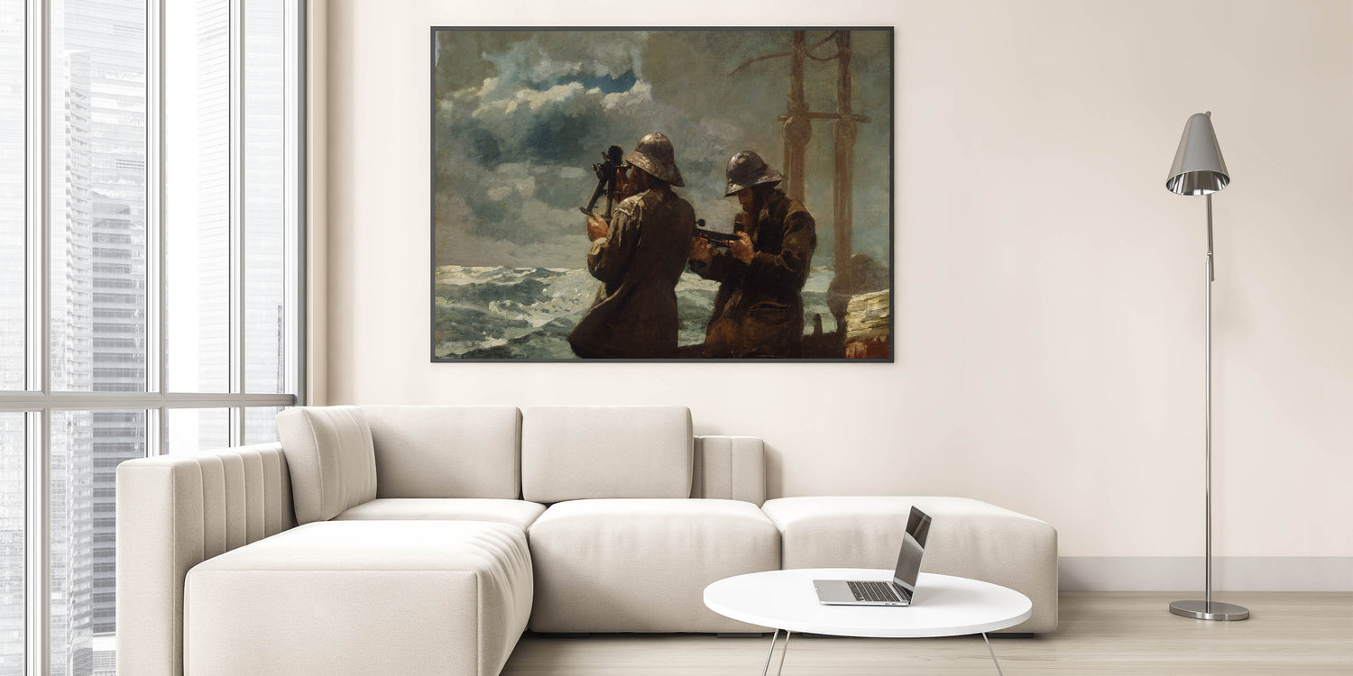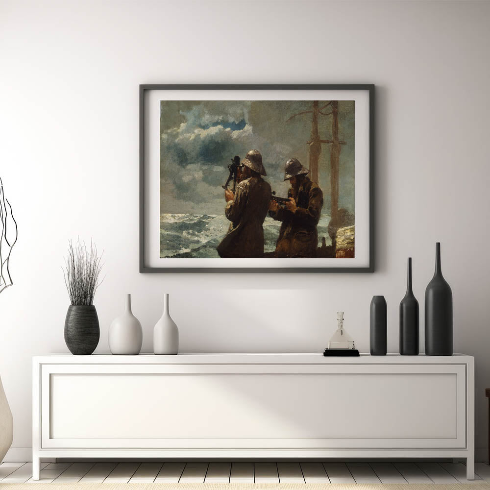 Experience the gritty realism of life at sea with Eight Bells (1886) by Winslow Homer, a powerful depiction of two sailors navigating through a rough sea. This artwork, celebrated for its stark realism and attention to the nuances of maritime life, captures the intense focus and determination of sailors as they work against the elements. The dynamic composition and moody atmosphere reflect Homer's skill in portraying the challenges faced by those who live their lives at sea.