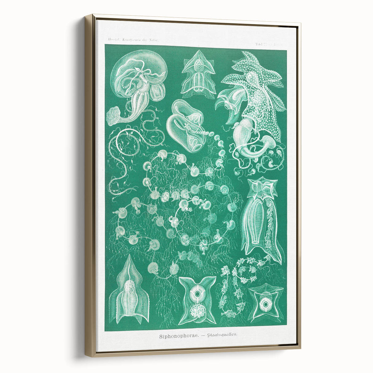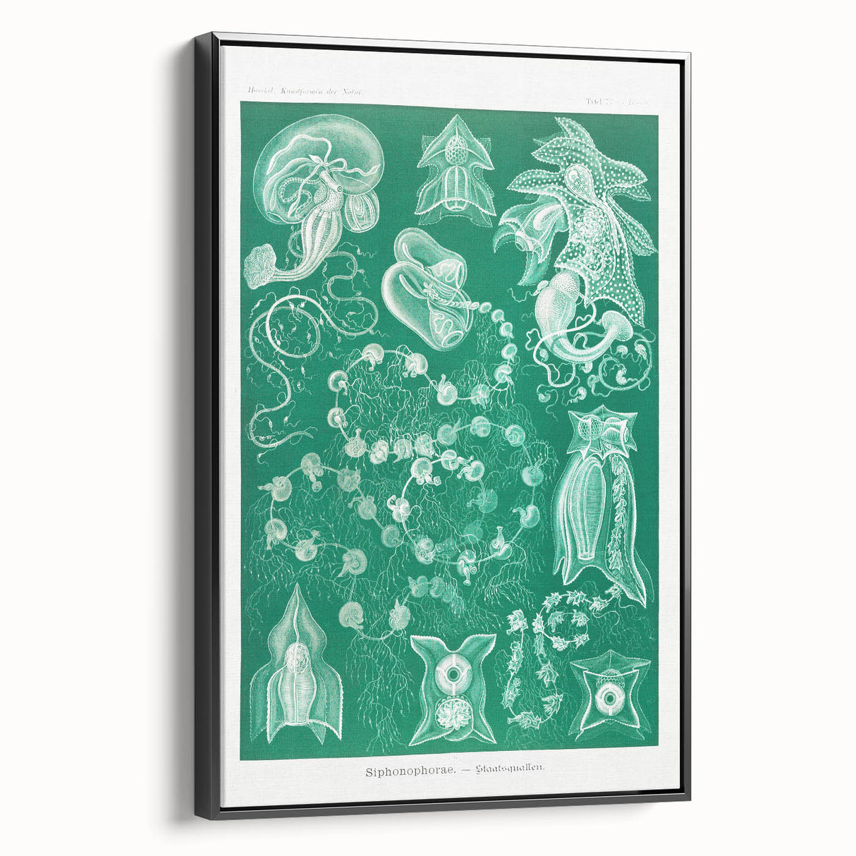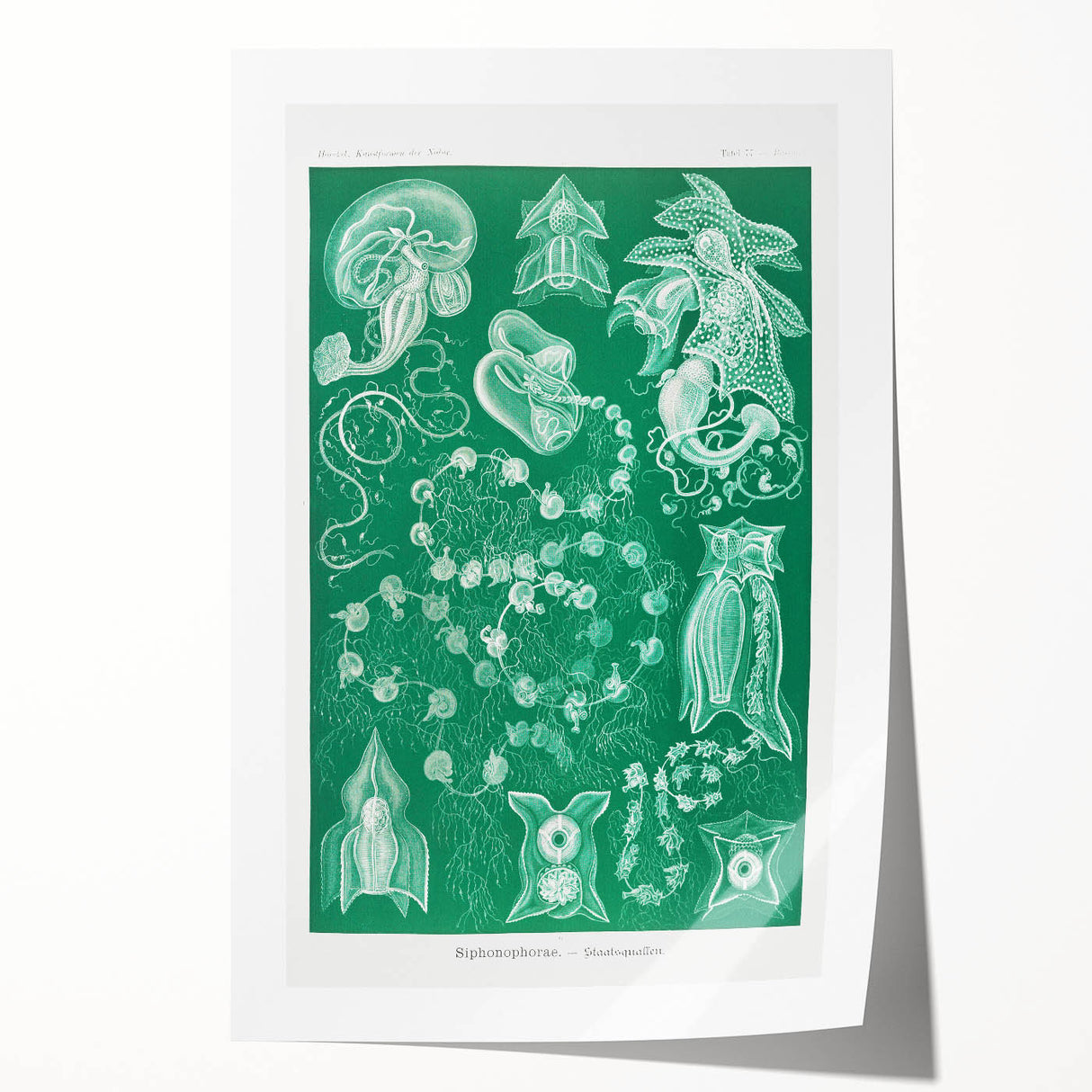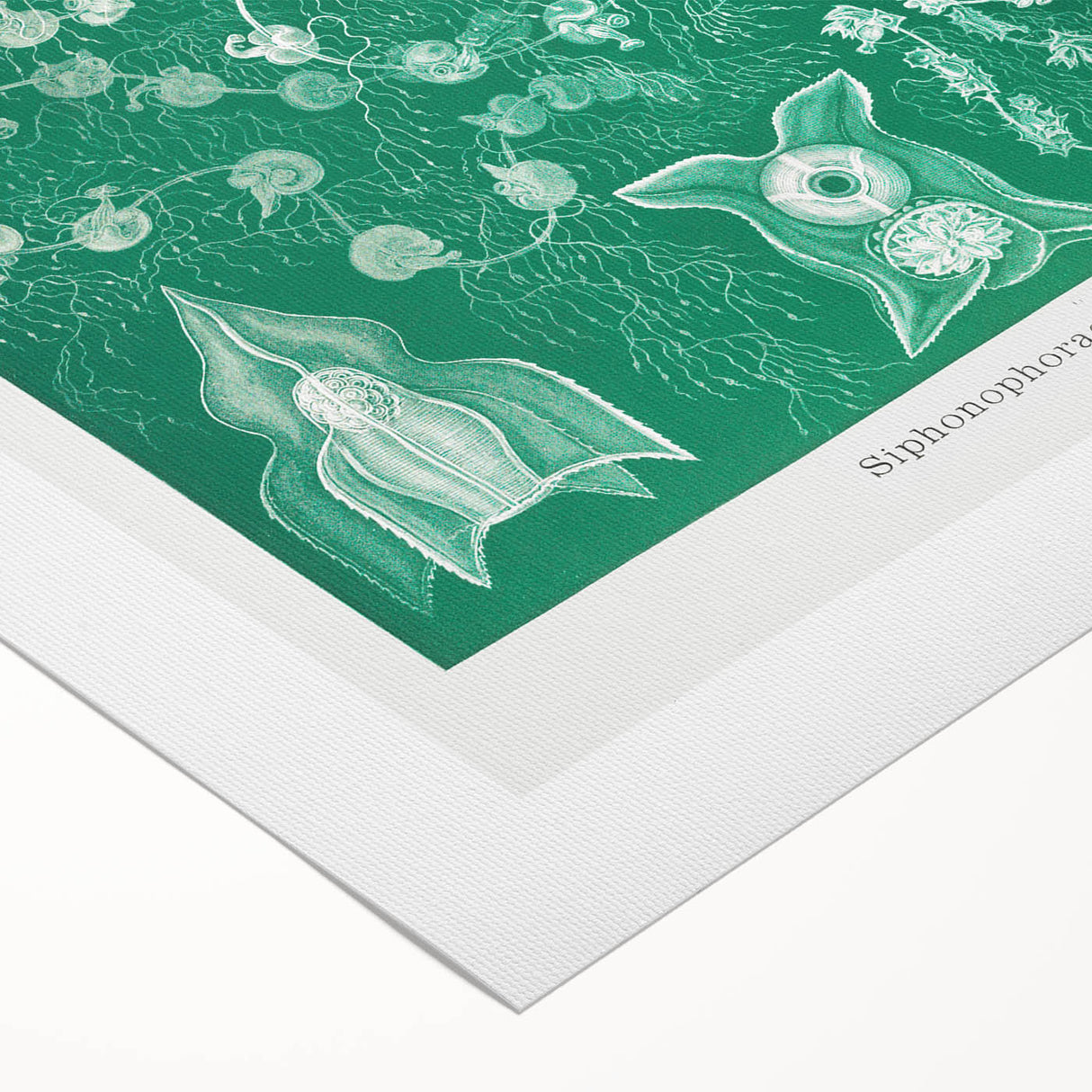 Transform your walls with the breathtaking "Siphonophorae Study" Modern Wall Art. Featuring Ernst Haeckel's intricate depiction of siphonophores, this artwork showcases delicate marine life in stunning detail. The vibrant green background and fine white illustrations make this piece a perfect blend of modern design elements and nature-inspired artistry.