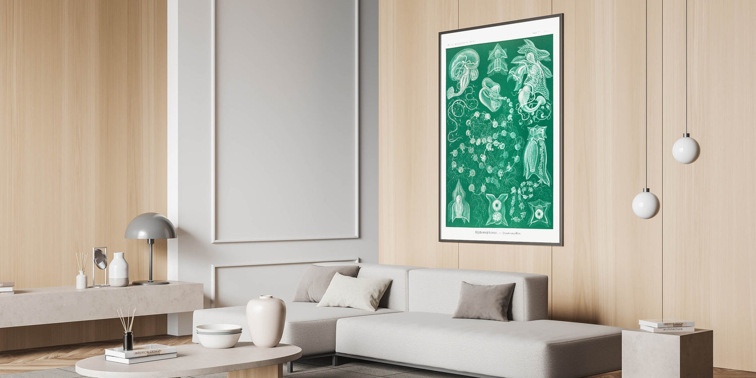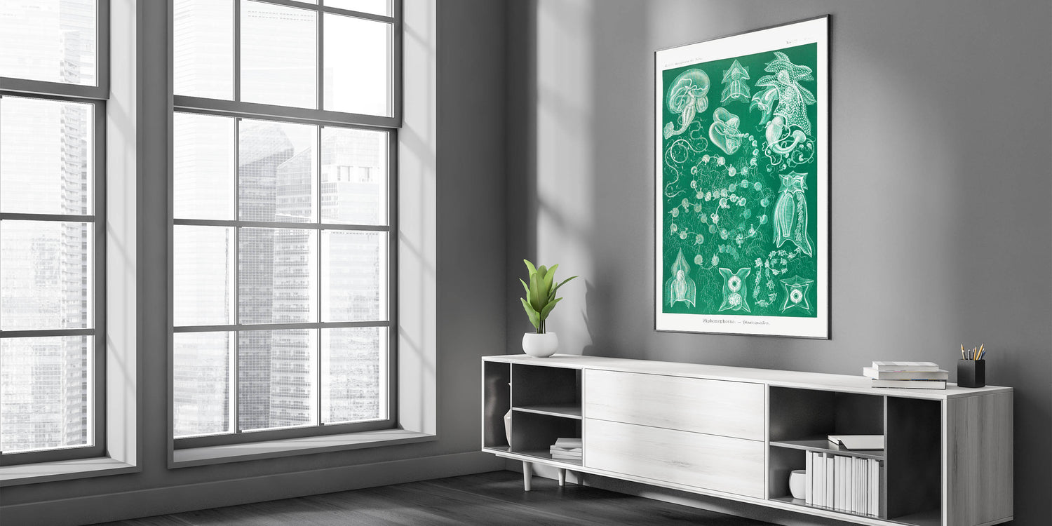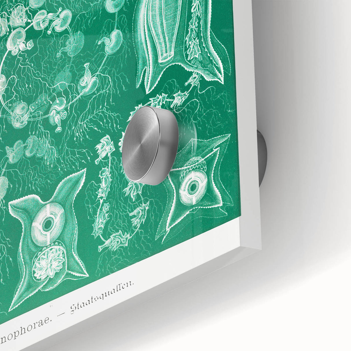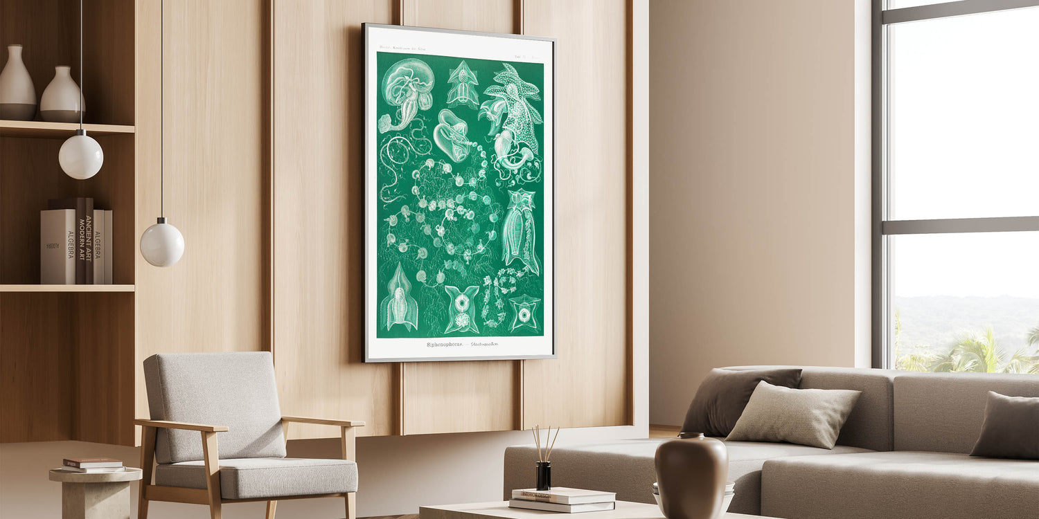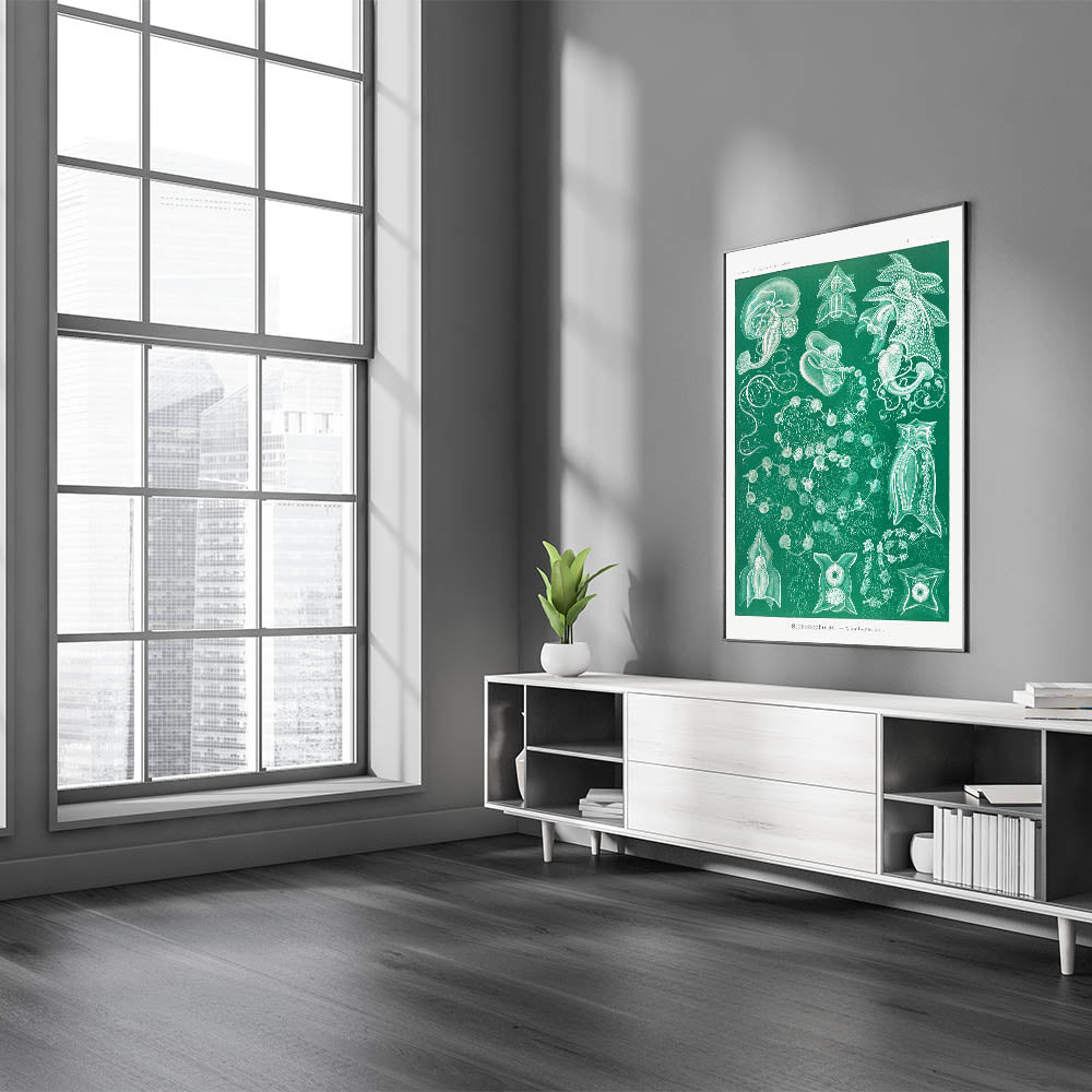 Transform your walls with the breathtaking "Siphonophorae Study" Modern Wall Art. Featuring Ernst Haeckel's intricate depiction of siphonophores, this artwork showcases delicate marine life in stunning detail. The vibrant green background and fine white illustrations make this piece a perfect blend of modern design elements and nature-inspired artistry.