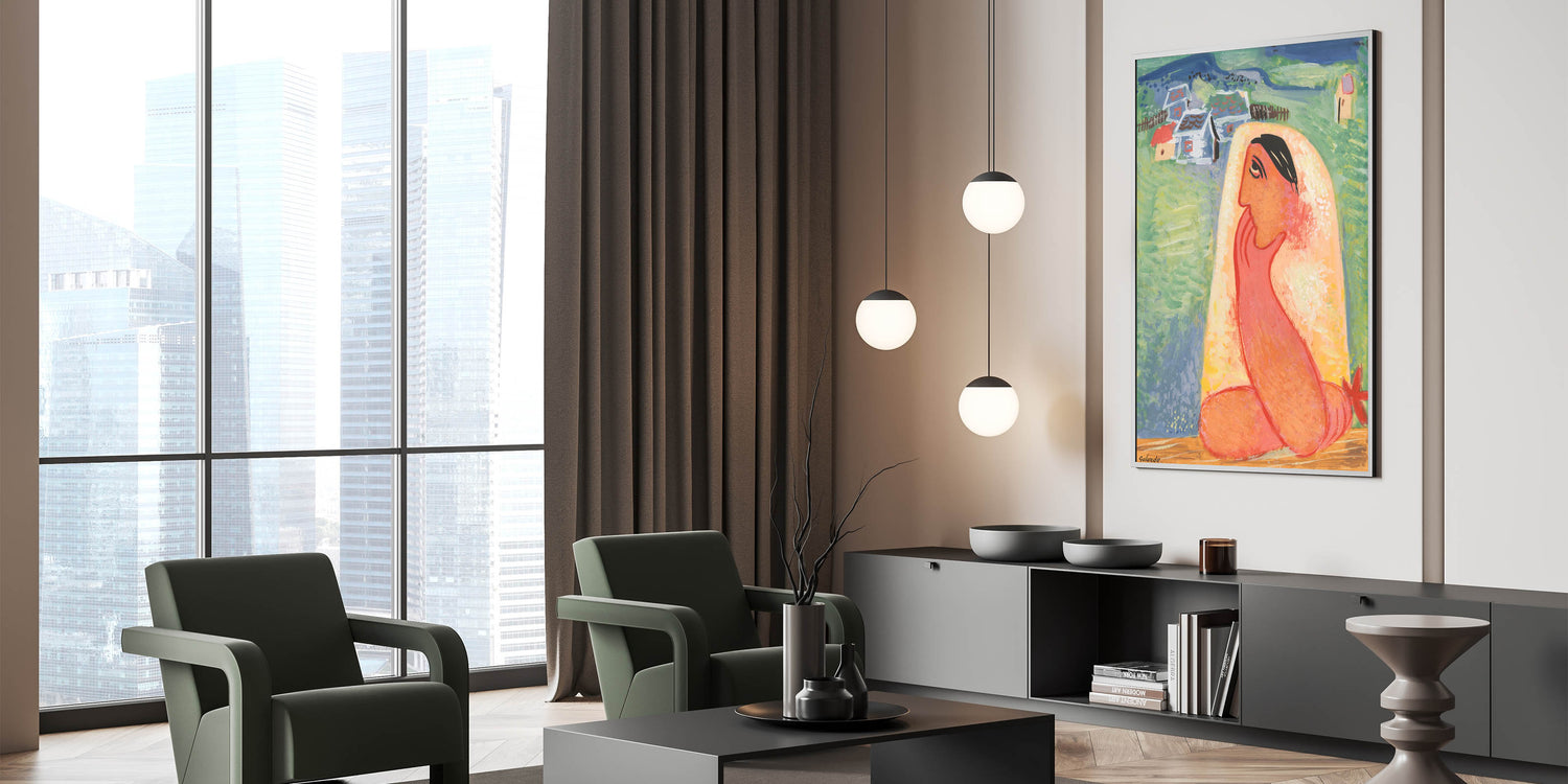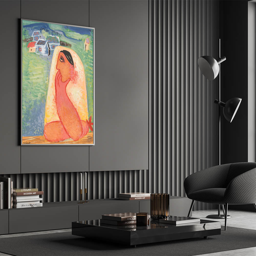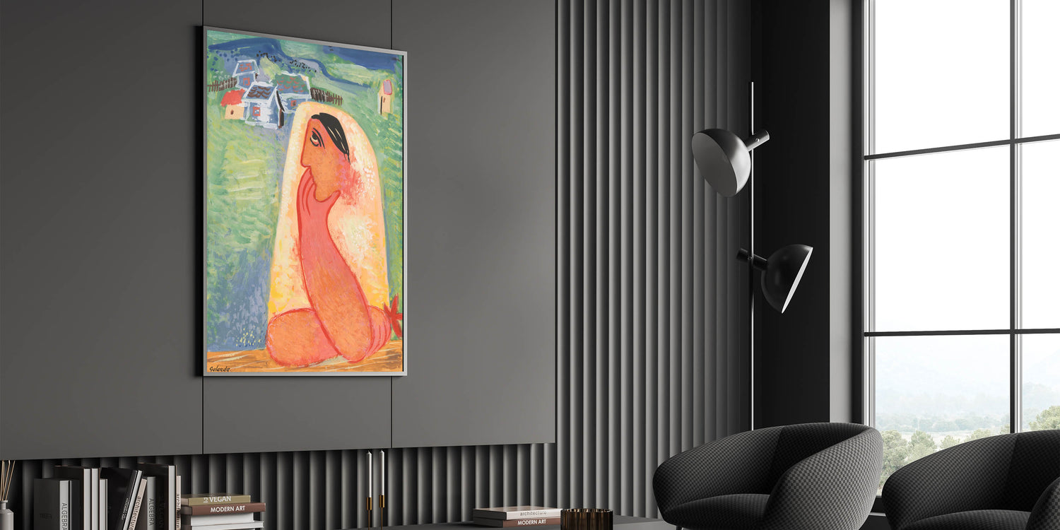 Infuse your space with the charm of Modern Wall Art, featuring Villager by Mikuláš Galanda. This vibrant composition combines bold colors and folk-inspired themes, portraying a thoughtful villager set against a serene backdrop of a quaint village. The artwork’s playful use of orange, green, and soft pastels creates a captivating balance of energy and tranquility, making it perfect for trendy home decor.