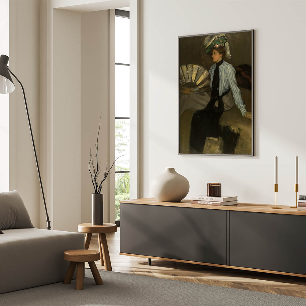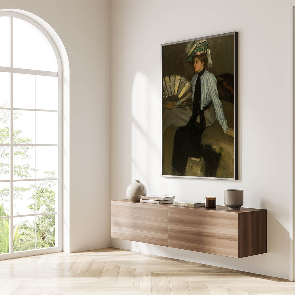 Elevate your decor with Modern Wall Art, featuring Young Woman with Fan by Alfred Henry Maurer. This elegant painting captures a poised figure in a serene moment, dressed in a striped blouse with a stunning floral hat. The muted tones and soft lighting create a harmonious and sophisticated atmosphere, perfect for fans of unique modern art and trendy home decor.