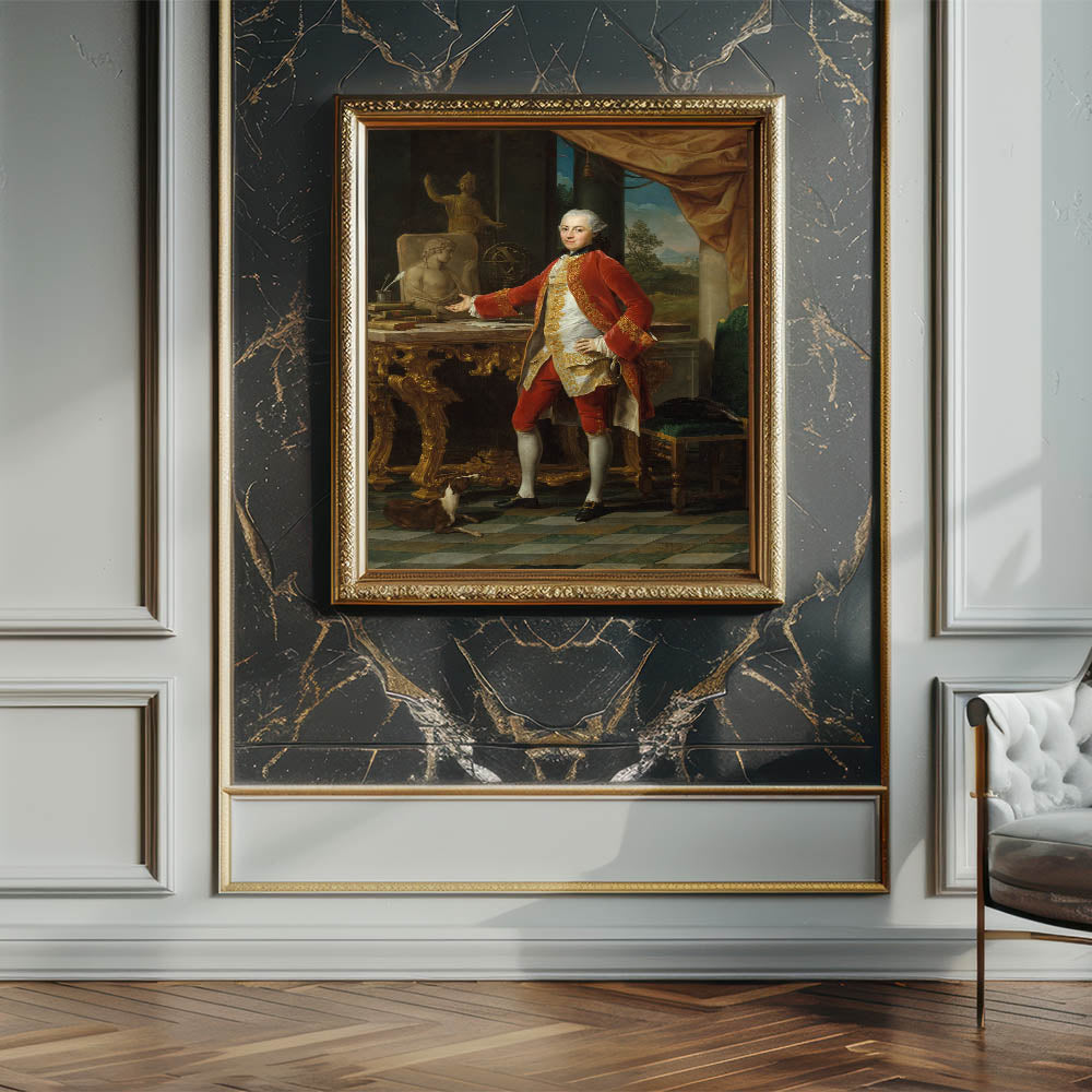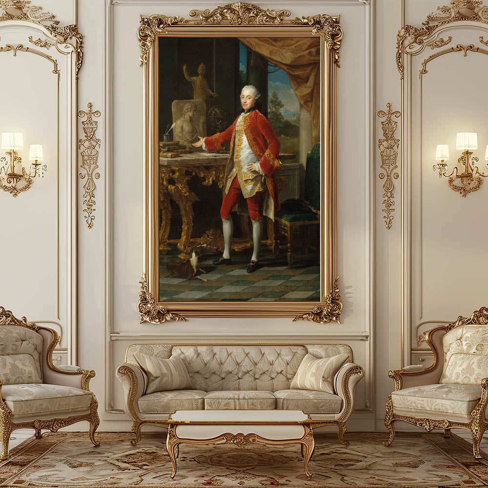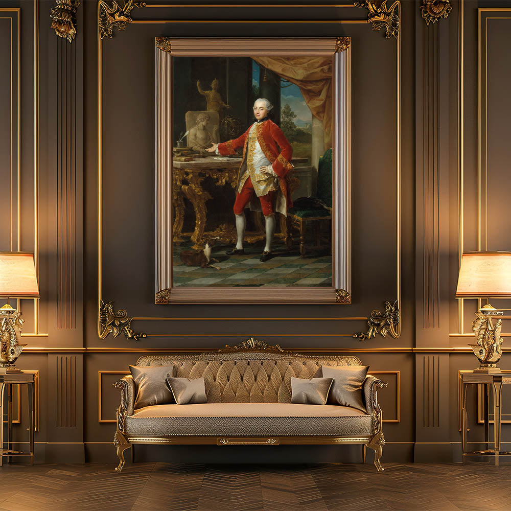 Elevate your interior design with the sophistication of Pompeo Batoni’s Portrait of a Young Man. This exquisite artwork, rooted in the grandeur of the late Renaissance and Baroque-inspired traditions, captures a noble gentleman in a poised and confident stance. The intricate details in the red and gold embroidery, the opulent furnishings, and the serene backdrop reflect a harmonious blend of elegance and historical artistry.