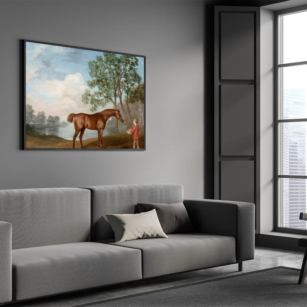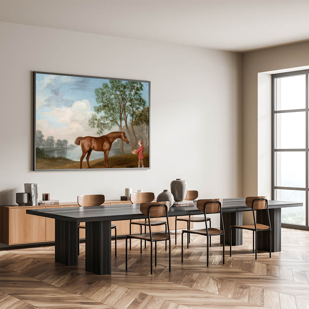 Celebrate the timeless elegance of Pumpkin with a Stable Lad (1774) by George Stubbs, a masterful work from the Romantic era. This serene composition captures a young stable boy feeding a chestnut horse named Pumpkin in a tranquil pastoral setting. Stubbs’ meticulous attention to detail brings the scene to life, showcasing the lifelike musculature of the horse and the gentle interaction between boy and animal.