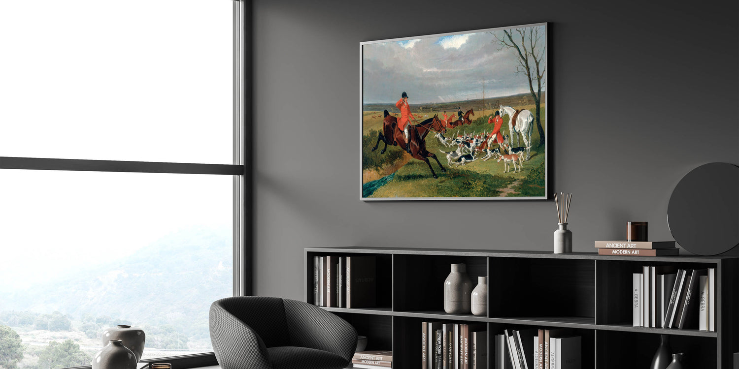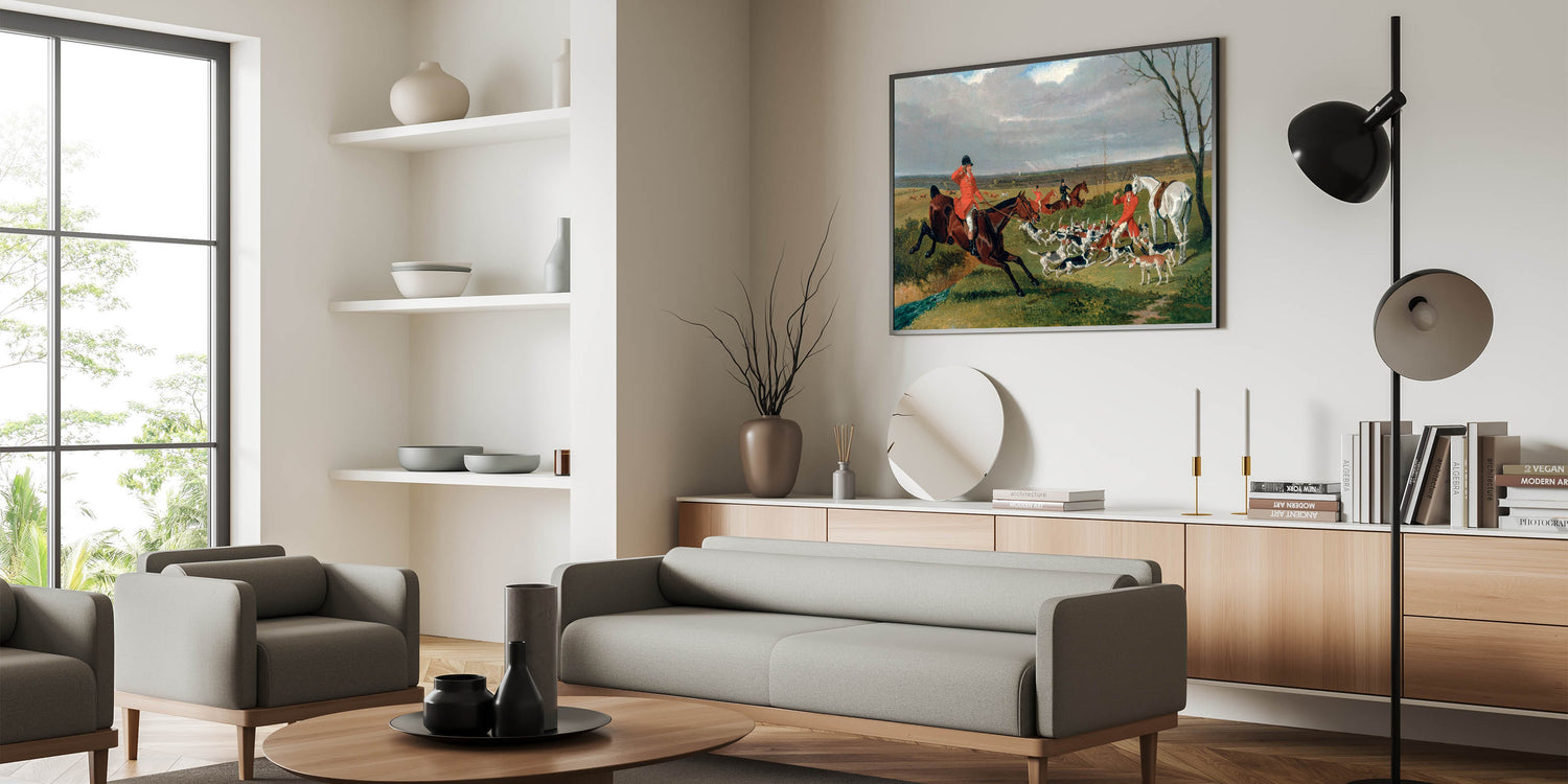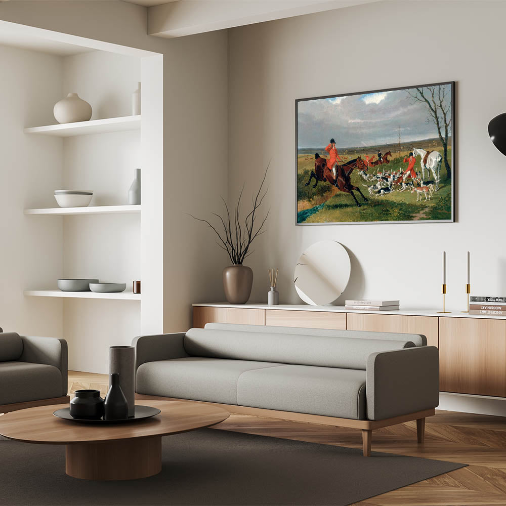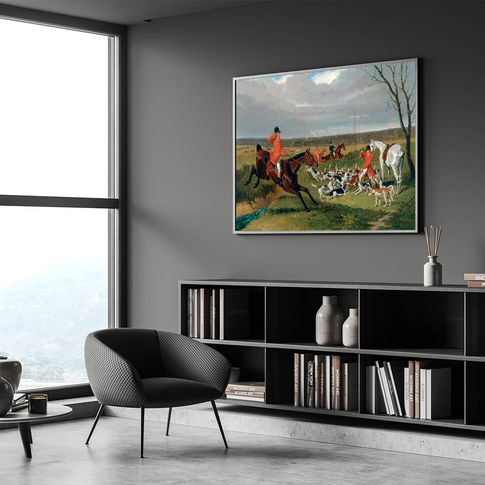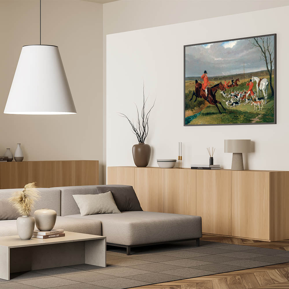 Capture the energy and drama of the hunt with this detailed realism art print showcasing an equestrian scene full of motion and life. This classical realism painting features riders, hounds, and vivid countryside landscapes in rich, natural tones. Perfect for equestrian enthusiasts or those looking for timeless art, this piece brings historical elegance to any setting.