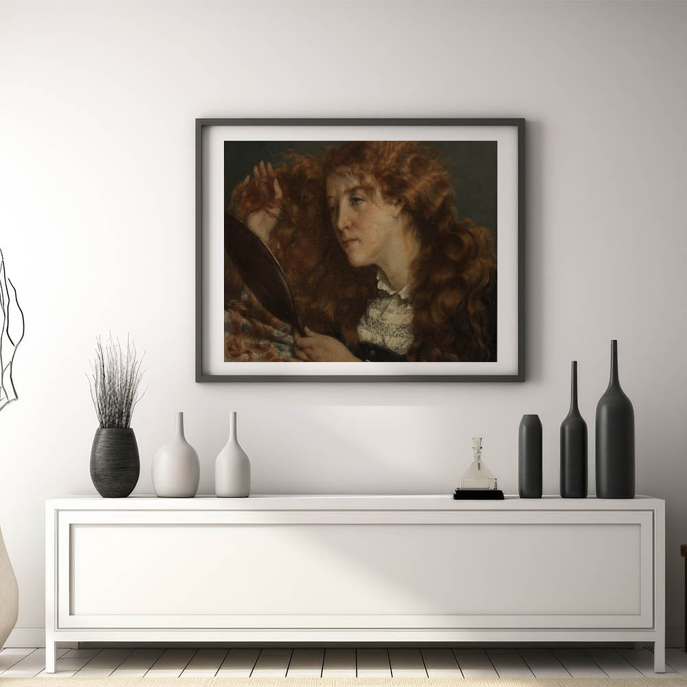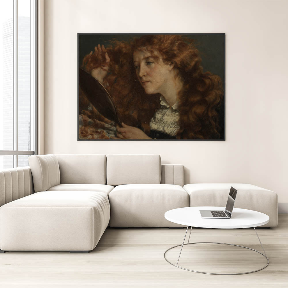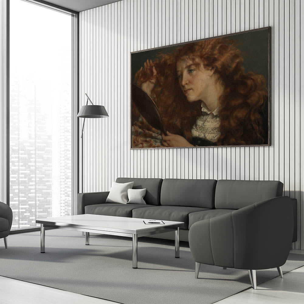 Invite the elegance of classical realism into your home with this captivating portrait. Depicting a young woman with flowing red hair, thoughtfully gazing into a mirror, this artwork captures an intimate and reflective moment with remarkable detail. The artist's mastery of texture and light brings out the depth and richness of her expression, making this piece a timeless addition to any room.