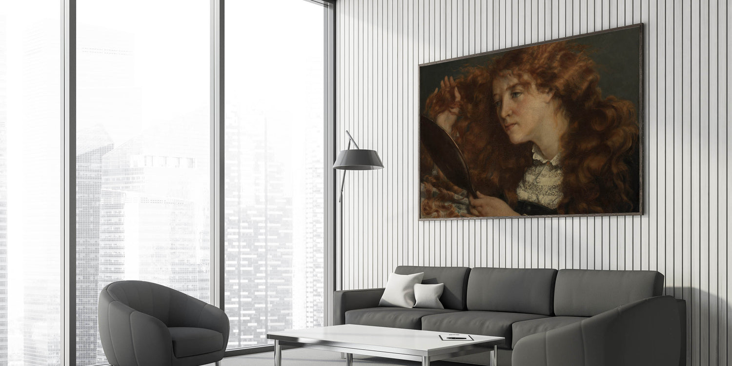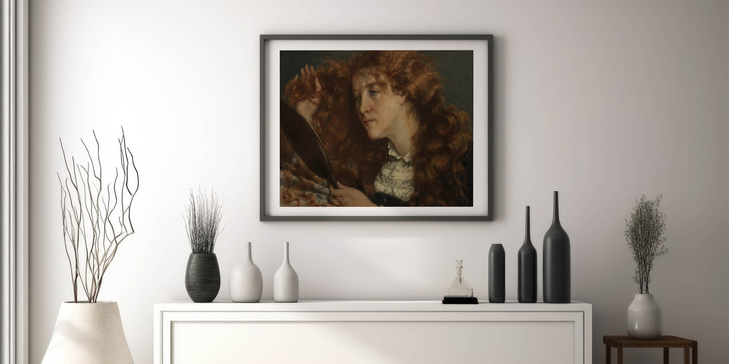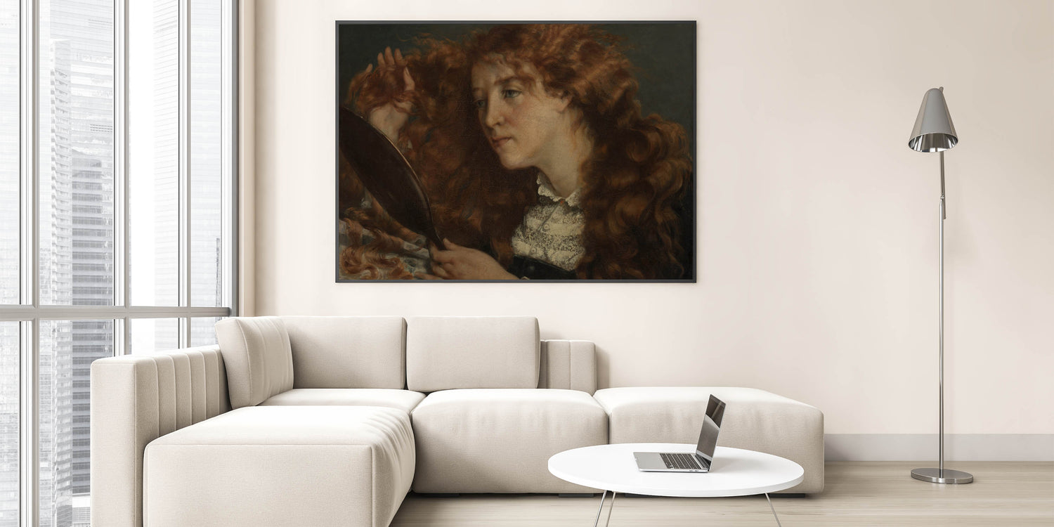 Invite the elegance of classical realism into your home with this captivating portrait. Depicting a young woman with flowing red hair, thoughtfully gazing into a mirror, this artwork captures an intimate and reflective moment with remarkable detail. The artist's mastery of texture and light brings out the depth and richness of her expression, making this piece a timeless addition to any room.