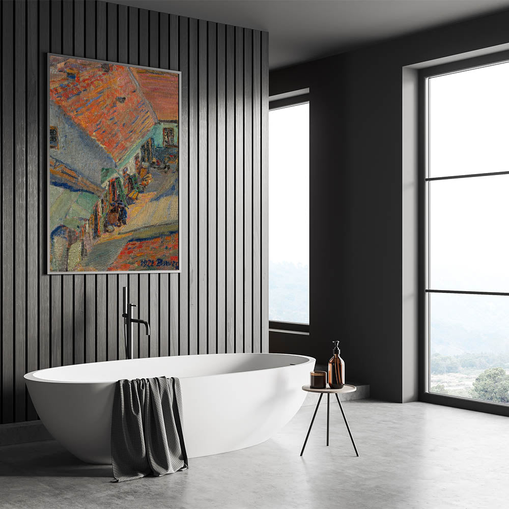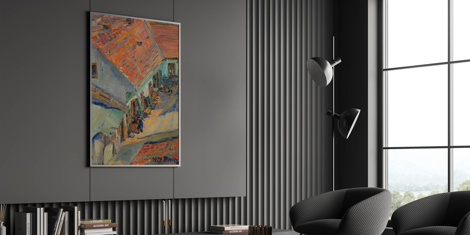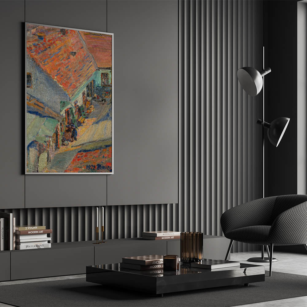 Enhance your decor with "In Front of the House" by Konštantín Bauer, a vibrant piece from our Realism Art Prints collection. This dynamic urban scene captures a view from above, with richly textured rooftops in warm reds and oranges, contrasted by cool shades of blue and green on the buildings below. Ideal for adding a touch of rustic charm and urban vibrancy, this artwork makes a unique statement in any room.