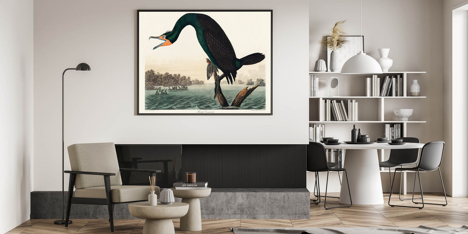 Celebrate the beauty of nature with John James Audubon’s Florida Cormorant, an iconic piece from his Birds of America series. This stunning artwork captures the vivid details of the cormorant perched on a branch against a serene water and forest backdrop. The intricate brushstrokes and lifelike depiction showcase Audubon’s mastery of Romanticism’s love for the natural world. The vibrant green plumage, accented by bold orange and black tones, makes this piece a timeless masterpiece.