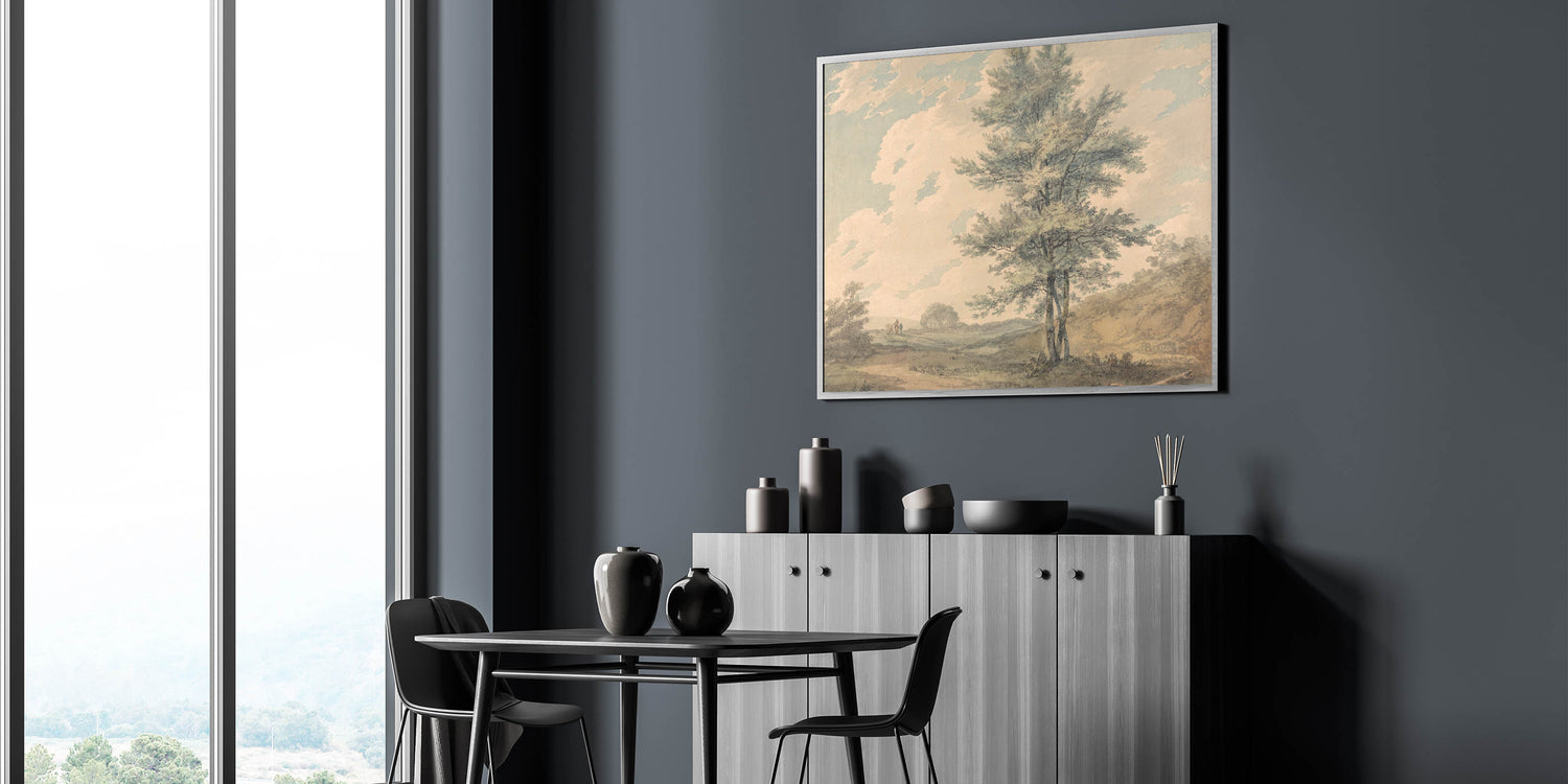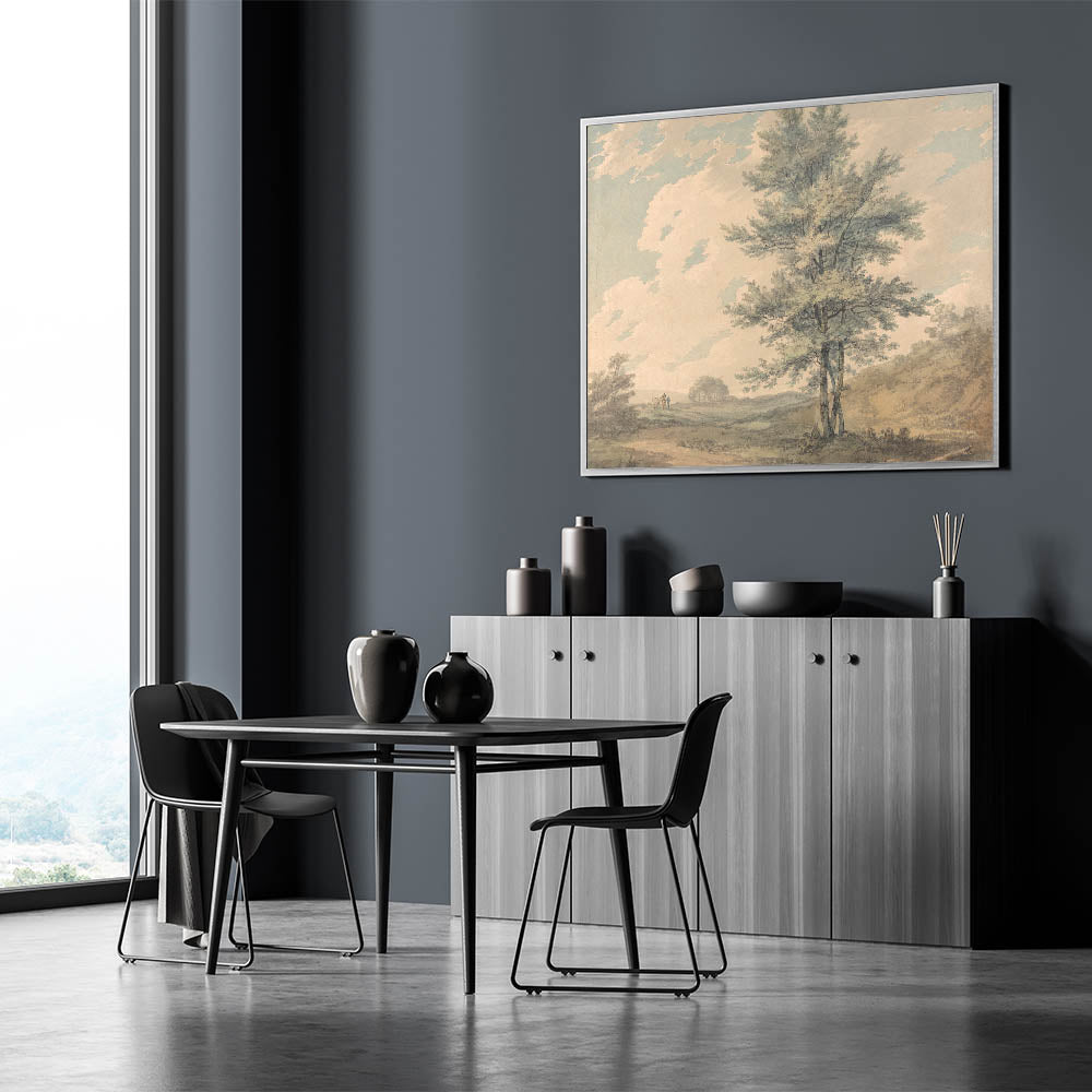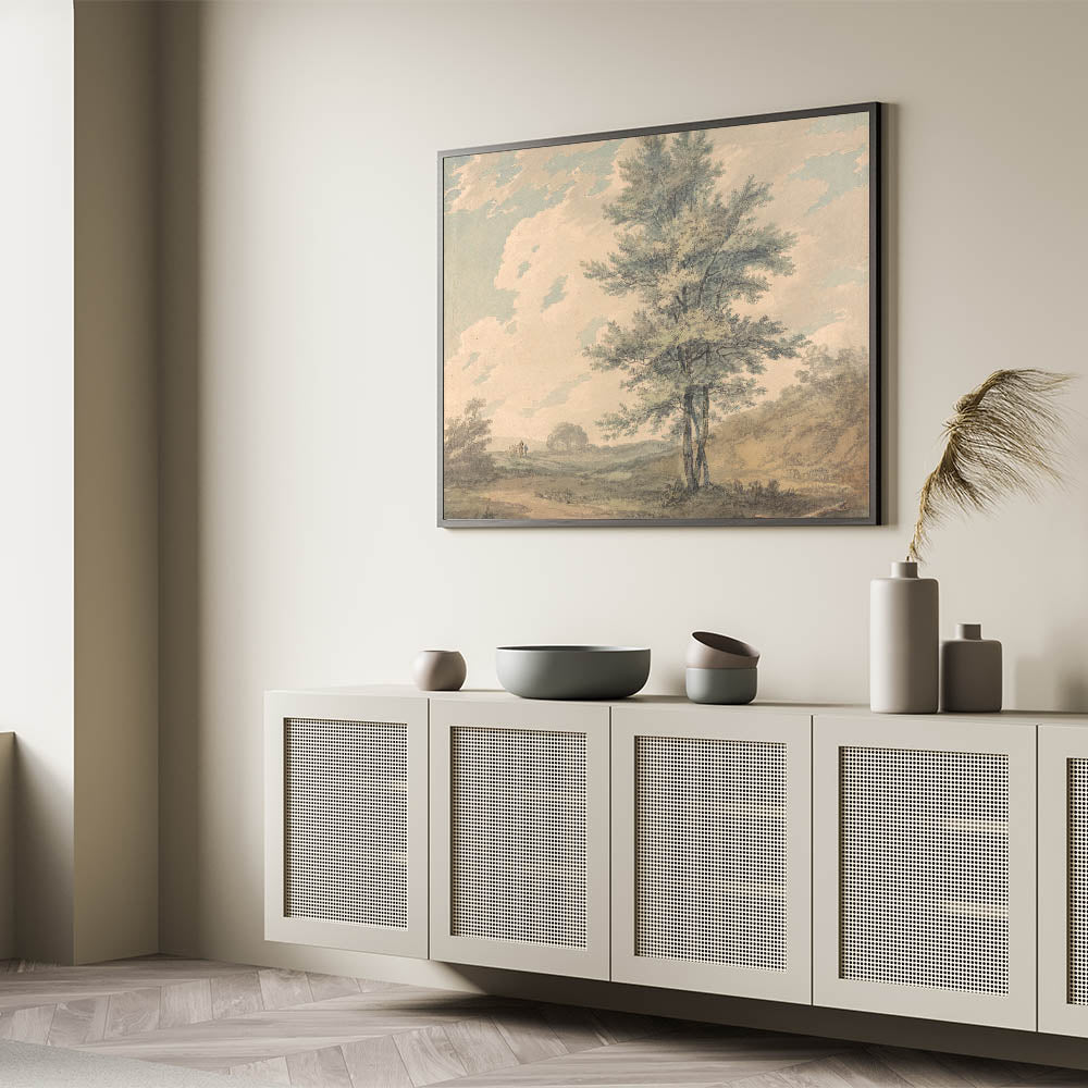 Embrace the tranquility of Romanticism with this beautiful artwork, Landscape with Trees and Figures. This piece masterfully captures the peaceful essence of nature, featuring a towering tree surrounded by a serene countryside scene. Subtle details of the figures in the distance evoke a sense of harmony and connection to nature, a hallmark of the Romantic art movement. The soft, muted tones of green, beige, and pale blue give this artwork a calming and timeless quality, making it ideal for any home or office decor.