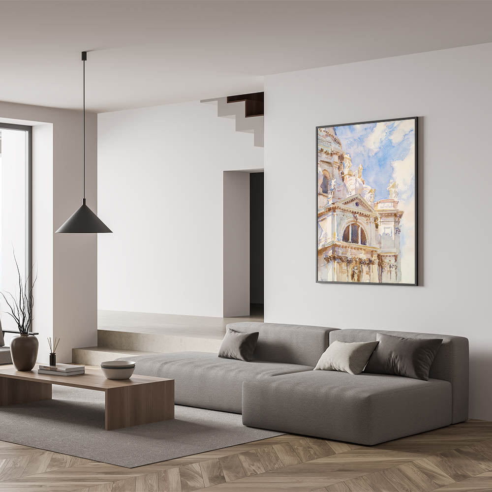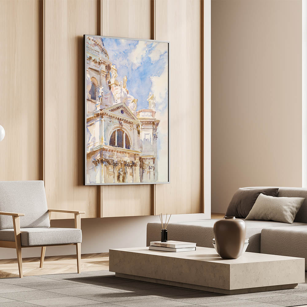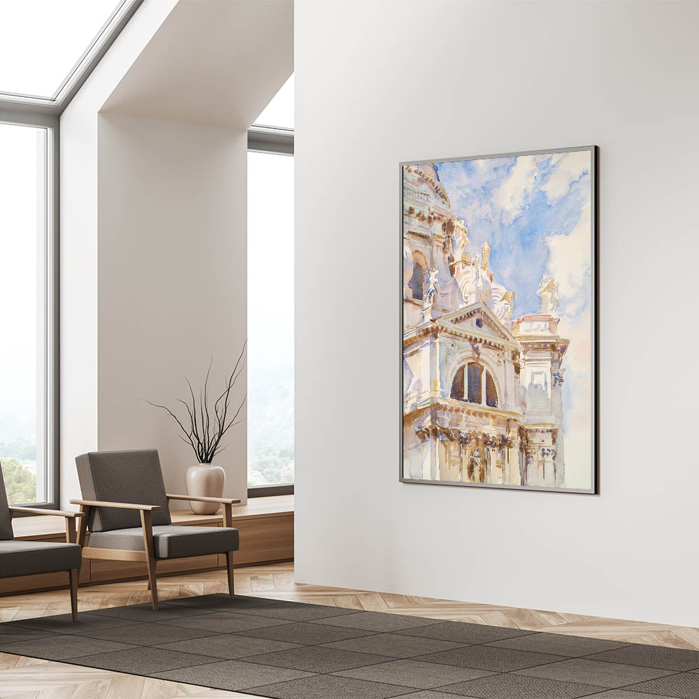 Celebrate the timeless elegance of Romanticism style wall art with John Singer Sargent’s stunning watercolor, The Salute, Venice (ca. 1904–1907). This artwork captures the grandeur of Venetian architecture bathed in soft, natural light. The intricate details of the Basilica di Santa Maria della Salute’s ornate façade contrast beautifully with the light blue sky, showcasing Sargent’s mastery in bringing life to architectural marvels through his expressive brushwork.