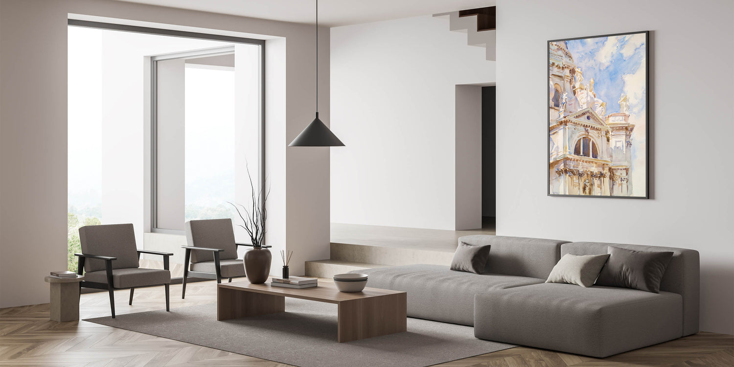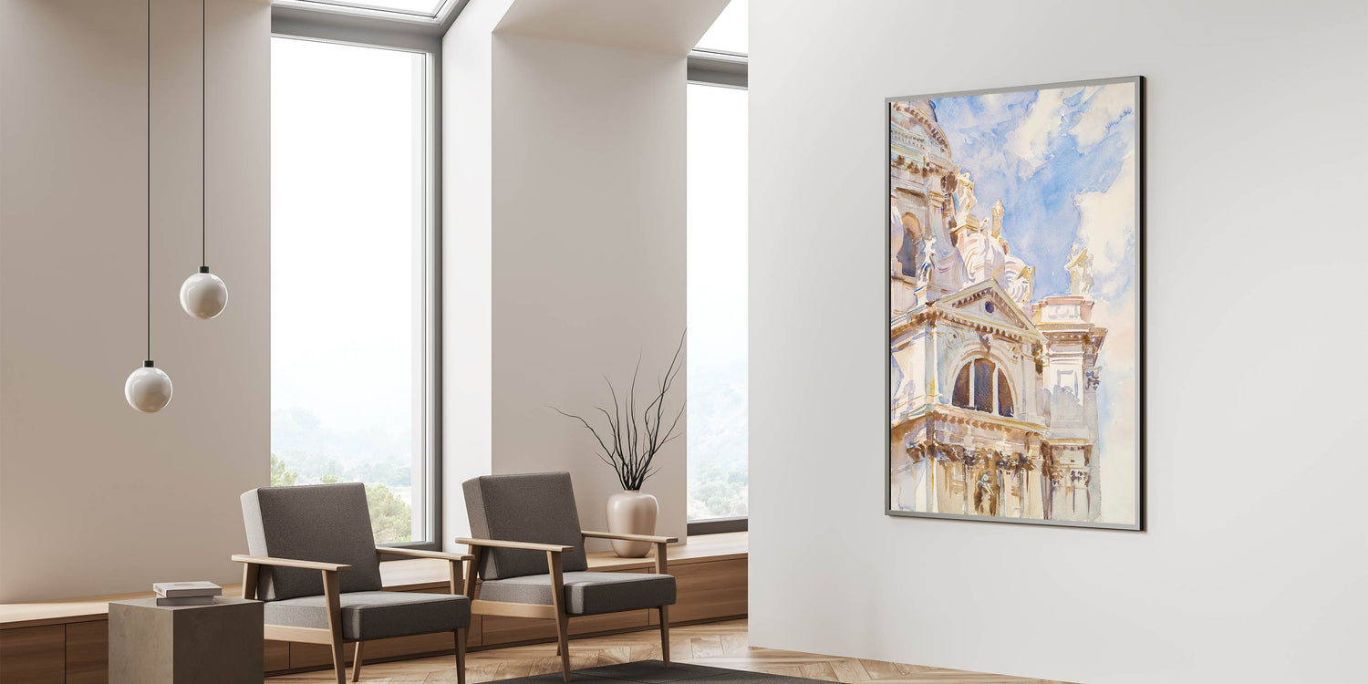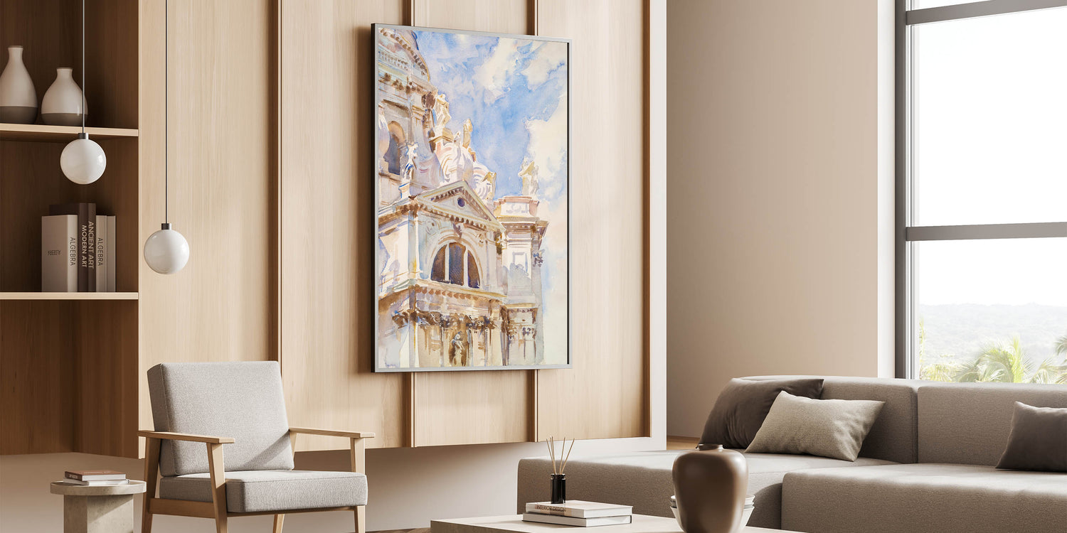 Celebrate the timeless elegance of Romanticism style wall art with John Singer Sargent’s stunning watercolor, The Salute, Venice (ca. 1904–1907). This artwork captures the grandeur of Venetian architecture bathed in soft, natural light. The intricate details of the Basilica di Santa Maria della Salute’s ornate façade contrast beautifully with the light blue sky, showcasing Sargent’s mastery in bringing life to architectural marvels through his expressive brushwork.