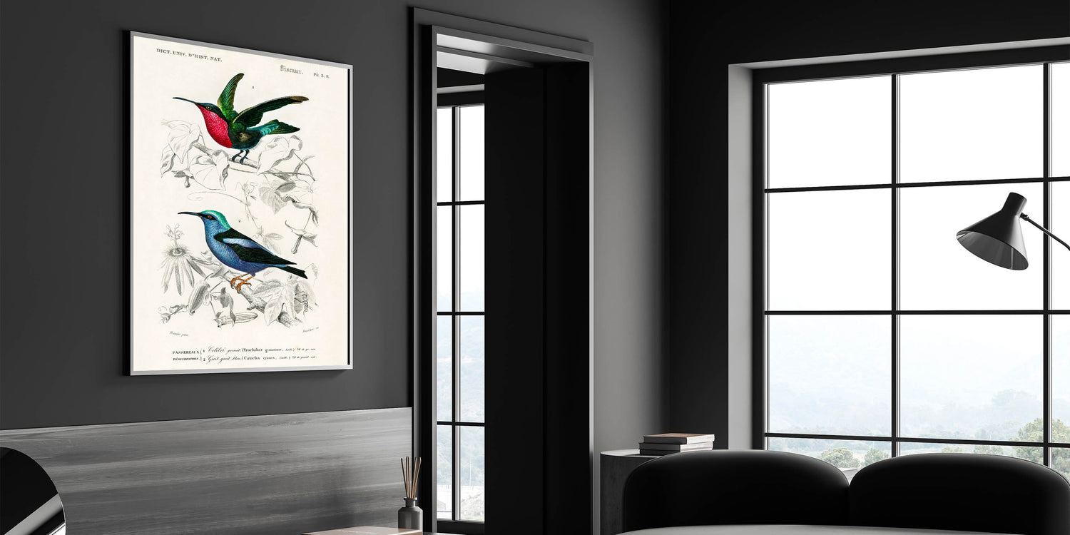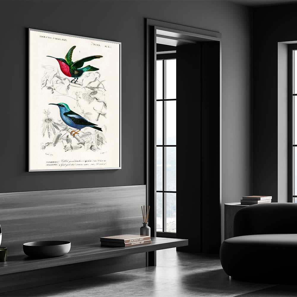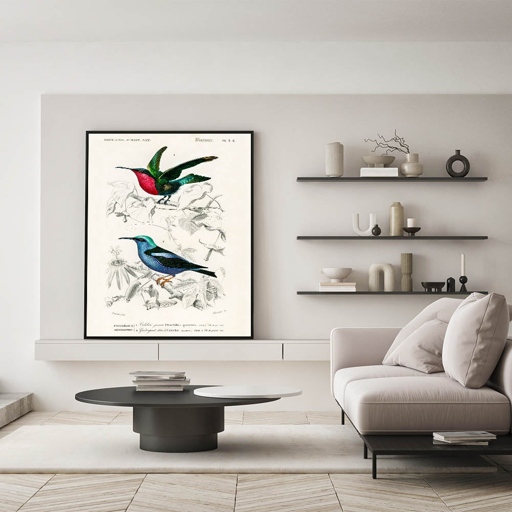 Add a touch of elegance and vibrancy to your home with this stunning Romanticism style wall art, showcasing two species of hummingbirds in intricate detail. Illustrated by Charles Dessalines d'Orbigny, this artwork highlights the dazzling beauty of the Trochilus grenatinus and Caerulea cyanea, featuring radiant colors and delicate feathers. The blend of scientific precision and artistic brilliance reflects the Romantic era's deep appreciation for nature’s beauty.