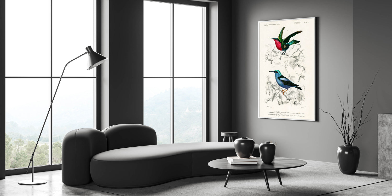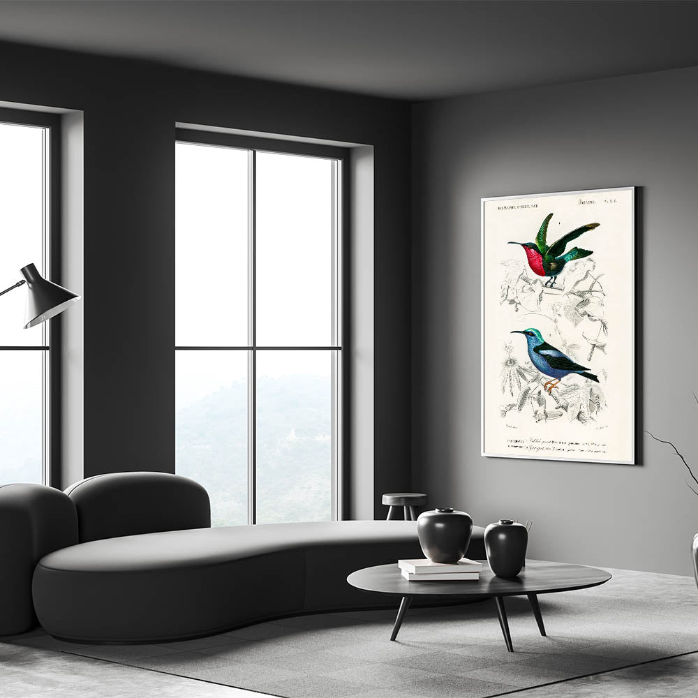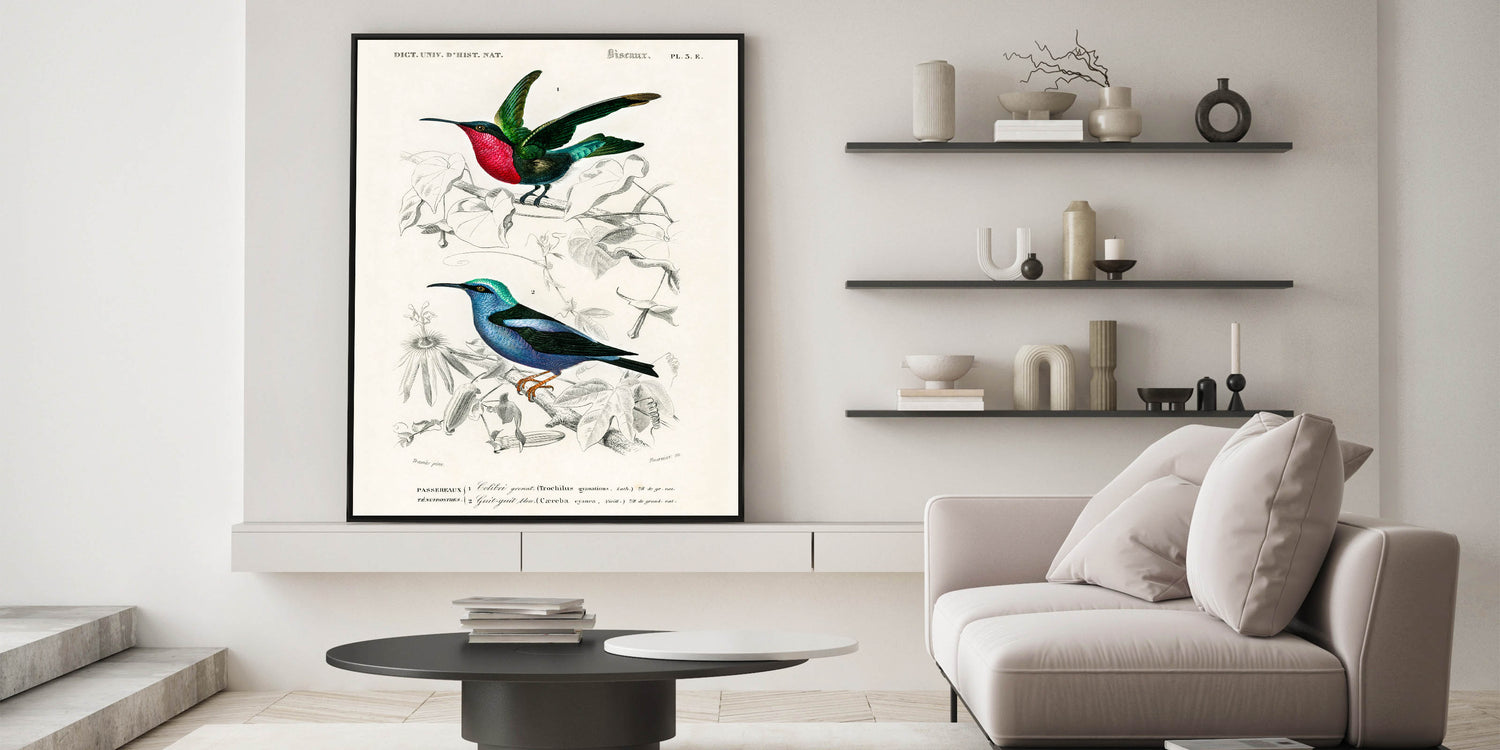 Add a touch of elegance and vibrancy to your home with this stunning Romanticism style wall art, showcasing two species of hummingbirds in intricate detail. Illustrated by Charles Dessalines d'Orbigny, this artwork highlights the dazzling beauty of the Trochilus grenatinus and Caerulea cyanea, featuring radiant colors and delicate feathers. The blend of scientific precision and artistic brilliance reflects the Romantic era's deep appreciation for nature’s beauty.