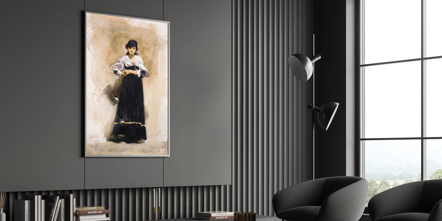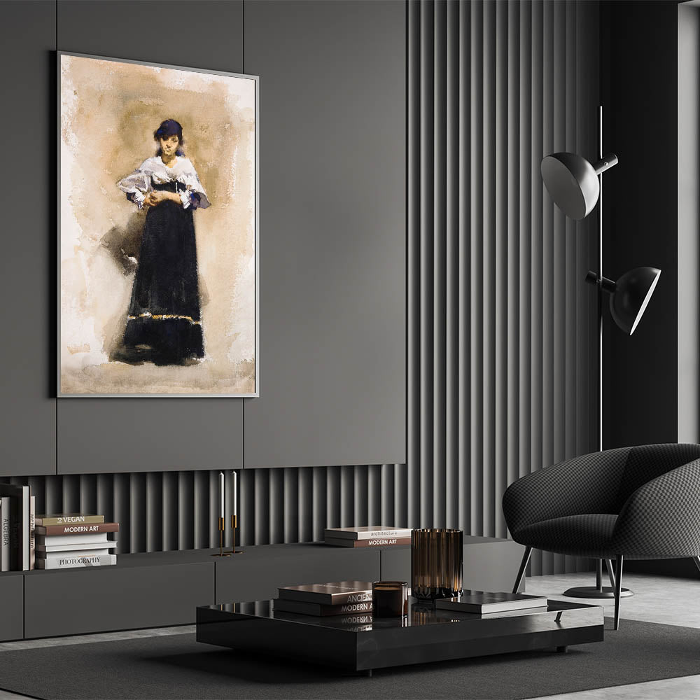 Discover the grace and mystery of "Young Woman with a Black Skirt" by John Singer Sargent, a subtle yet evocative portrait that embodies the spirit of Romanticism. Painted with delicate watercolor techniques, this piece captures the quiet introspection of its subject, blending soft textures with a refined color palette. The muted tones and elegant composition make this artwork a stunning addition to romantic art for home decor.