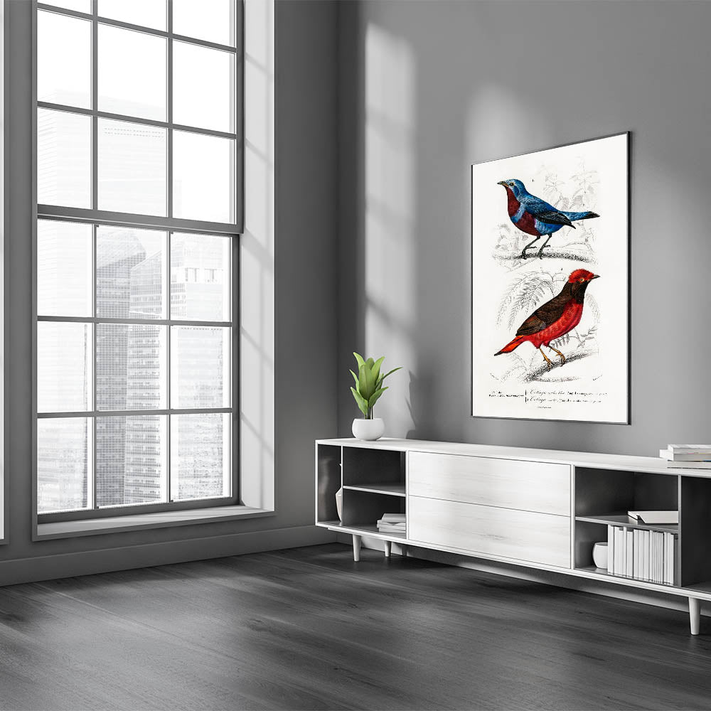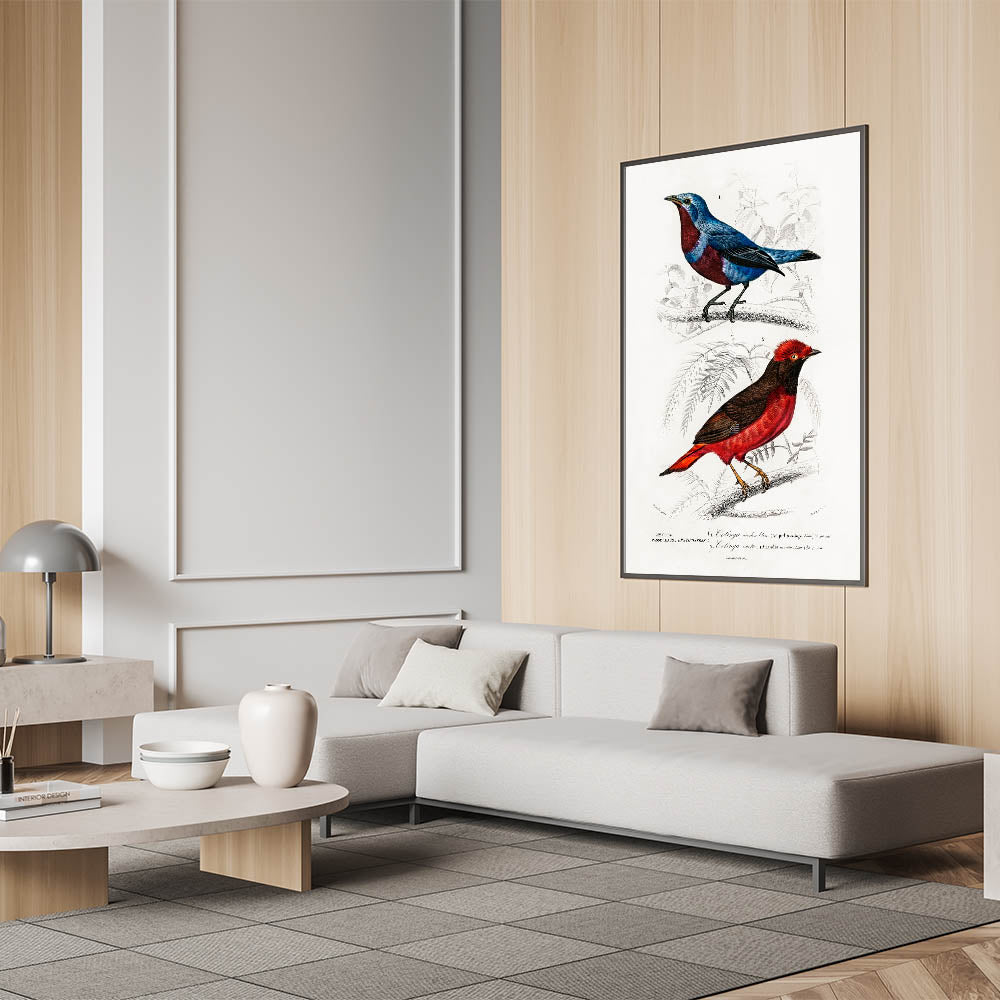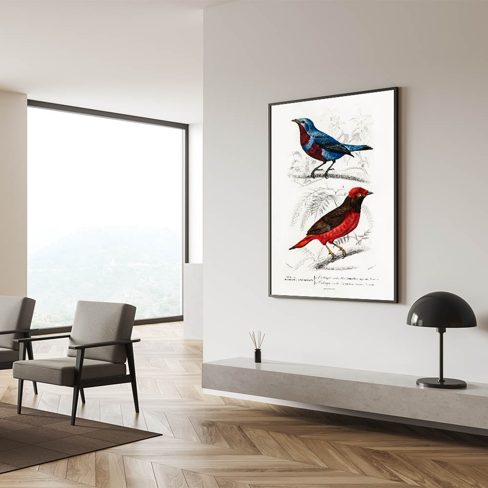 Celebrate the beauty of exotic wildlife with these Romanticism style wall art bird illustrations by Charles Dessalines d’Orbigny. This vibrant piece features two stunning birds, the Blue Cotinga (Cotinga vereda) and the Scarlet Cotinga (Cotinga cottle), perched elegantly on branches. The intricate detailing and vivid colors of their feathers reflect the Romantic era's dedication to exploring the wonders of nature, blending scientific accuracy with artistic beauty.