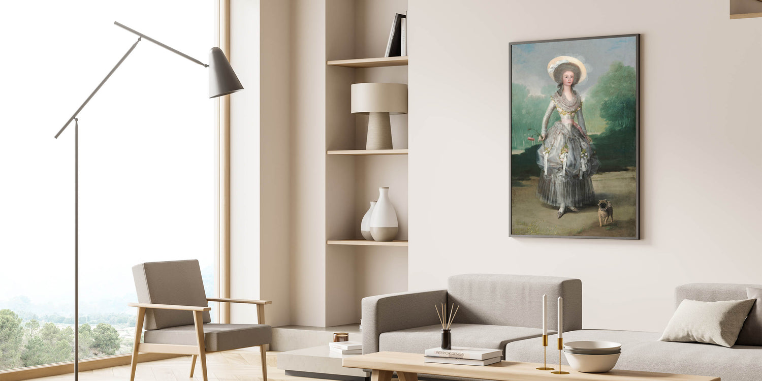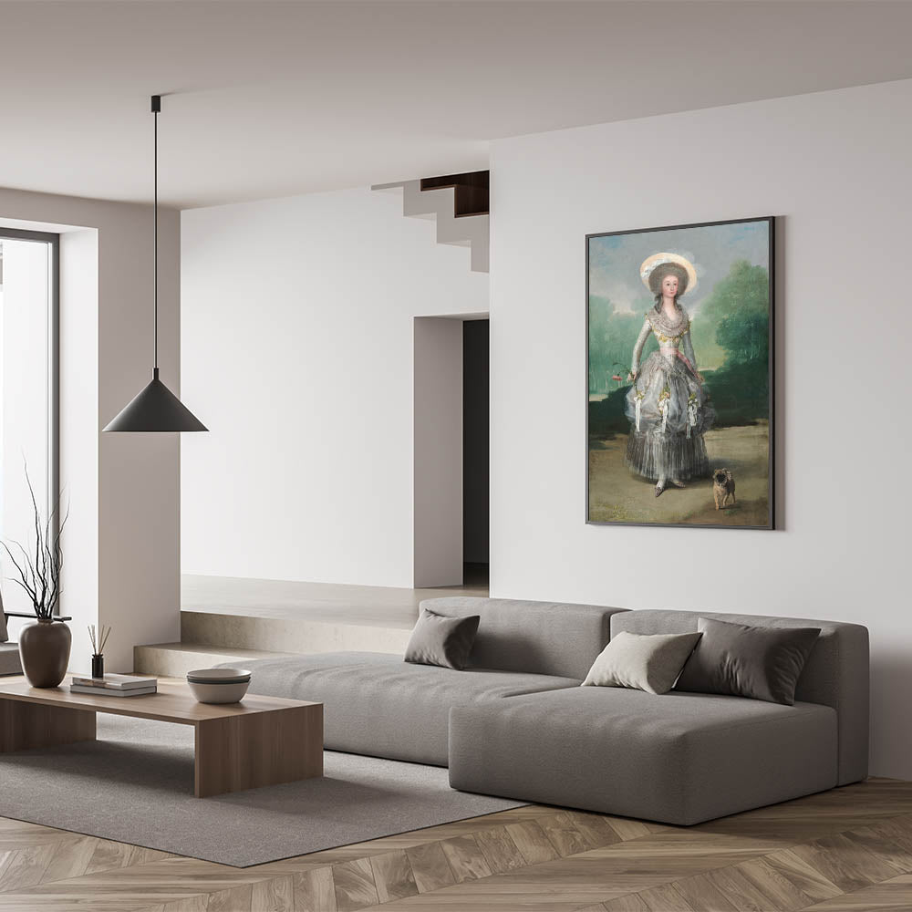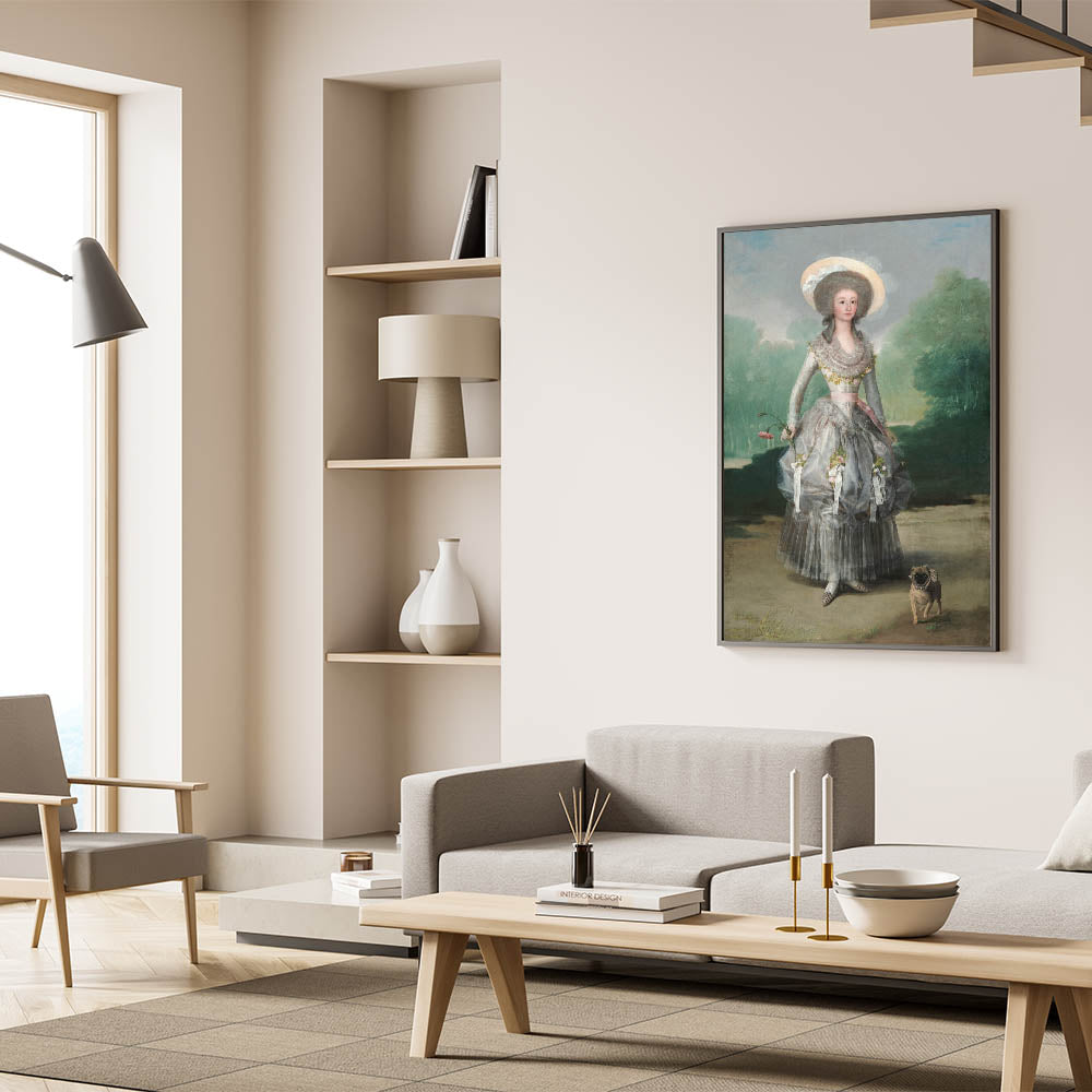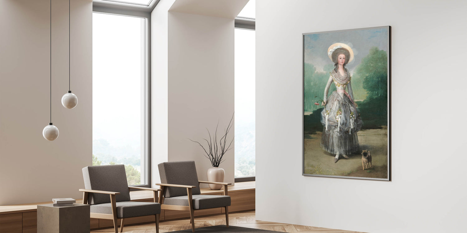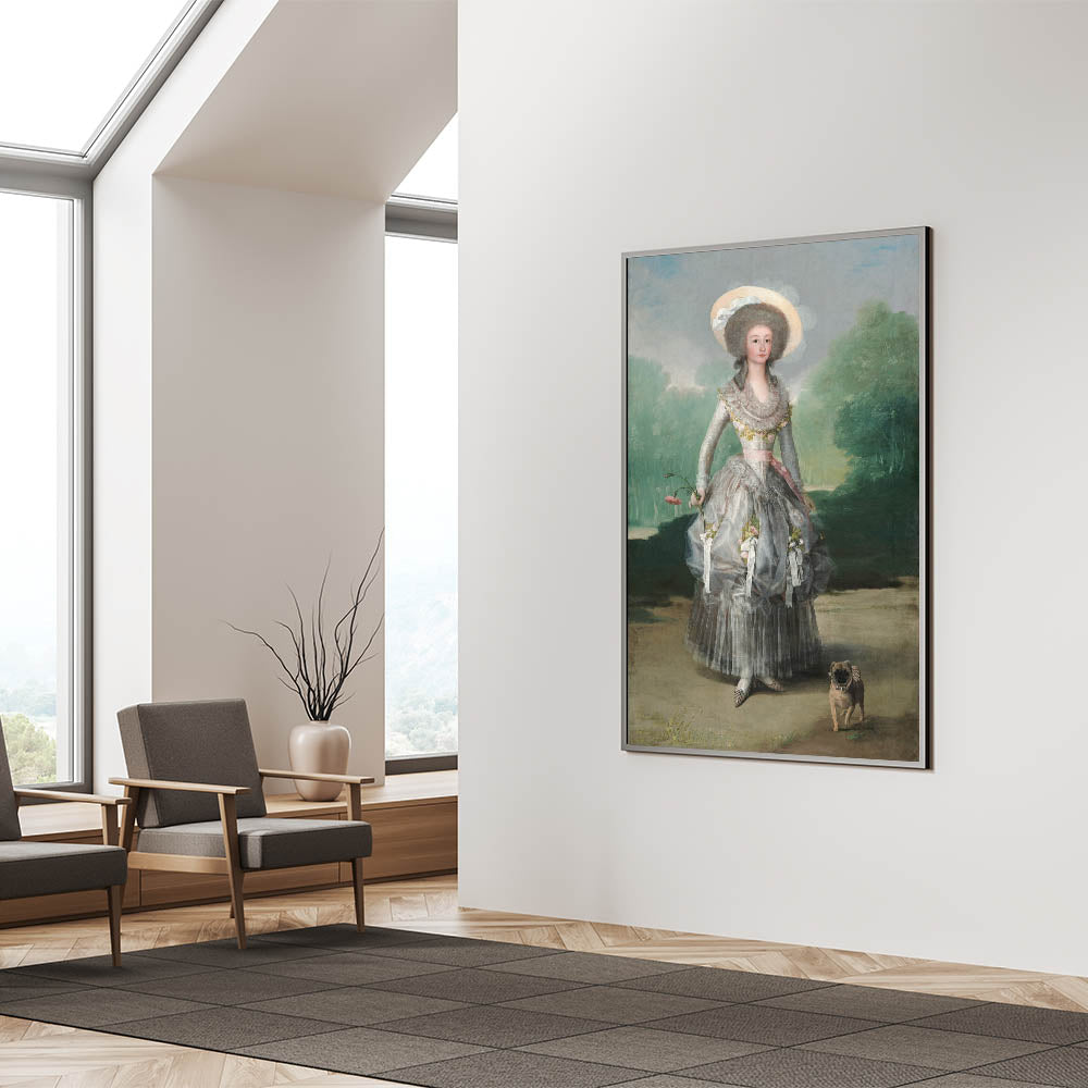 Step into the elegance of 18th-century Spanish aristocracy with "The Marquesa de Pontejos" by Francisco de Goya, a hallmark of Romanticism style wall art. This captivating portrait depicts the Marquesa in a delicate silver gown adorned with floral details, holding a pink carnation as she walks alongside her small dog. Set against a lush green landscape, the painting radiates grace, charm, and refinement, perfectly reflecting the classic art of the Romantic era.