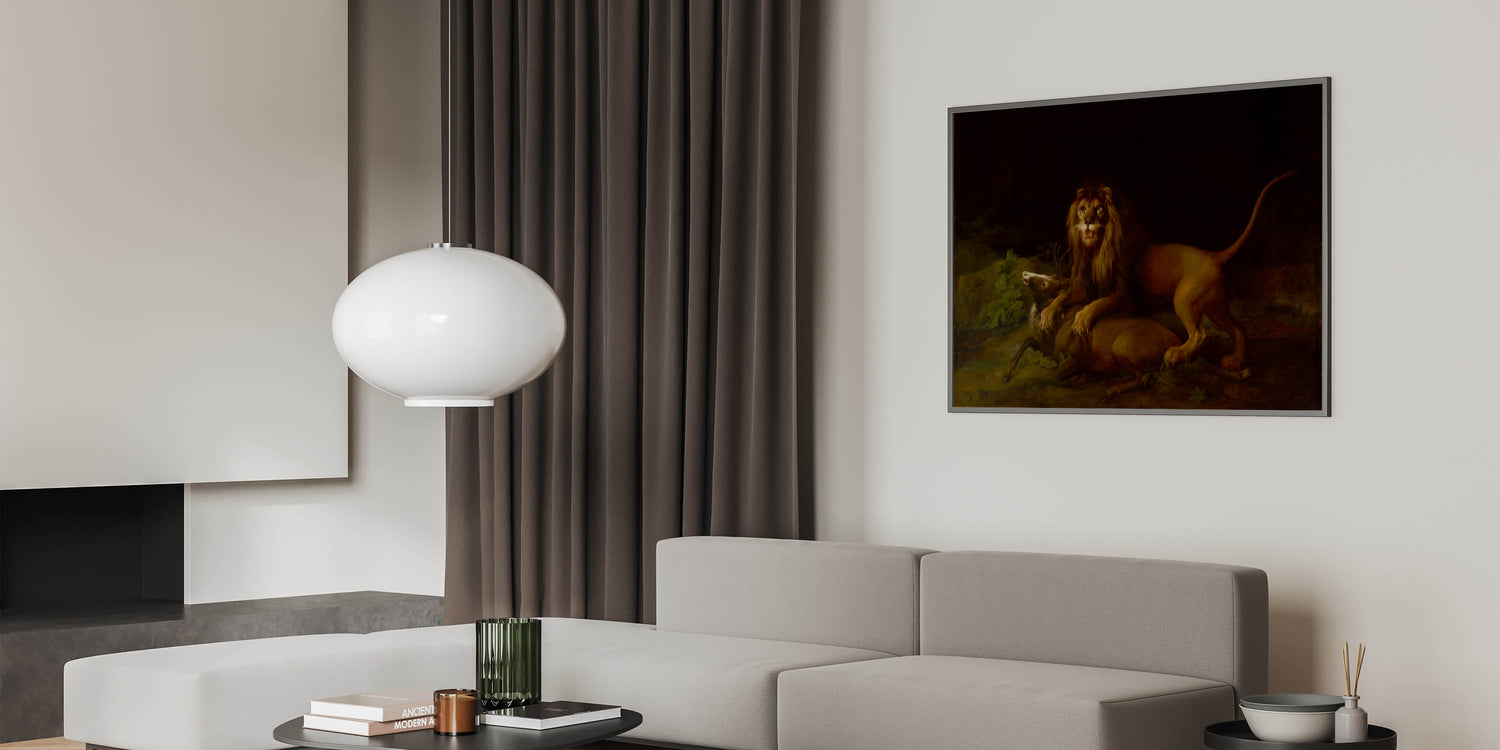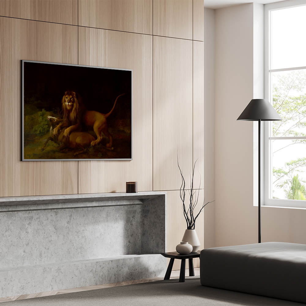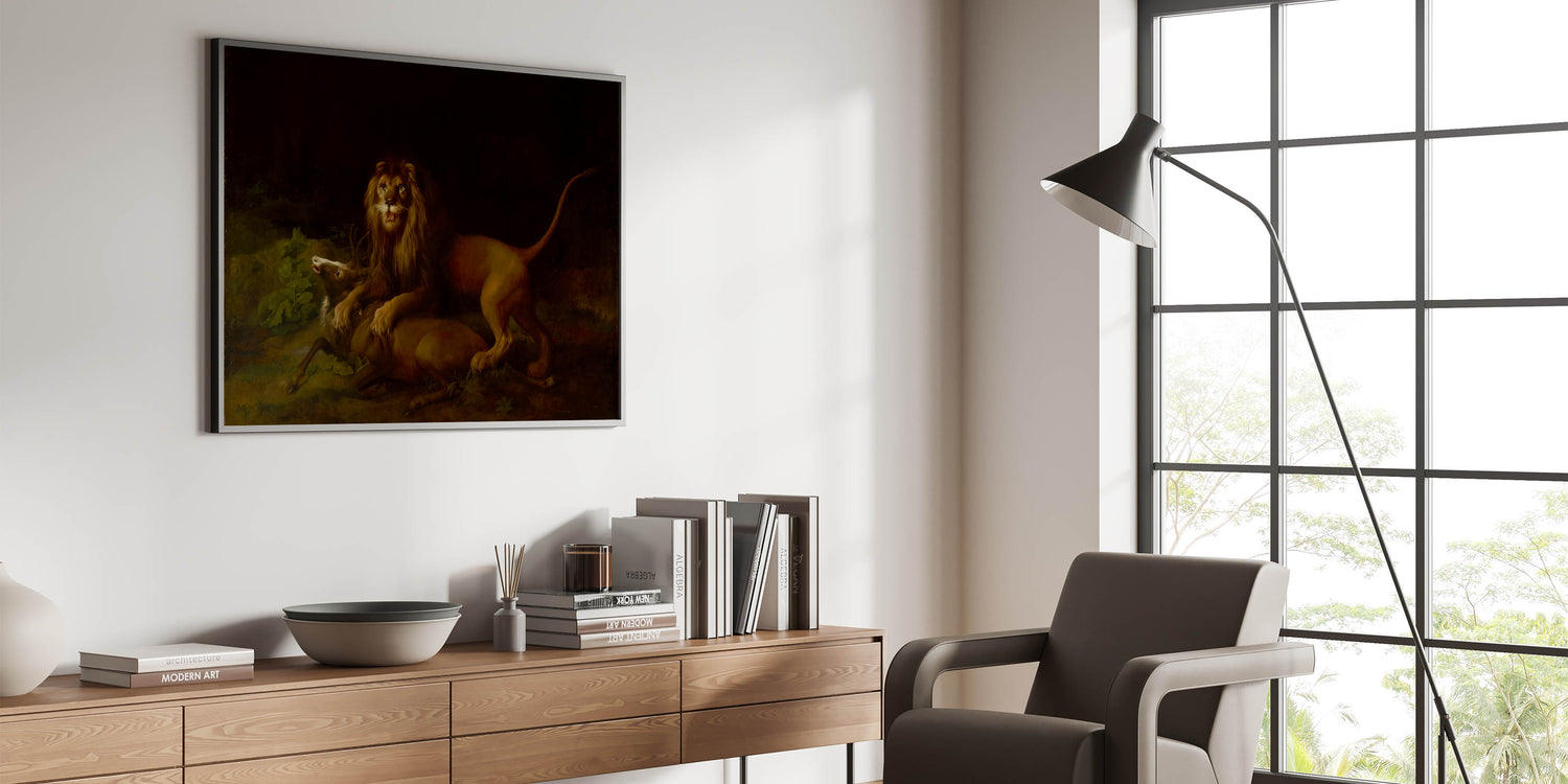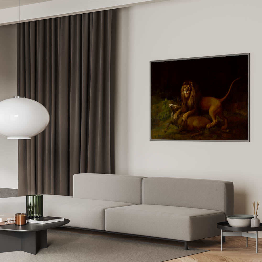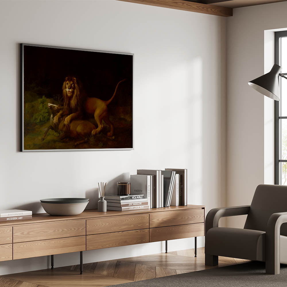This Romanticism-style wall art embodies the era's fascination with the natural world, exploring themes of strength, vulnerability, and the sublime. Perfect for wildlife enthusiasts and art lovers alike, "A Lion Attacking a Stag" is a timeless addition to any collection.