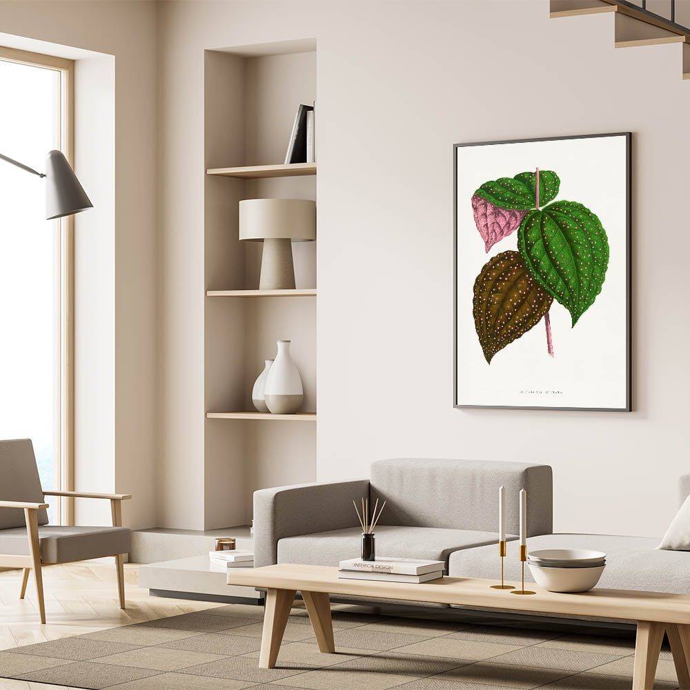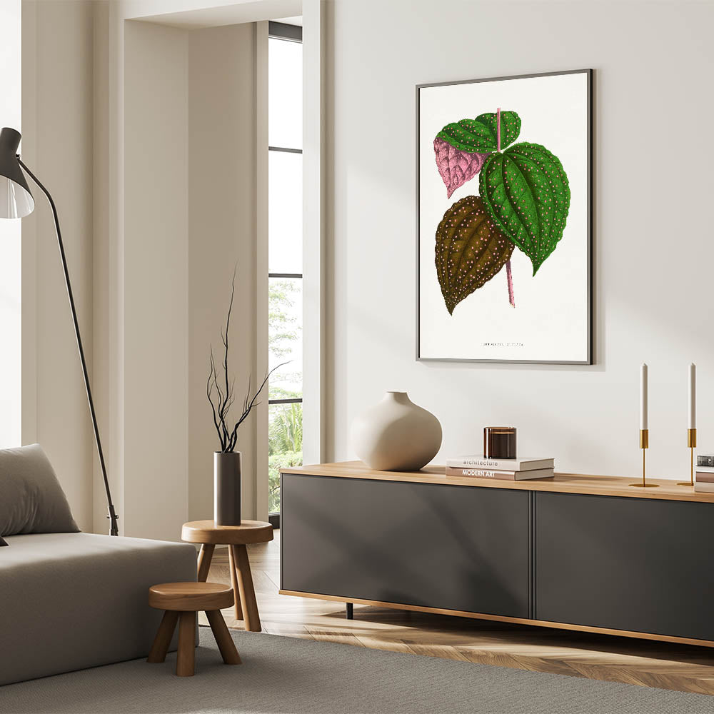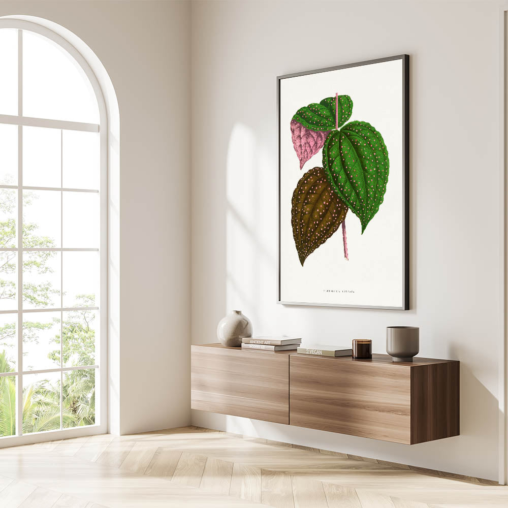 Add a touch of botanical elegance to your décor with this intricate Romanticism style wall art, featuring the Bertolonia Guttata leaf illustration by Alexander Francis Lydon and Benjamin Fawcett. This stunning artwork, taken from the 1865 edition of Les Plantes à Feuillage Coloré, highlights the natural beauty of this exotic plant species with its vibrant green, pink, and brown tones adorned with delicate spotted patterns. The meticulous detailing reflects the scientific precision and artistic charm of the classic art of the Romantic era.