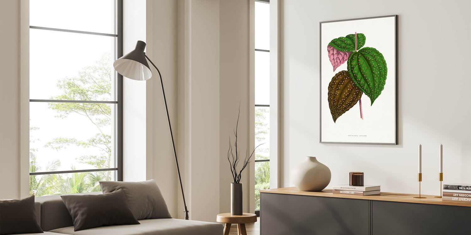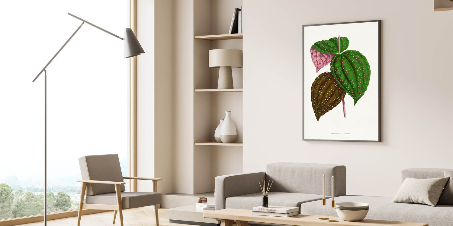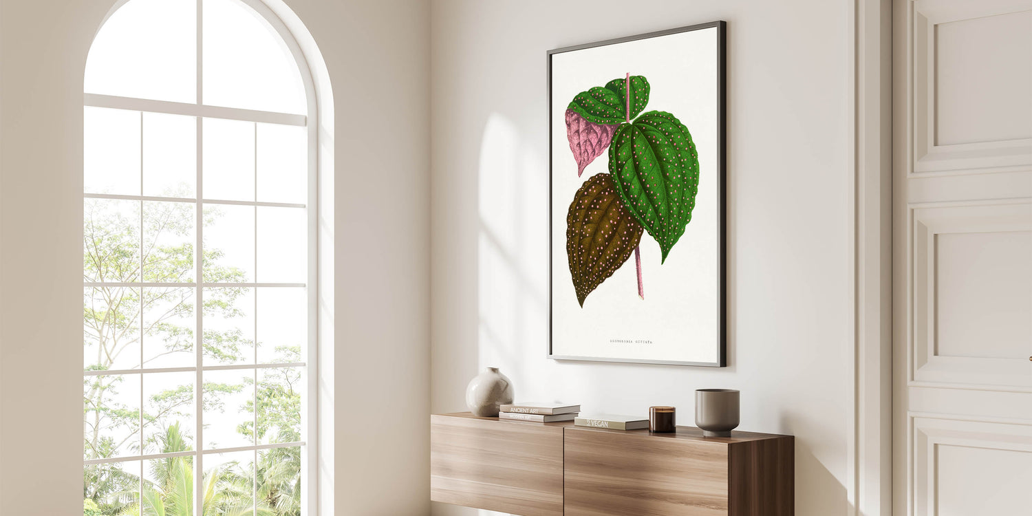Add a touch of botanical elegance to your décor with this intricate Romanticism style wall art, featuring the Bertolonia Guttata leaf illustration by Alexander Francis Lydon and Benjamin Fawcett. This stunning artwork, taken from the 1865 edition of Les Plantes à Feuillage Coloré, highlights the natural beauty of this exotic plant species with its vibrant green, pink, and brown tones adorned with delicate spotted patterns. The meticulous detailing reflects the scientific precision and artistic charm of the classic art of the Romantic era.