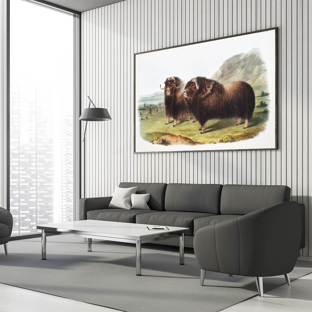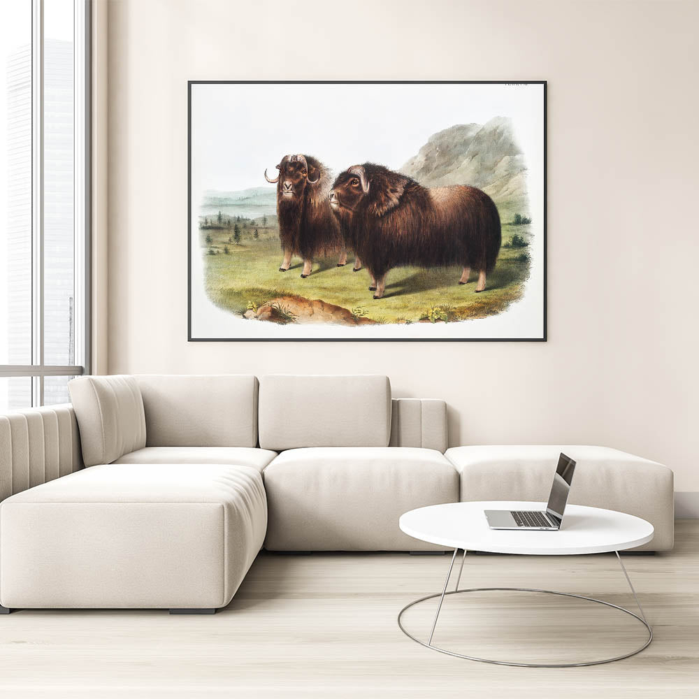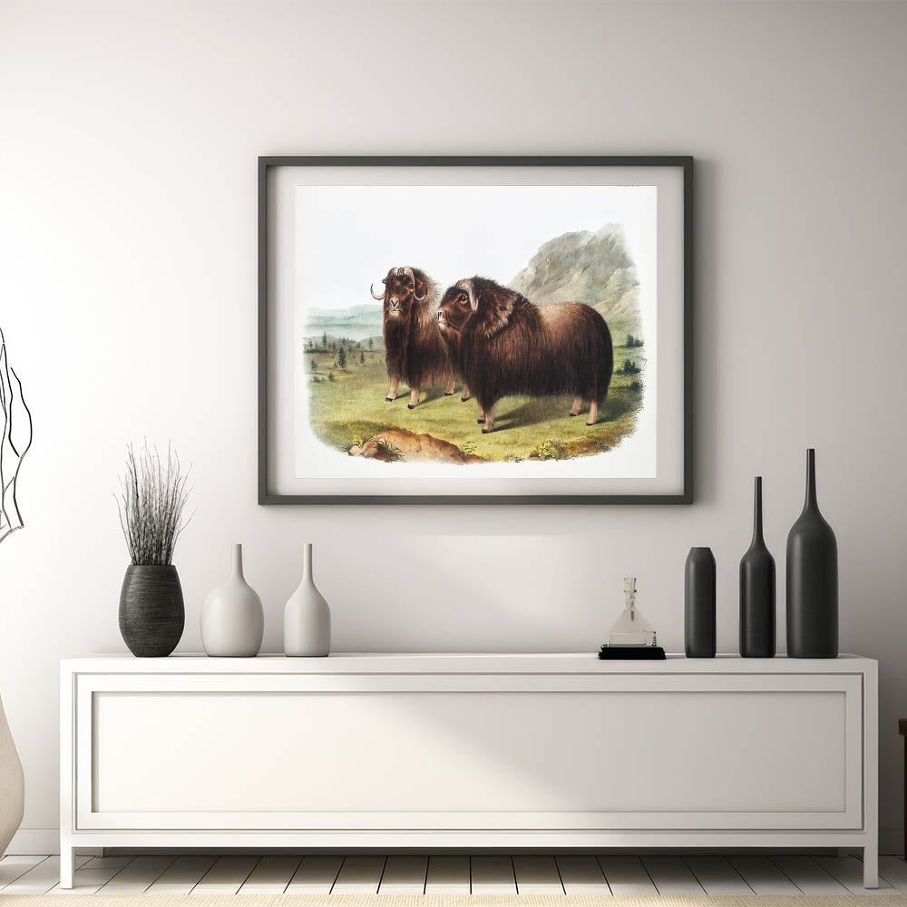 Bring the timeless charm of Romanticism style wall art into your space with this exquisite depiction of Musk Oxen, illustrated by John Woodhouse Audubon in 1845. This artwork beautifully captures the natural grace of these majestic creatures amidst a serene, emotional landscape, reflecting the classic art of the Romantic era. Perfect for those seeking historic and cultural wall decor, this piece adds sophistication and depth to any interior.