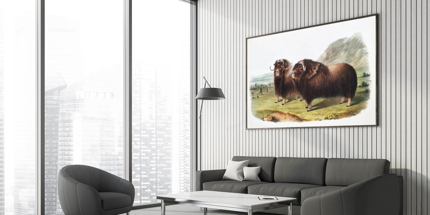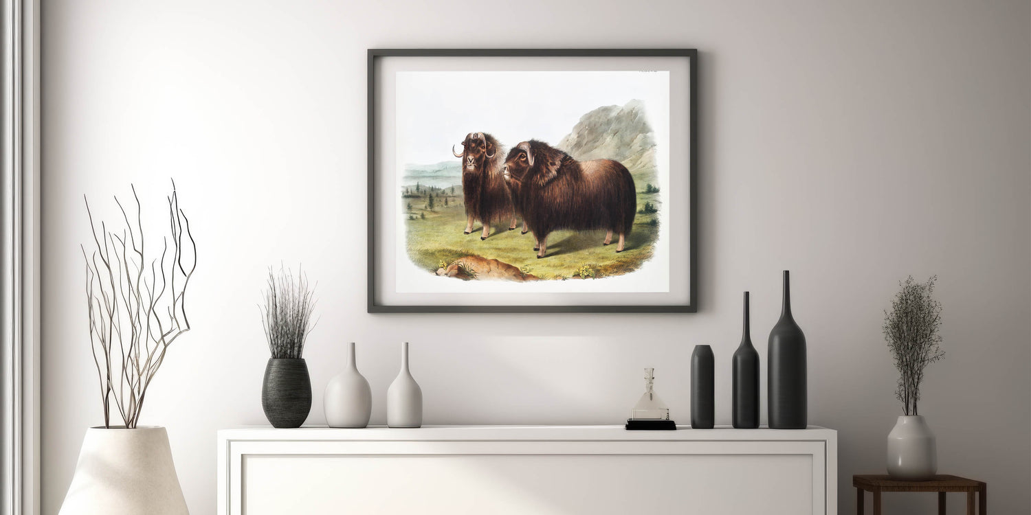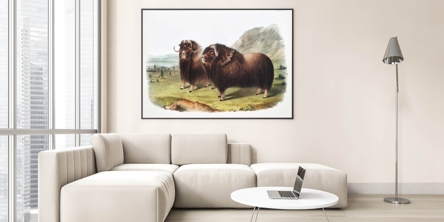 Bring the timeless charm of Romanticism style wall art into your space with this exquisite depiction of Musk Oxen, illustrated by John Woodhouse Audubon in 1845. This artwork beautifully captures the natural grace of these majestic creatures amidst a serene, emotional landscape, reflecting the classic art of the Romantic era. Perfect for those seeking historic and cultural wall decor, this piece adds sophistication and depth to any interior.
