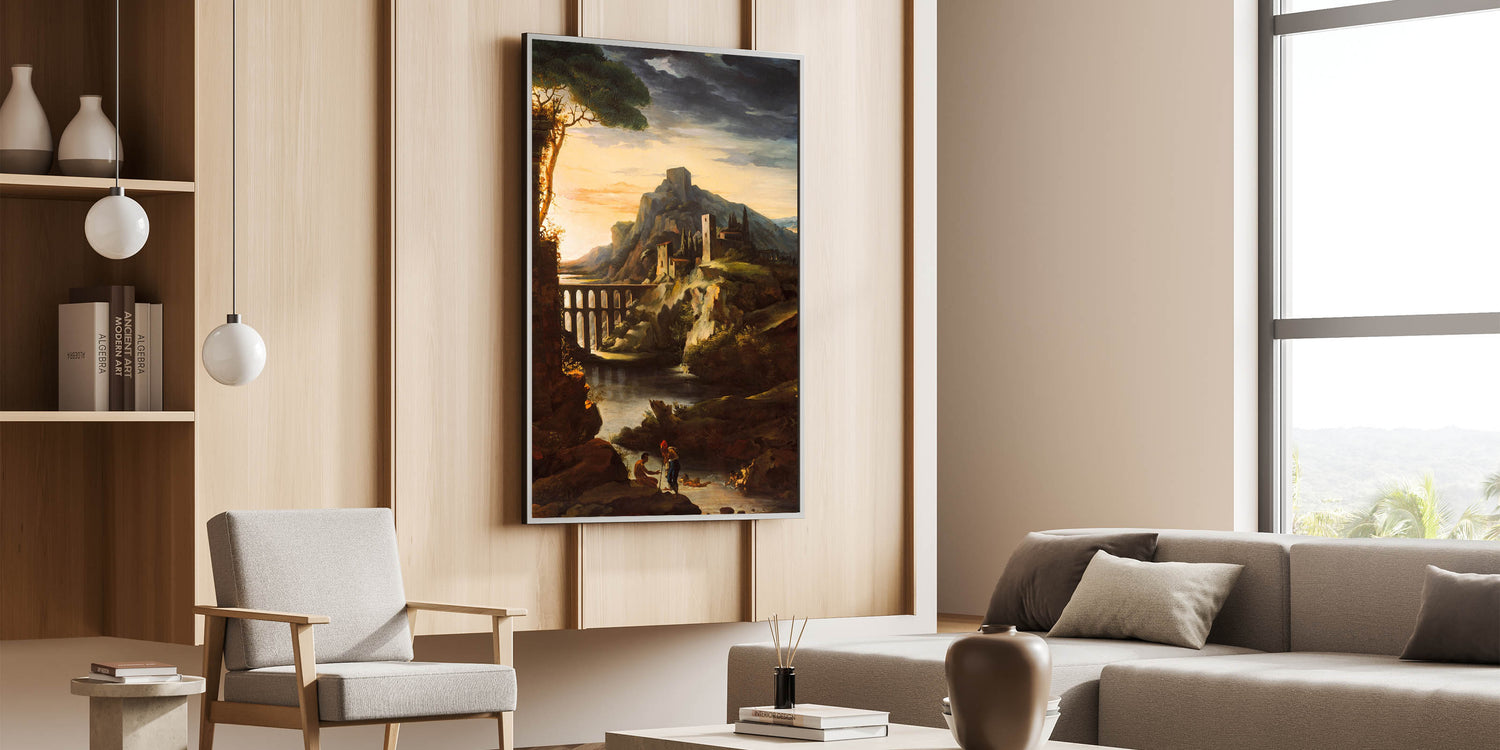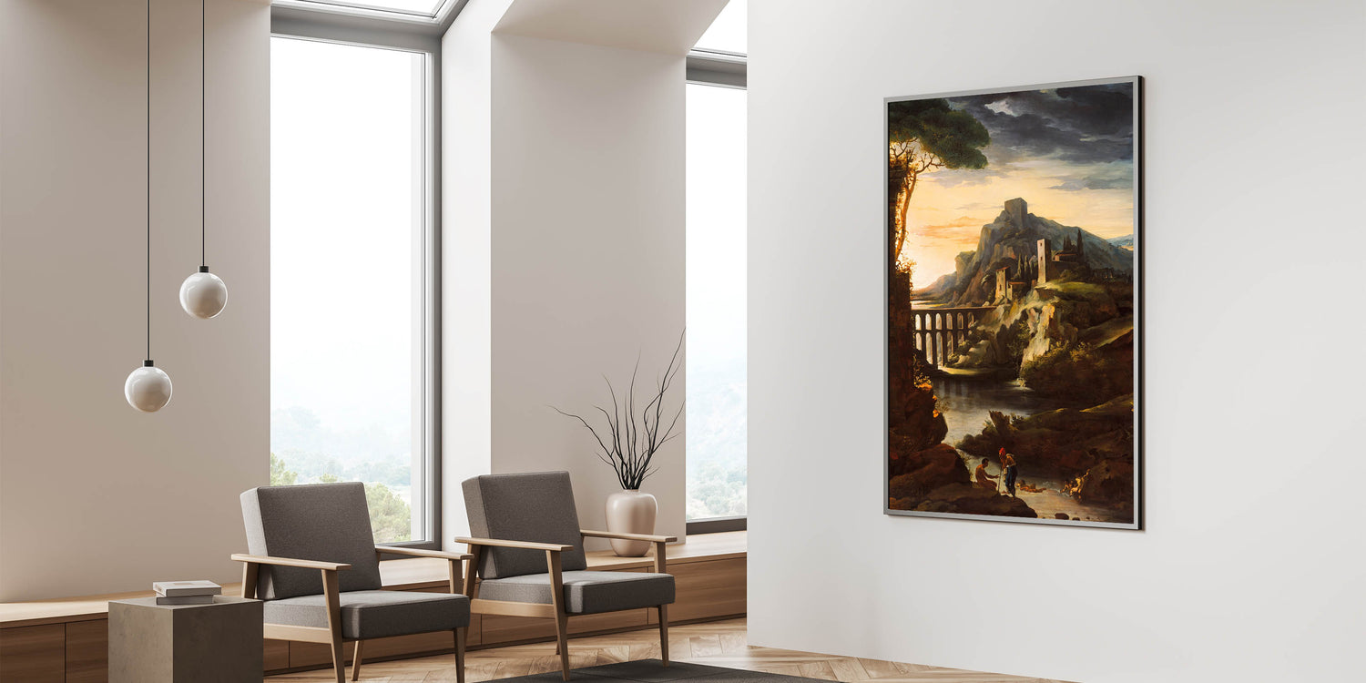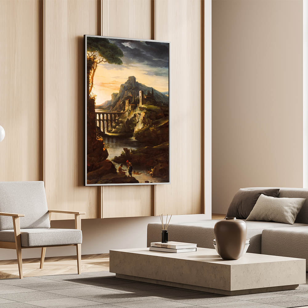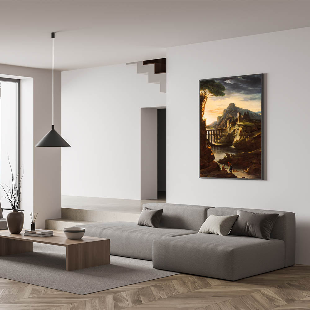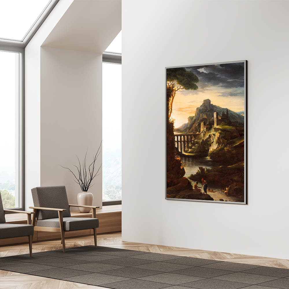 Immerse yourself in the dramatic beauty of Romanticism with "Evening Landscape with an Aqueduct" by Théodore Géricault. This captivating artwork depicts a serene yet powerful sunset scene featuring an aqueduct framed by rocky cliffs, ancient ruins, and tranquil water. Géricault masterfully captures the interplay of light and shadow, evoking both mystery and majesty, hallmarks of the Romantic era.