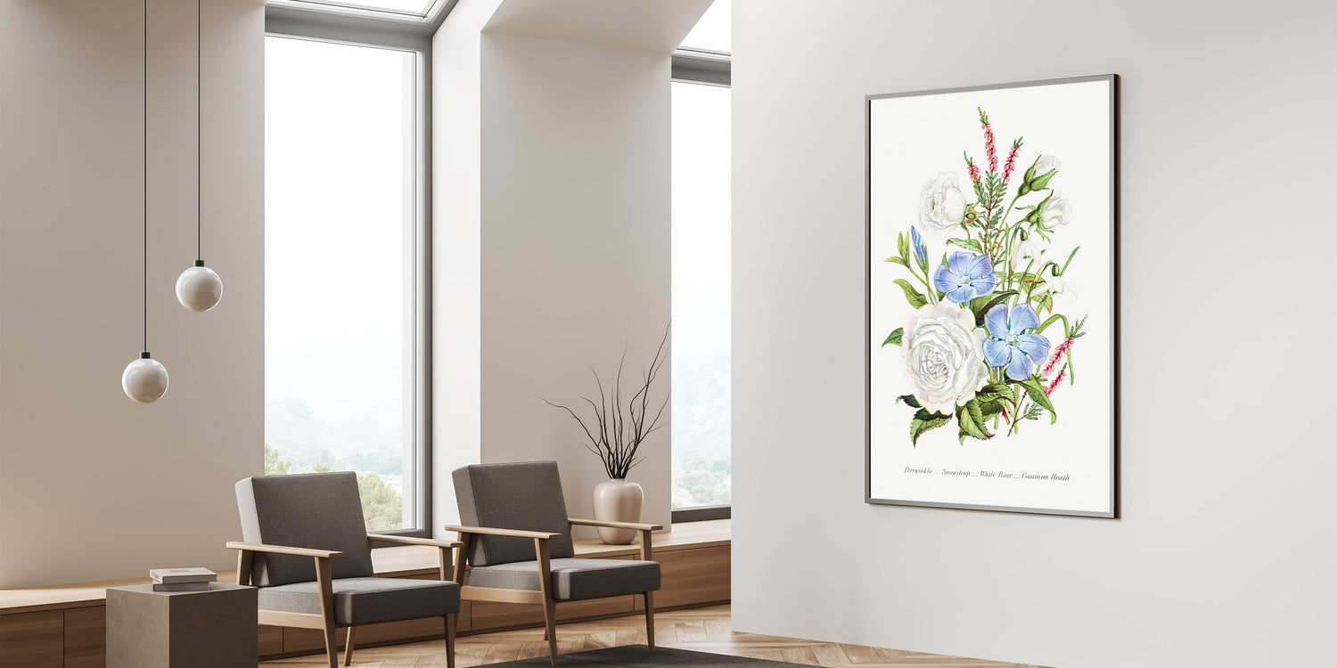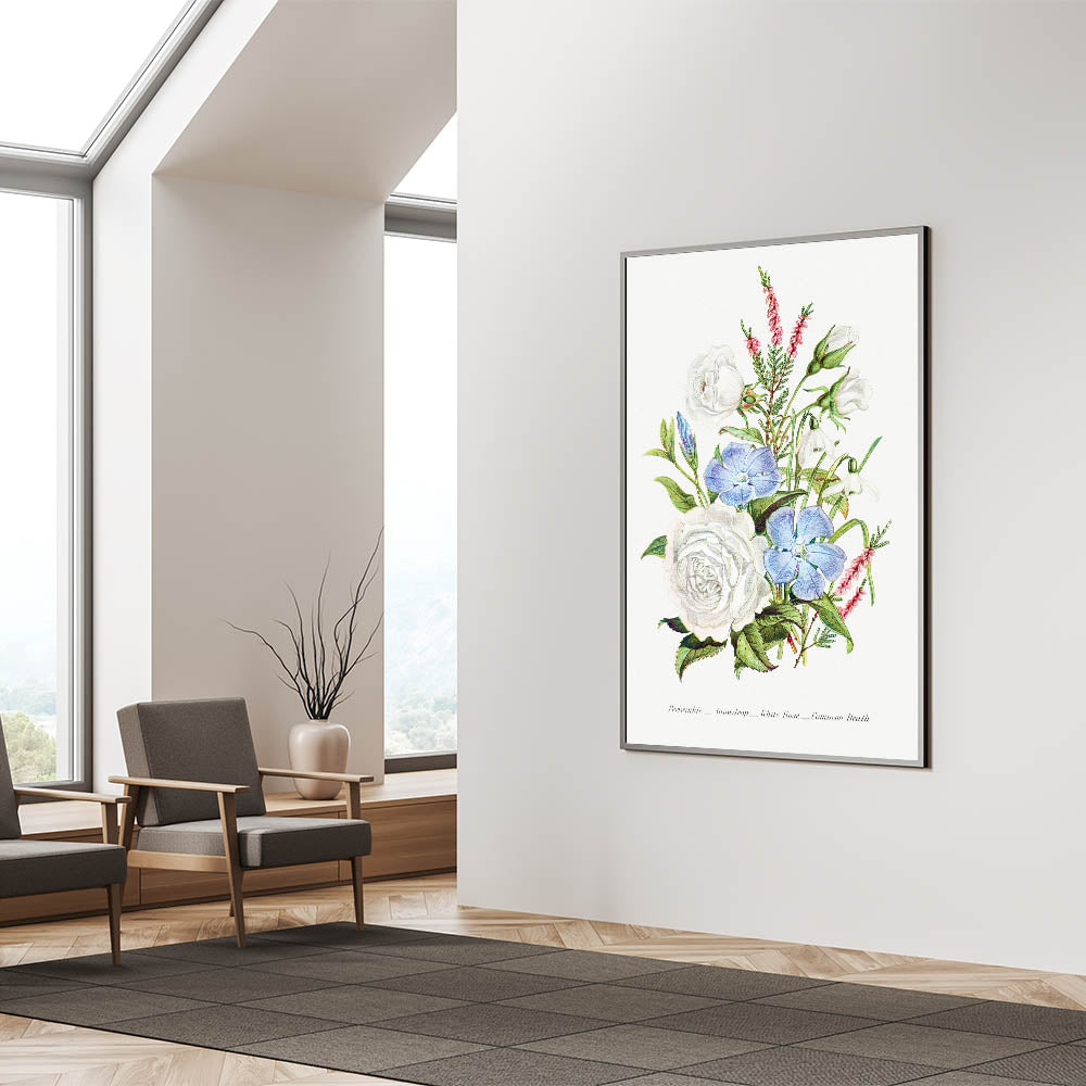 Celebrate the timeless beauty of Romanticism style wall art with this enchanting floral illustration featuring Periwinkle, Snowdrop, White Rose, and Common Heath, originally from The Language of Flowers by Robert Tyas (1896). This artwork captures the symbolic meaning of flowers, a hallmark of the classic art of the Romantic era, combining meticulous detail with vibrant colors to create an elegant and uplifting composition.