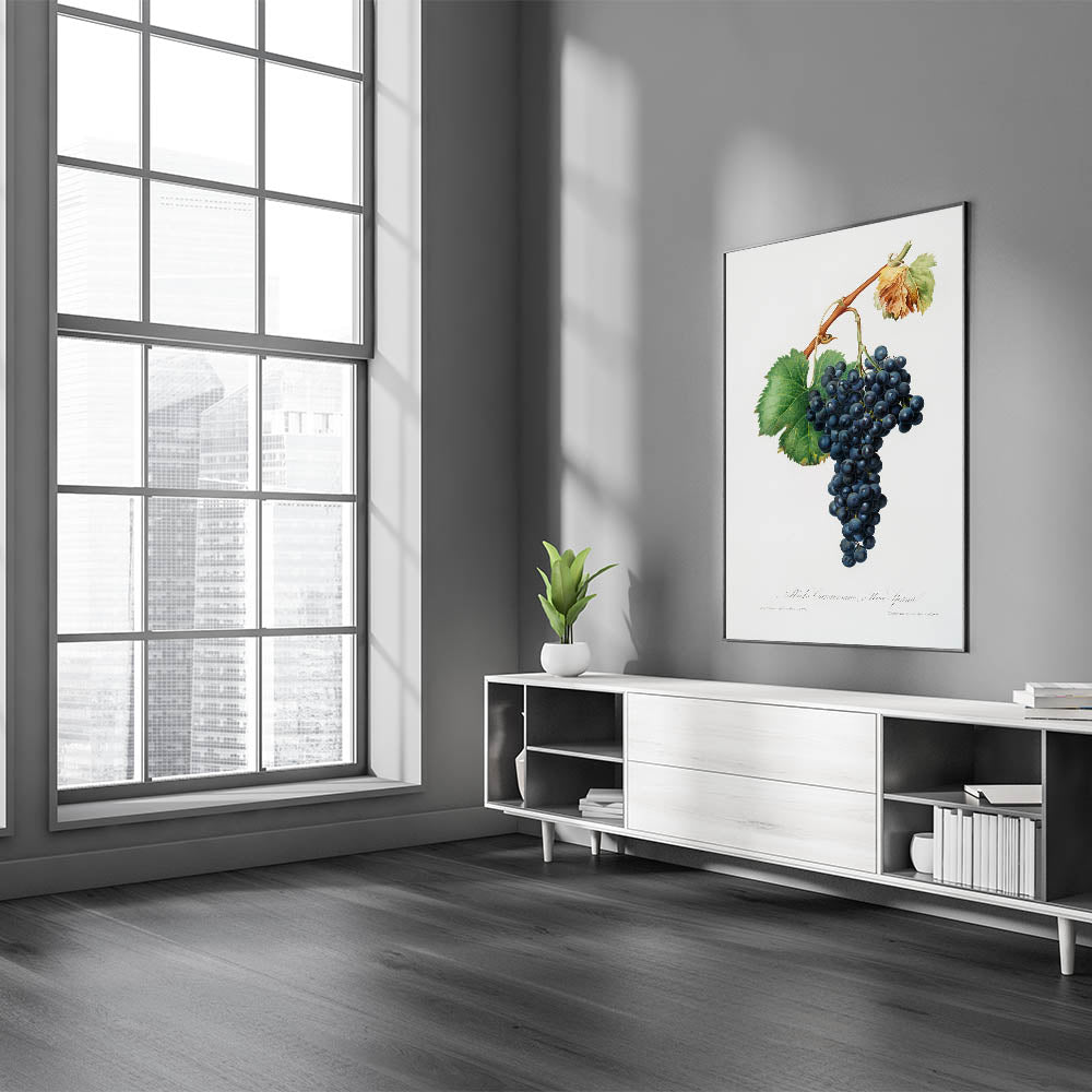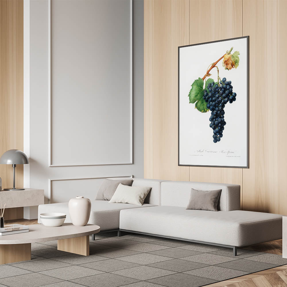 This exquisite botanical artwork showcases the Grape Spanna (Vitis vinifera Pedemontana), a timeless symbol of nature's bounty. Rendered with meticulous attention to detail, the illustration captures the richness of the deep blue grapes and the vibrant green leaves, blending artistic elegance with scientific precision. This piece embodies the Romanticism style’s admiration for natural beauty and botanical art, making it a perfect addition to any home or workspace.